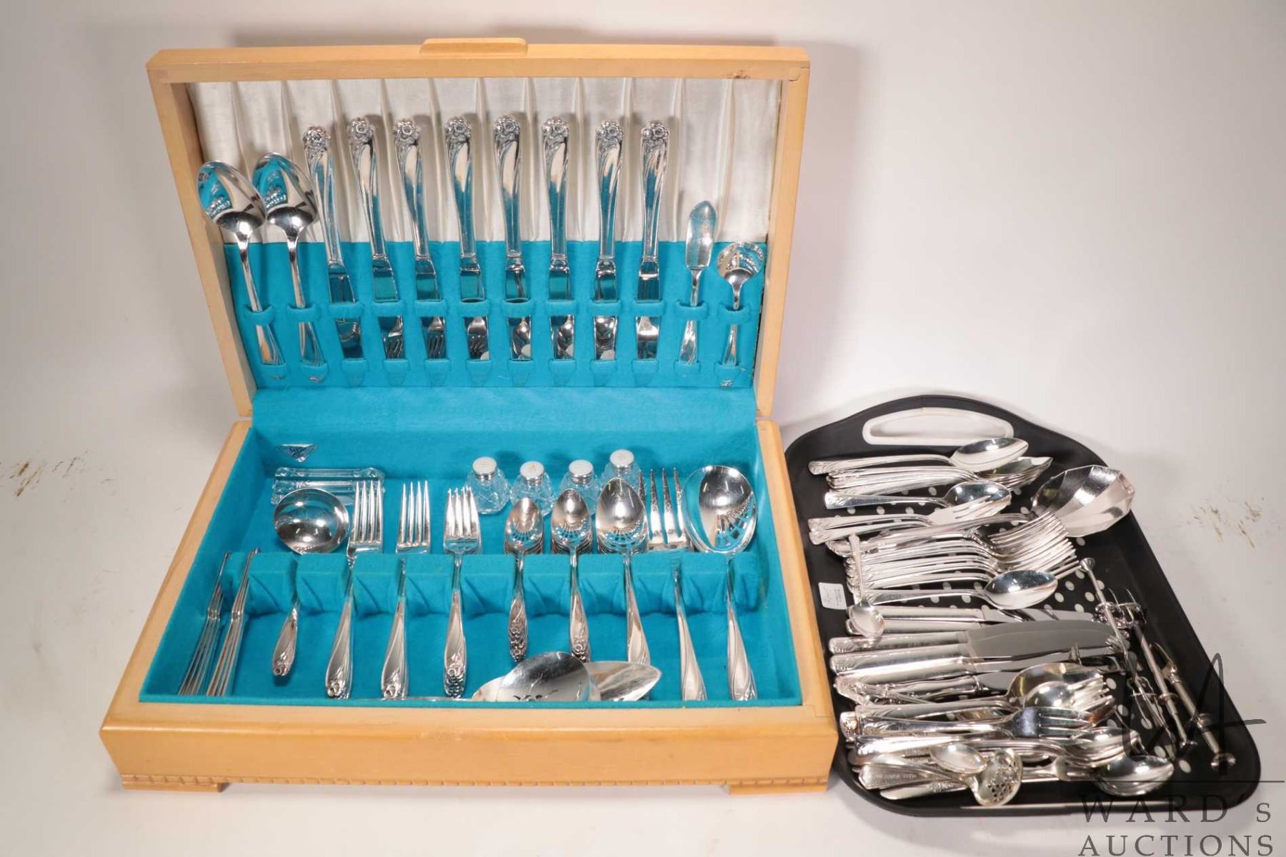Canteen containing a large selection of Rogers Bros. Daffodil silver-plate flatware plus crystal knife rests and shakers and a selection of Sincerity silver plate flatware etc.