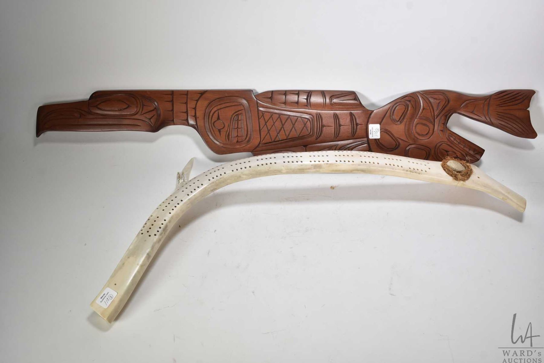 Caribou horn cribbage board 26" in length and a carved wall hanging and labelled on verso "Raven, Wild Man, Killer Whale, Jim Yelton, Coast Salish" 35"