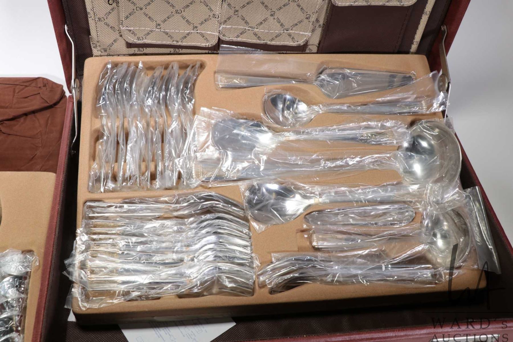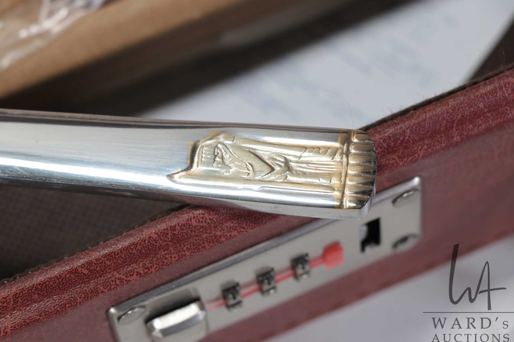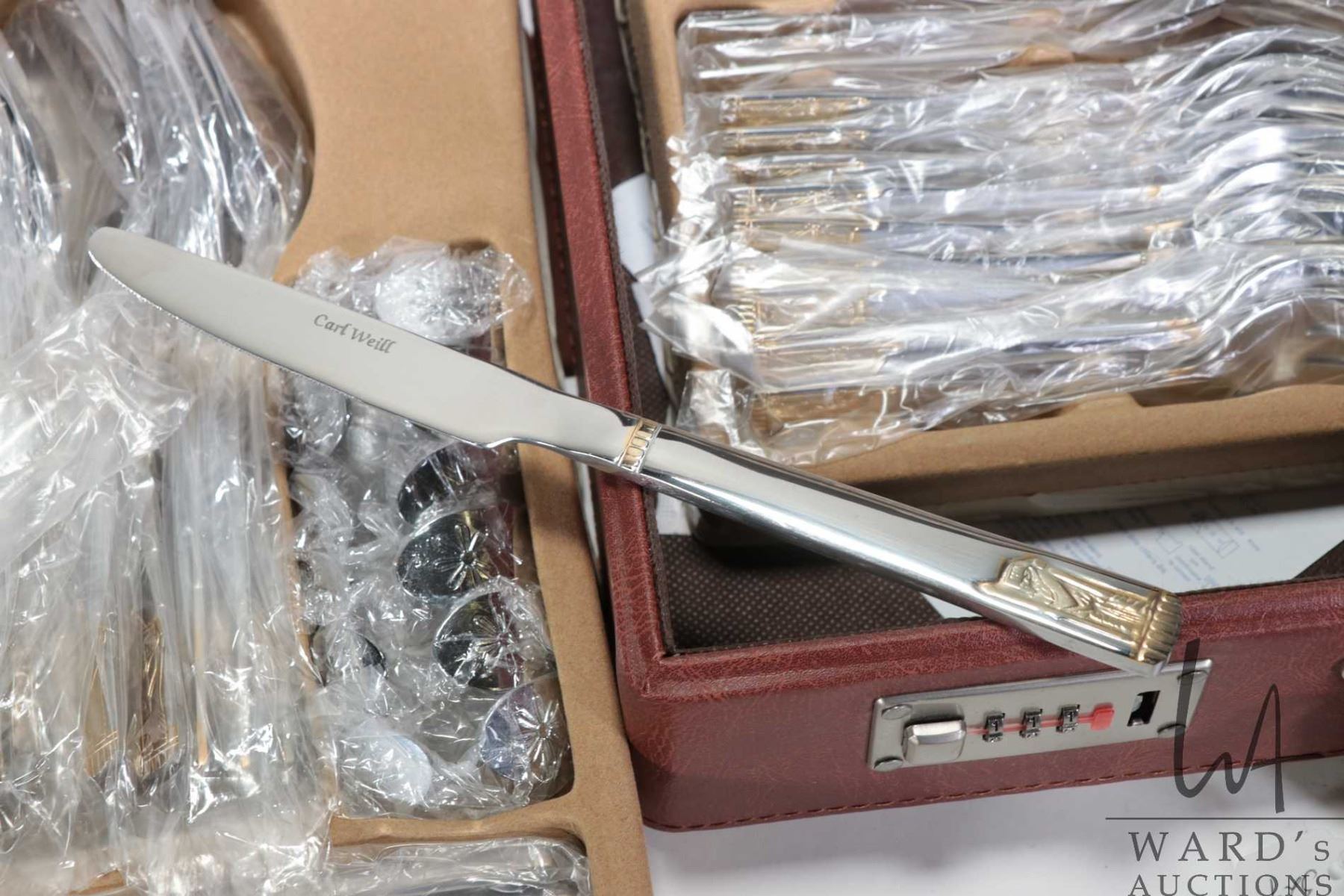 Carl Weill seventy eight pieces set of Iranian Gold flatware in brief case style box, appears unused