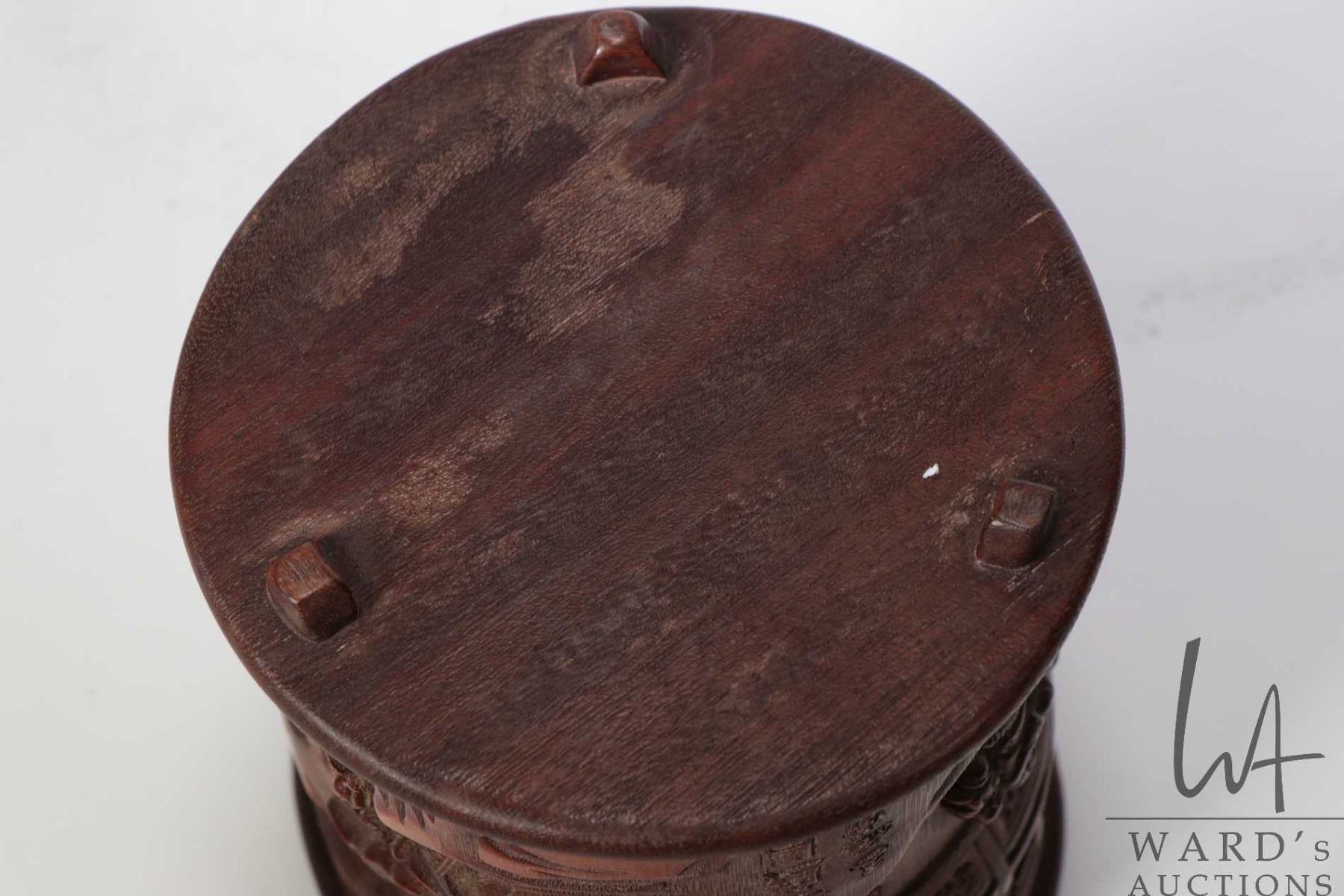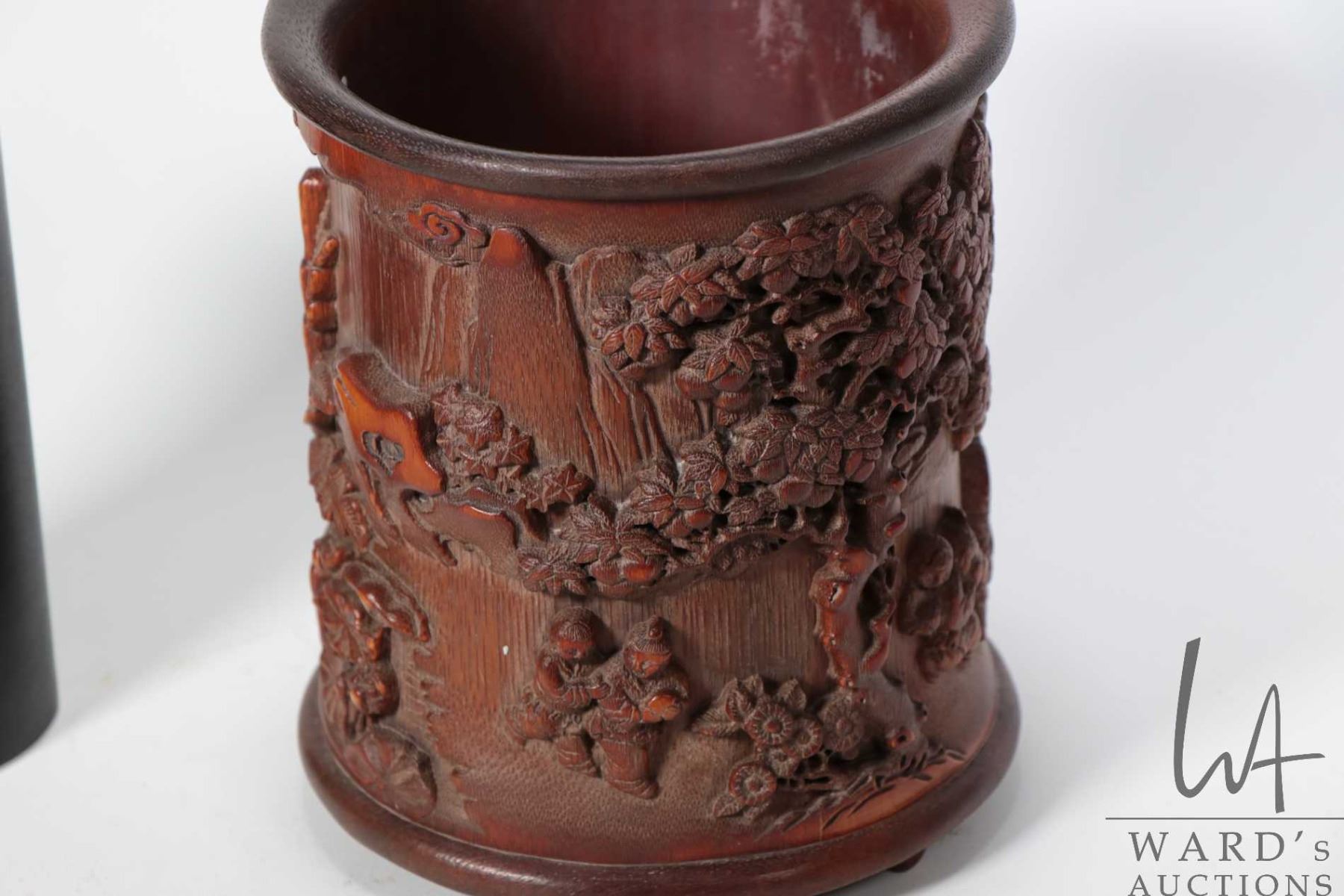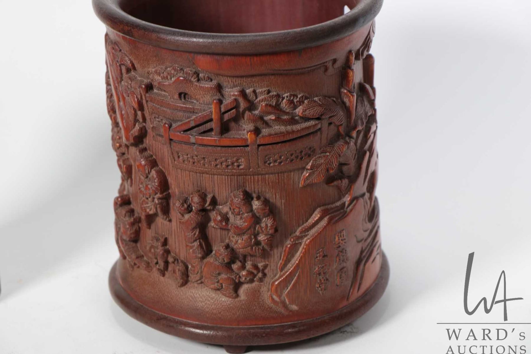 Carved bamboo "Childhood Fun" brush pot, purportedly 19th century, 6 1/2" in height
