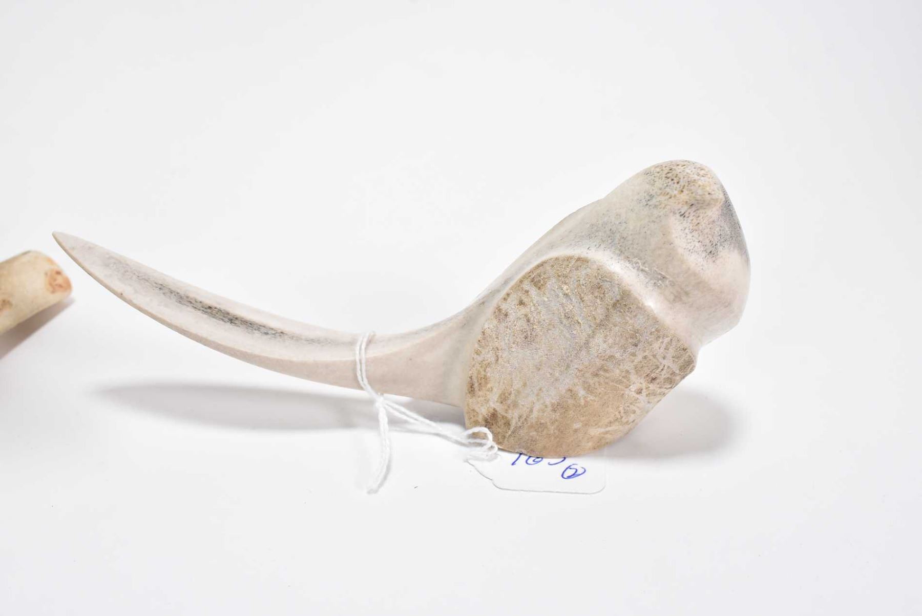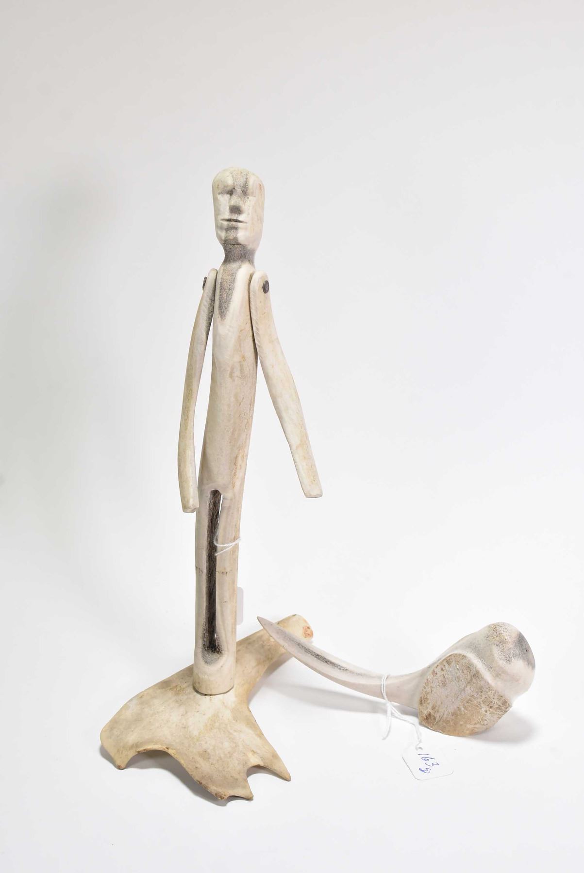 Carved bone articulated sculpture of a male figure 12 1/2" in height and a carved bone bird signed by artist