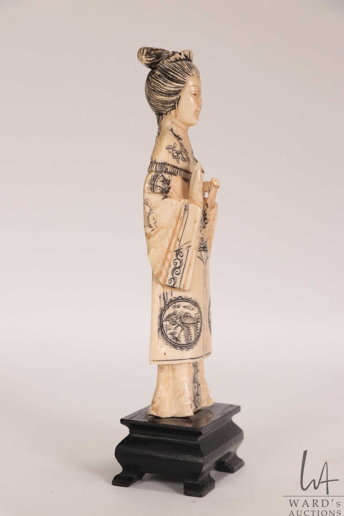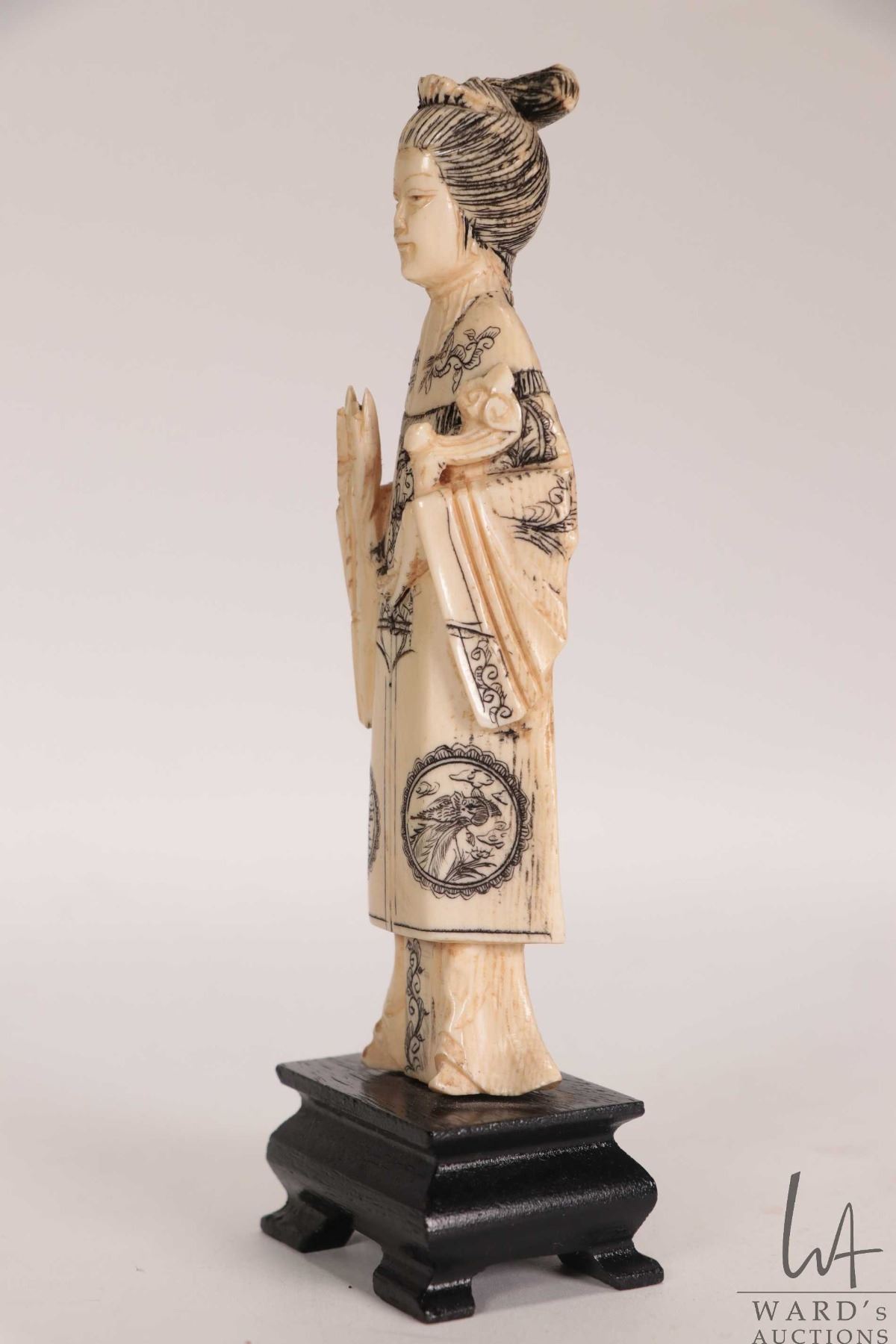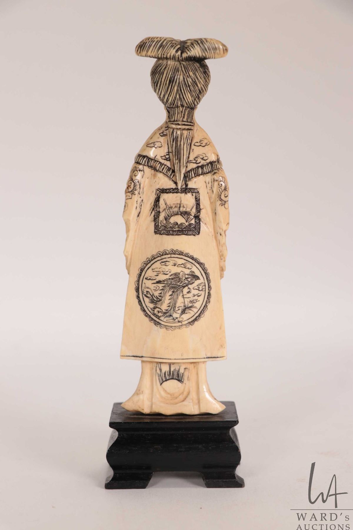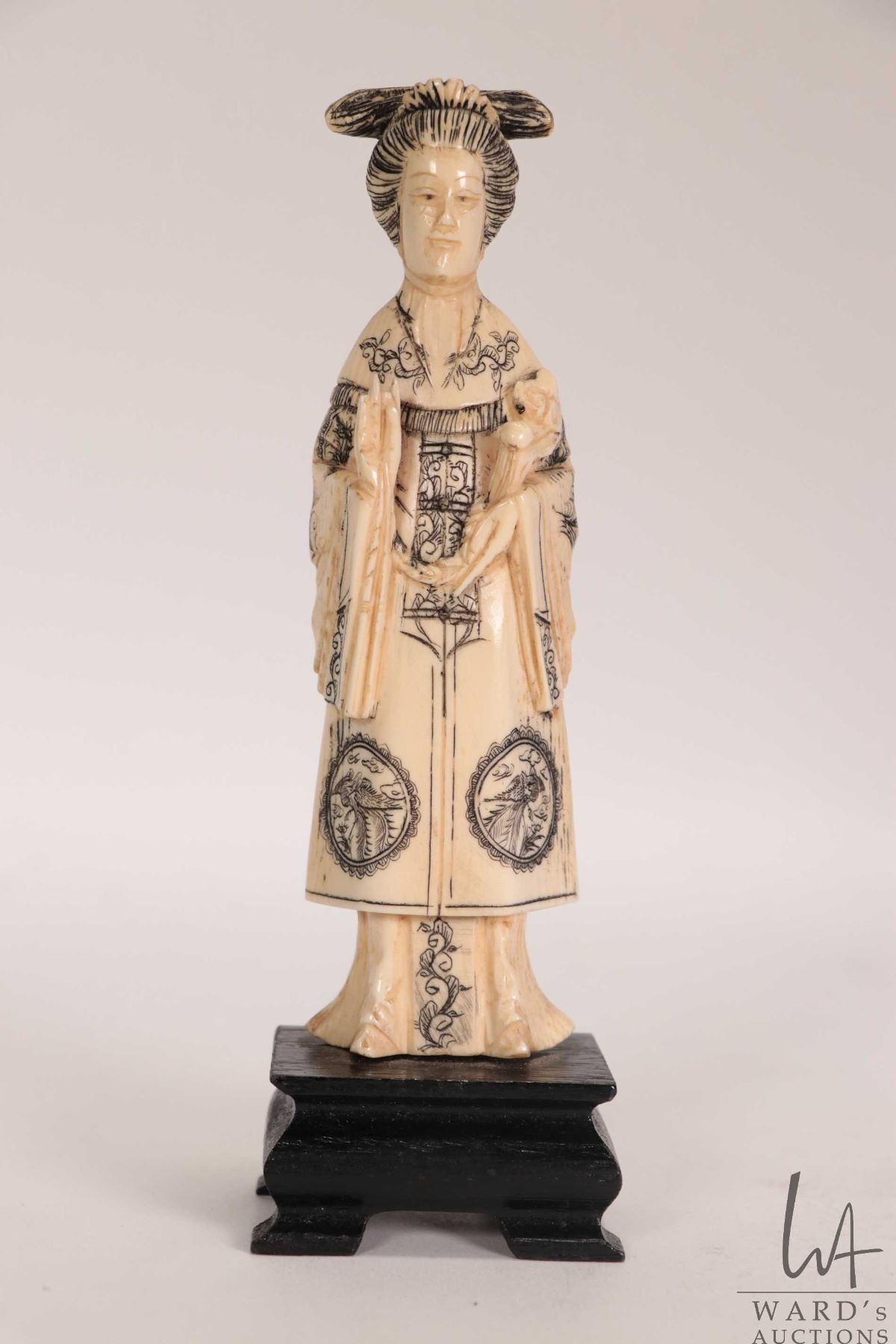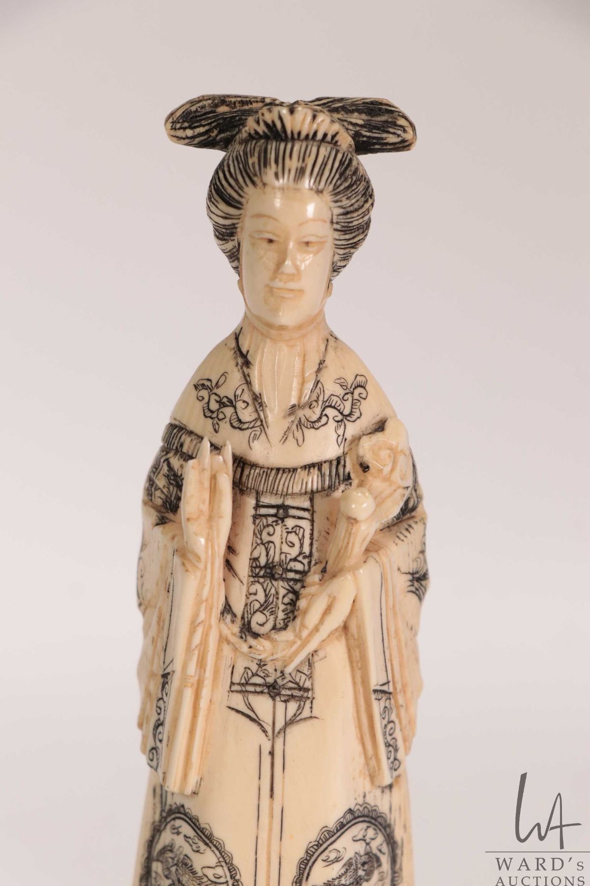 Carved ivory figure of a woman in decorative scrimshaw Imperial dress, 5" in height. Can not be ship