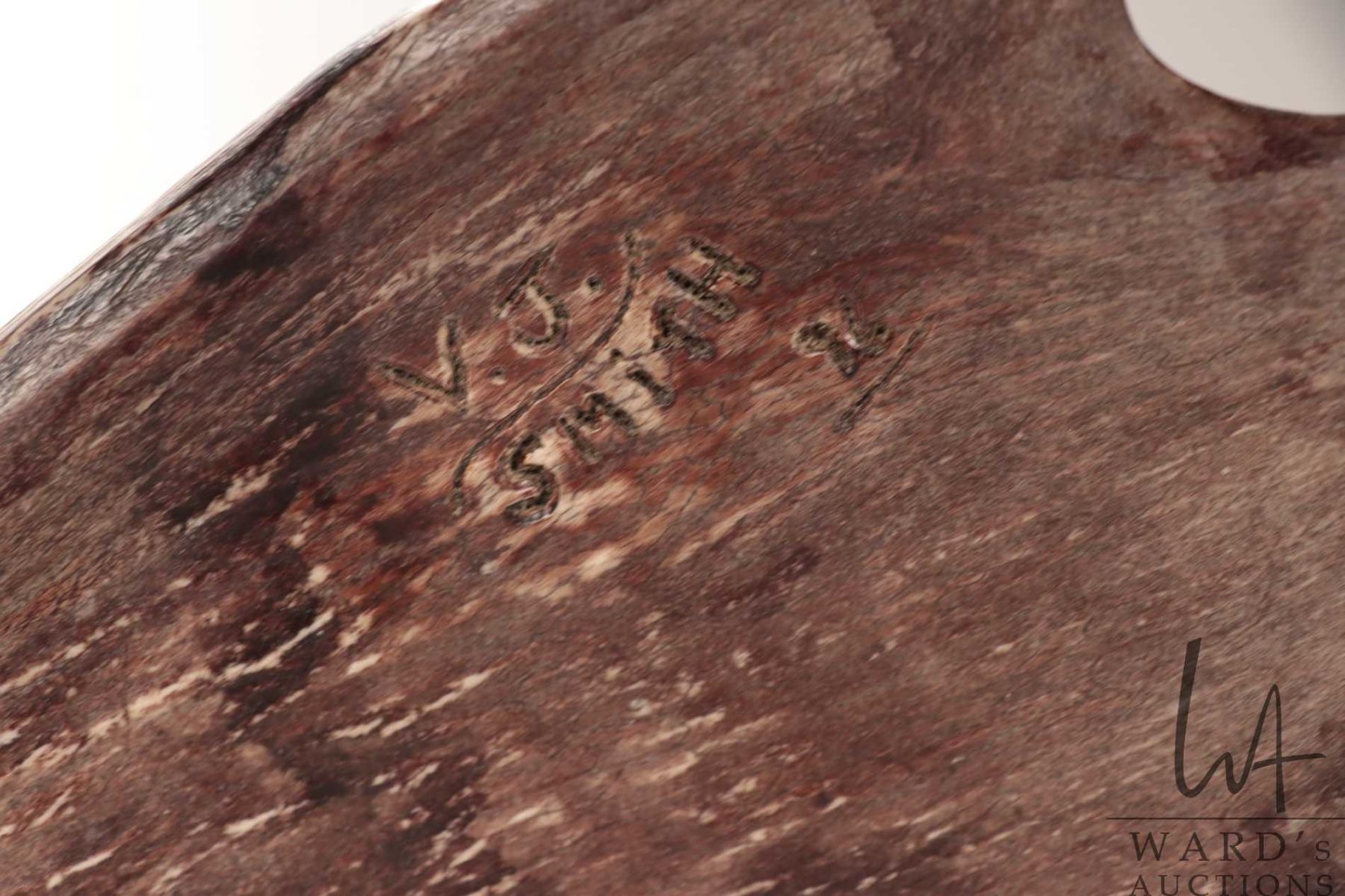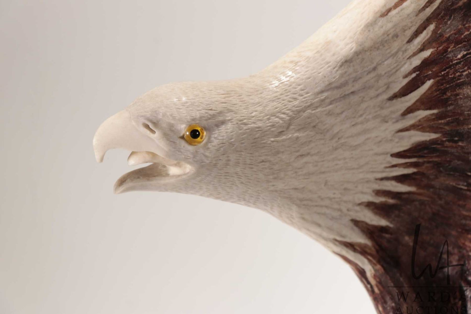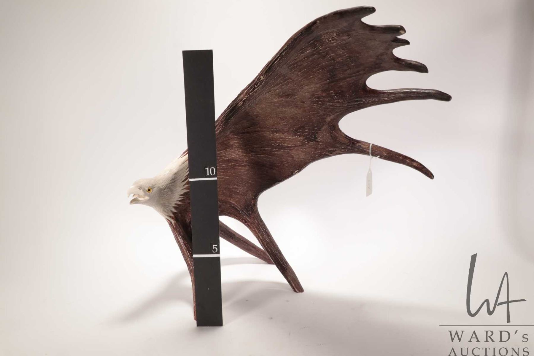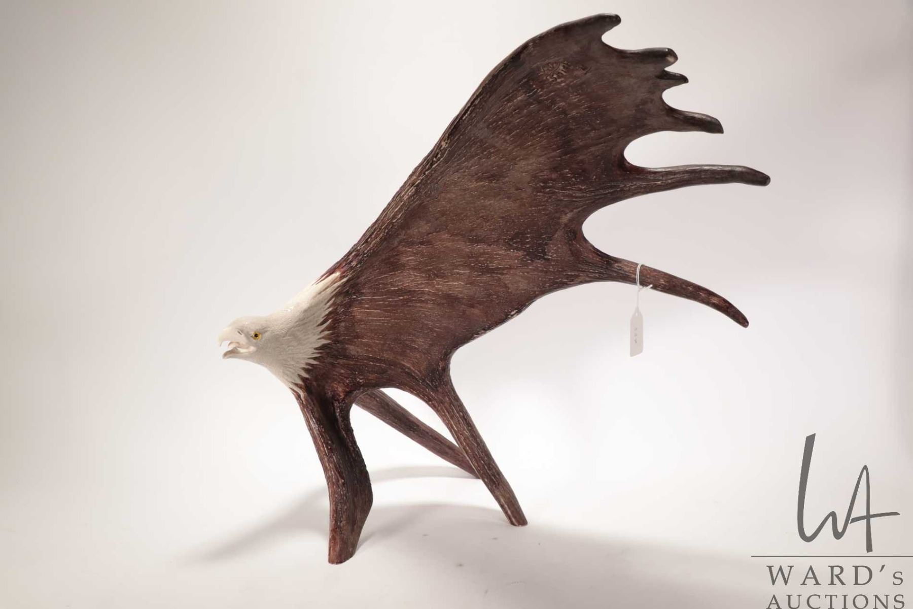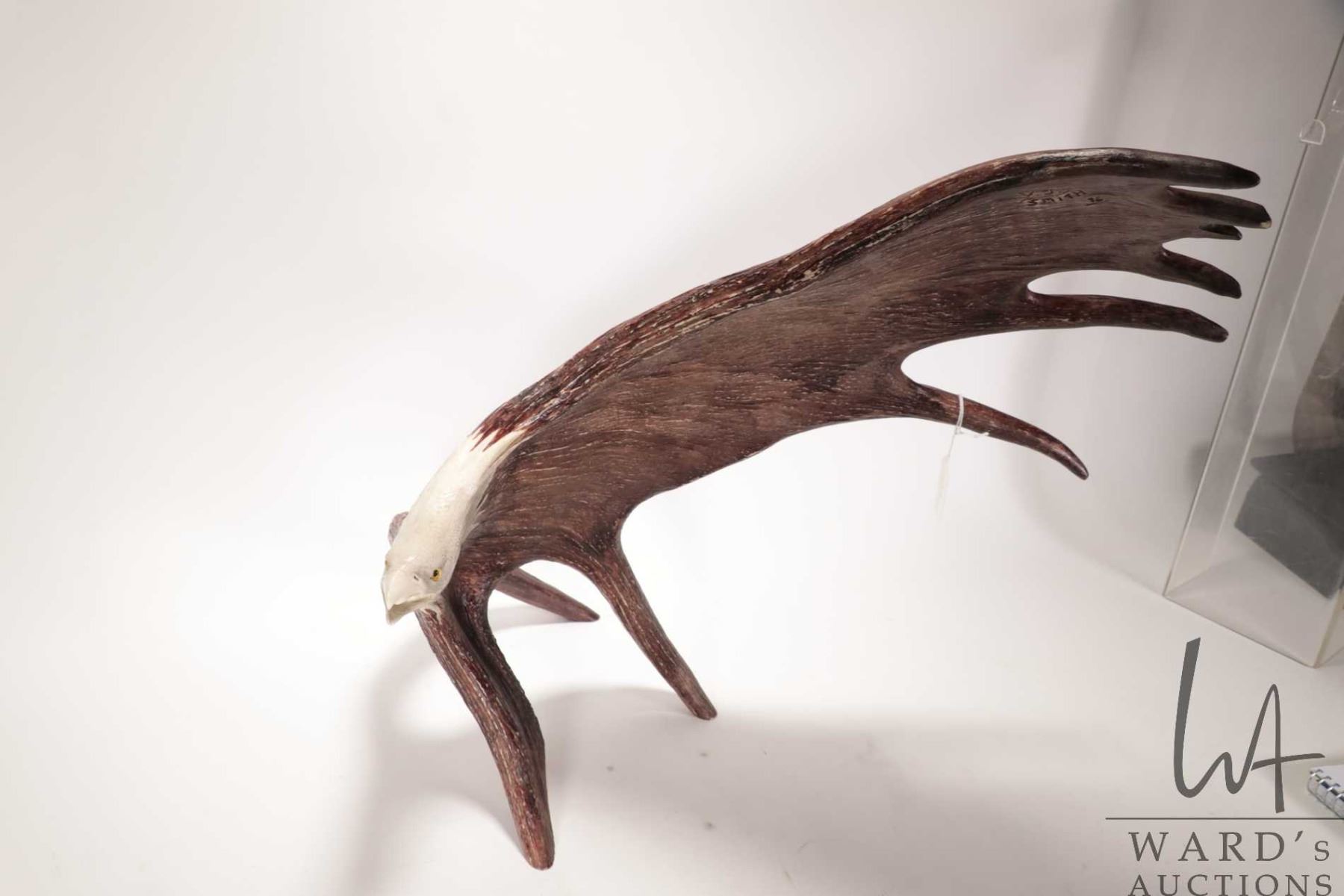 Carved moose antler with the image of a bald eagle signed by artist V.J. Smith '96, 20" in height