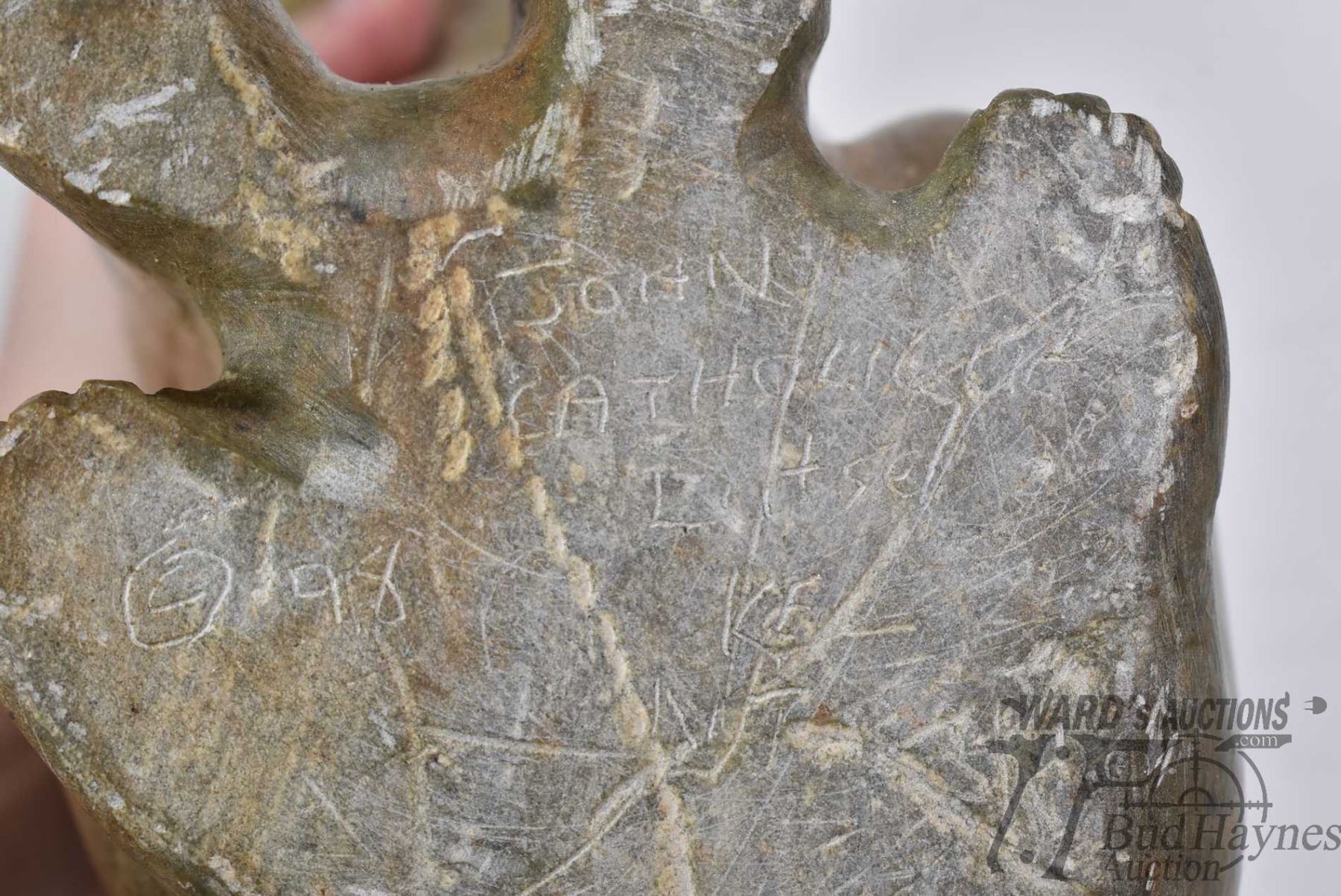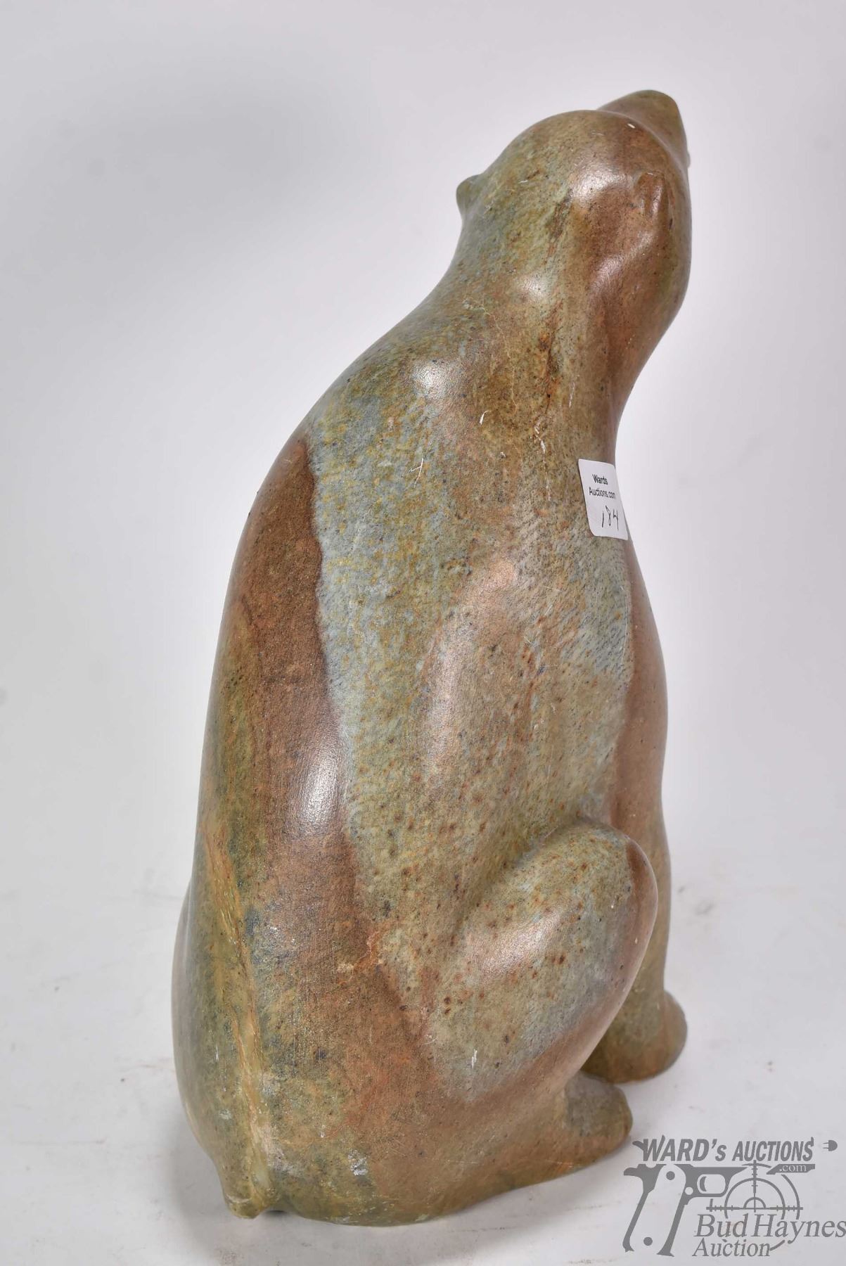 Carved soapstone bear signed by Inuit artist John Catholique, 10 1/2" in height