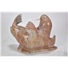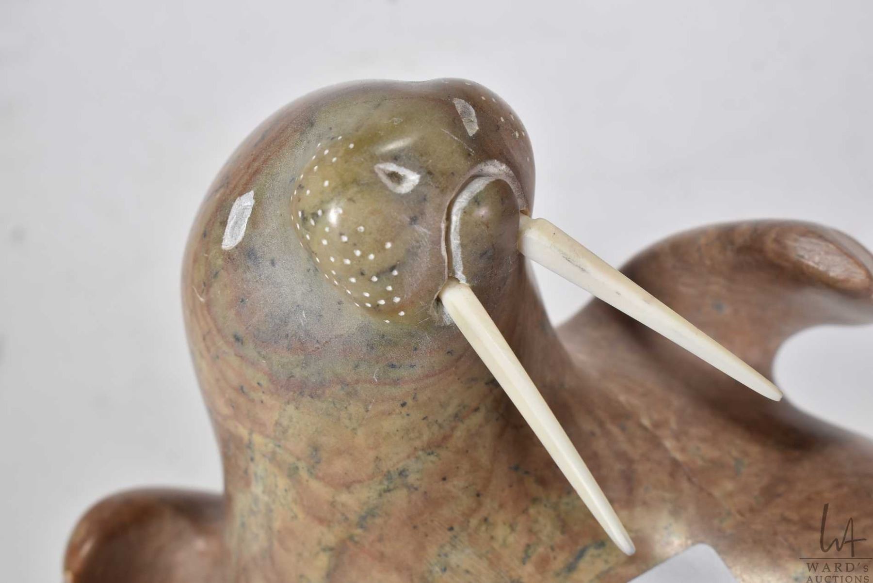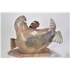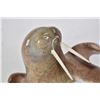 Carved soapstone reclining walrus signed by artist August Poitras '91, 7 1/2" in height and 10" in length, note chip on rear foot