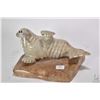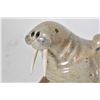 Carved soapstone walrus reclining on a rock signed by artist Malle '89, 9 1/2" in length