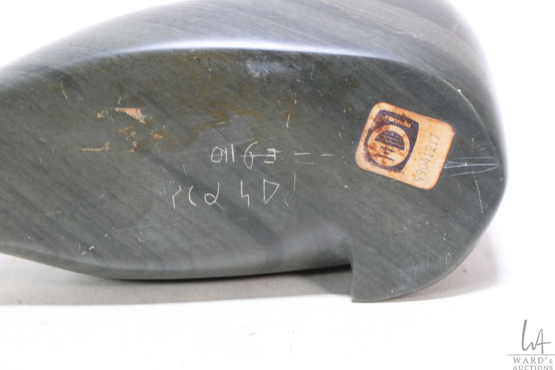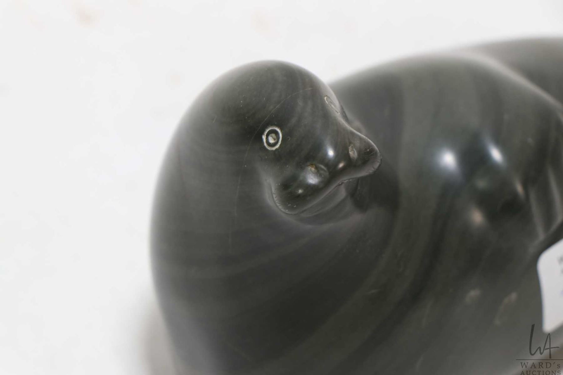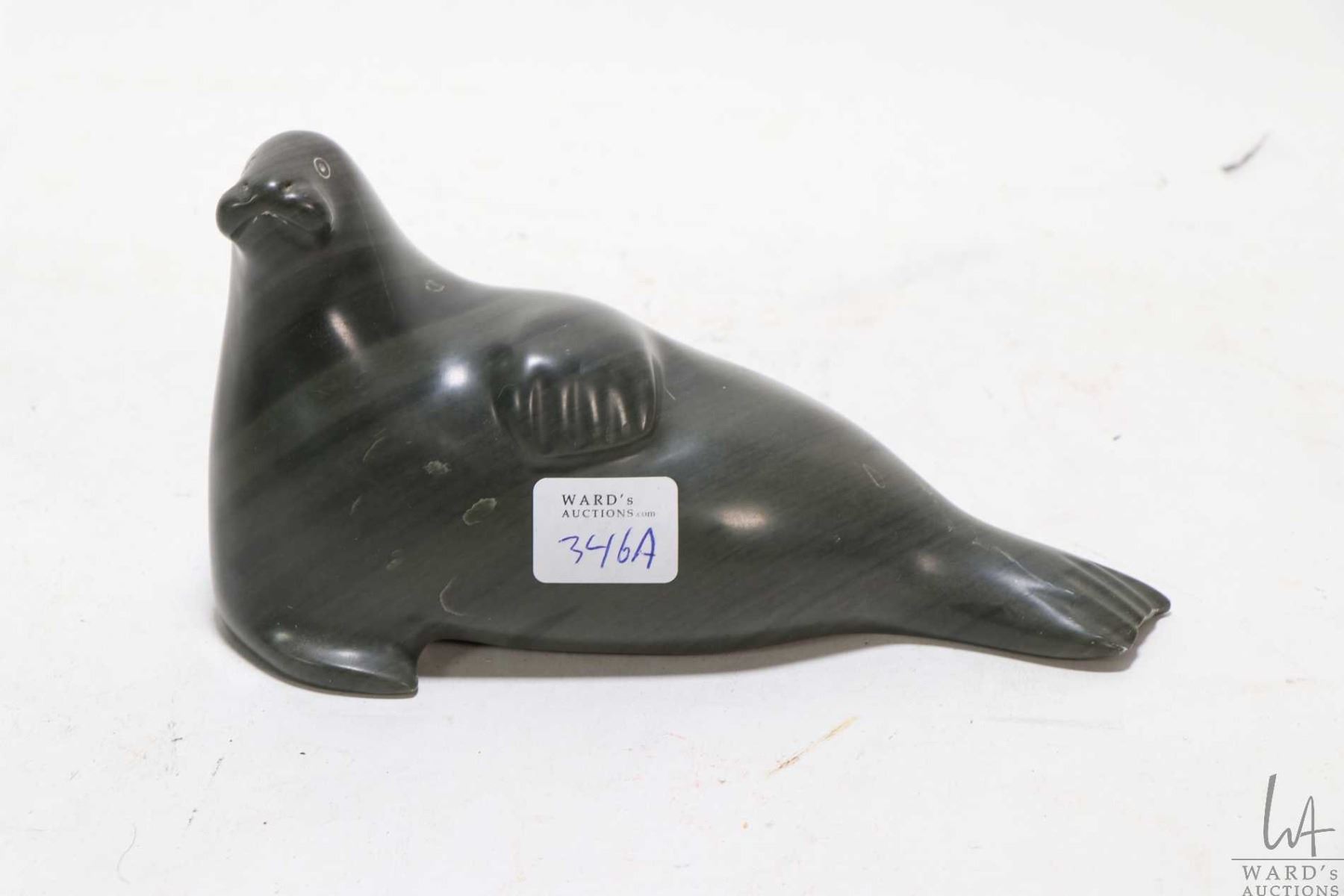Carved soapstone walrus signed in syllabics and Canada tag on base, 7" in length