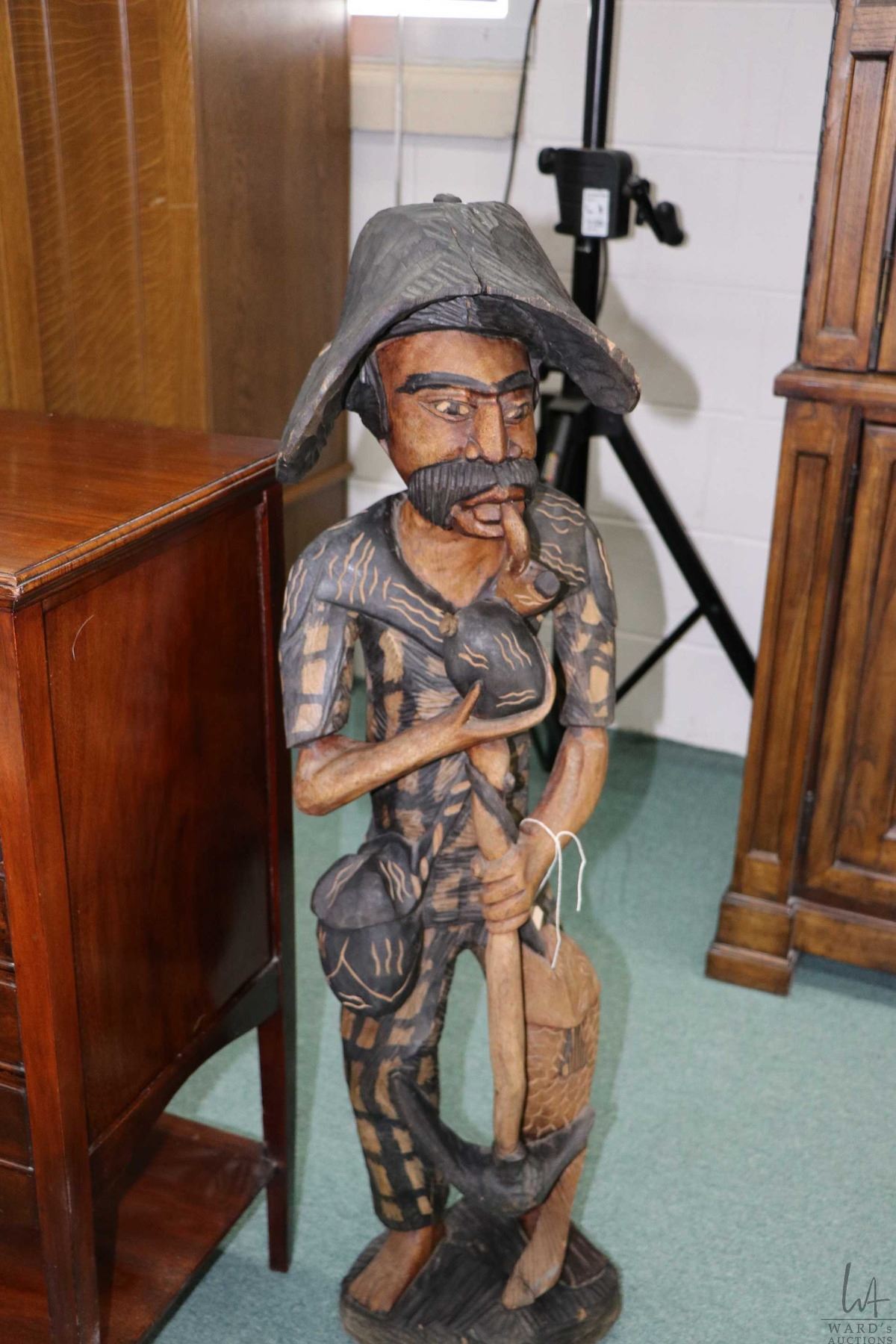 Carved wooden fisherman 41" in height, see photos for assorted cracks and character (flaws) etc.