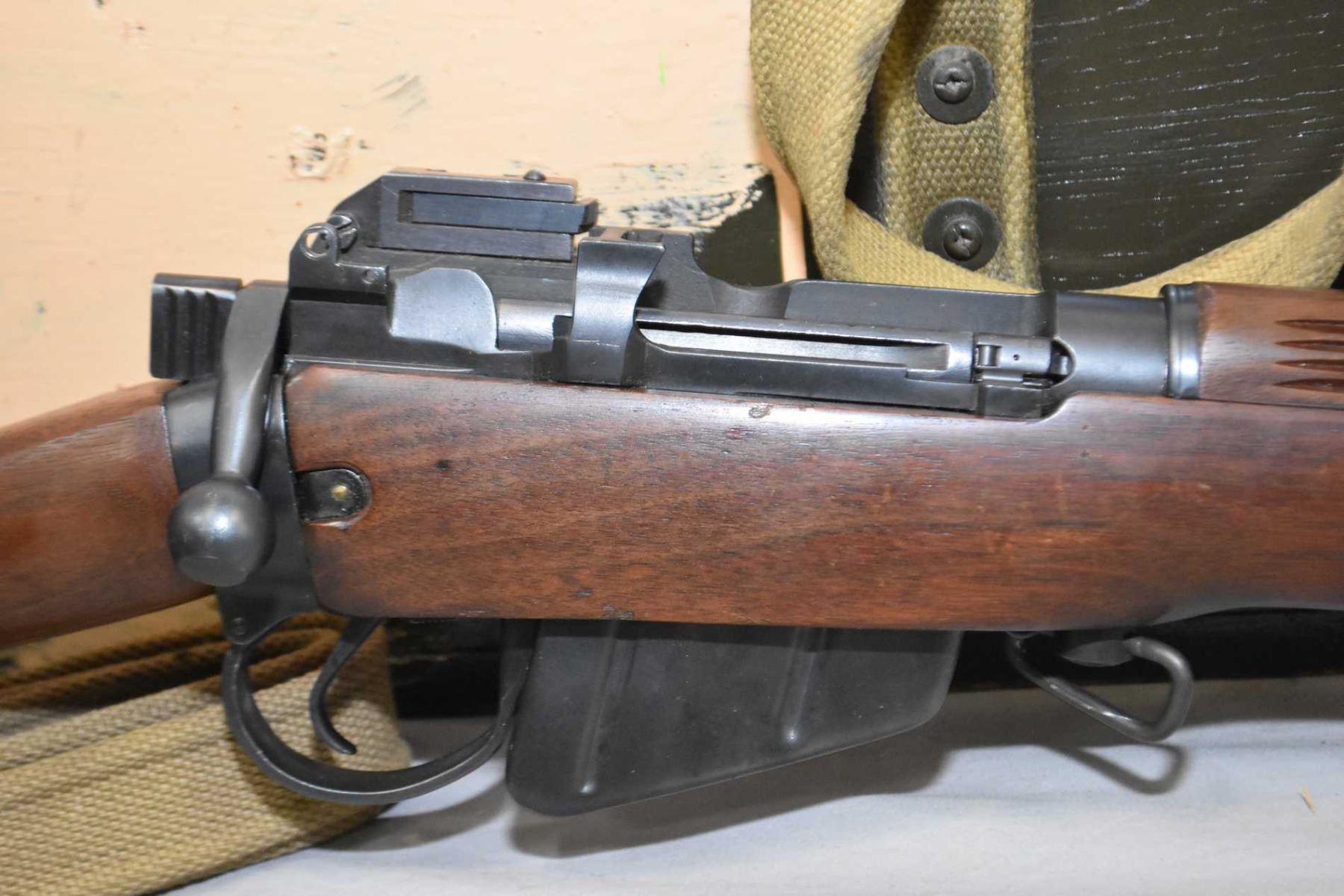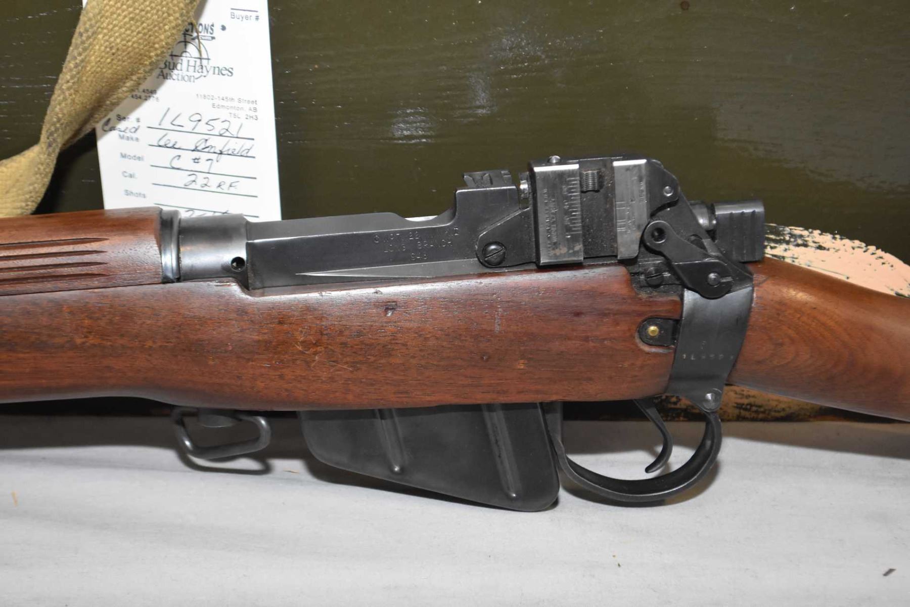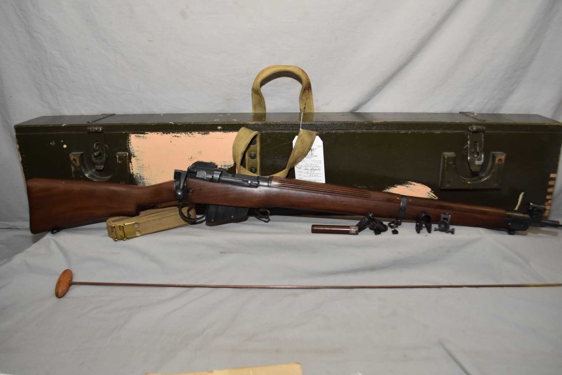 Cased Lee Enfield C # 7 22 In. Mark 1 Canadian Long Branch Dated 1946 .22 RF Full Wood Military Training Rifle w/ 25 1/4" bbl [ all matching numbers that match to the original wooden issue box, w/ cleaning rod, target sights, with part of the sights in the original box with the web sling, oil bottle, Appears never issued and possibly only factory test fired ] Ser # 1L9521