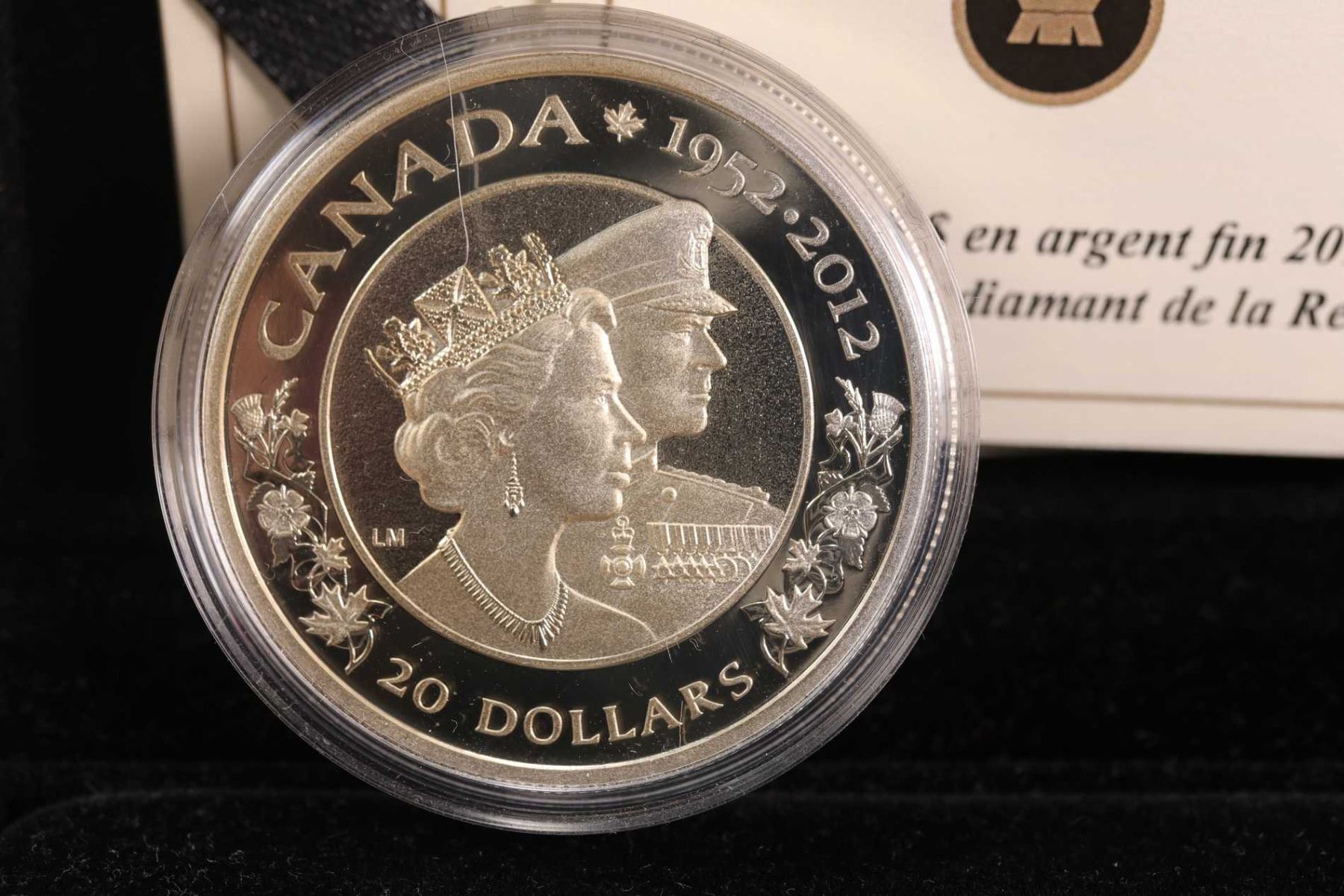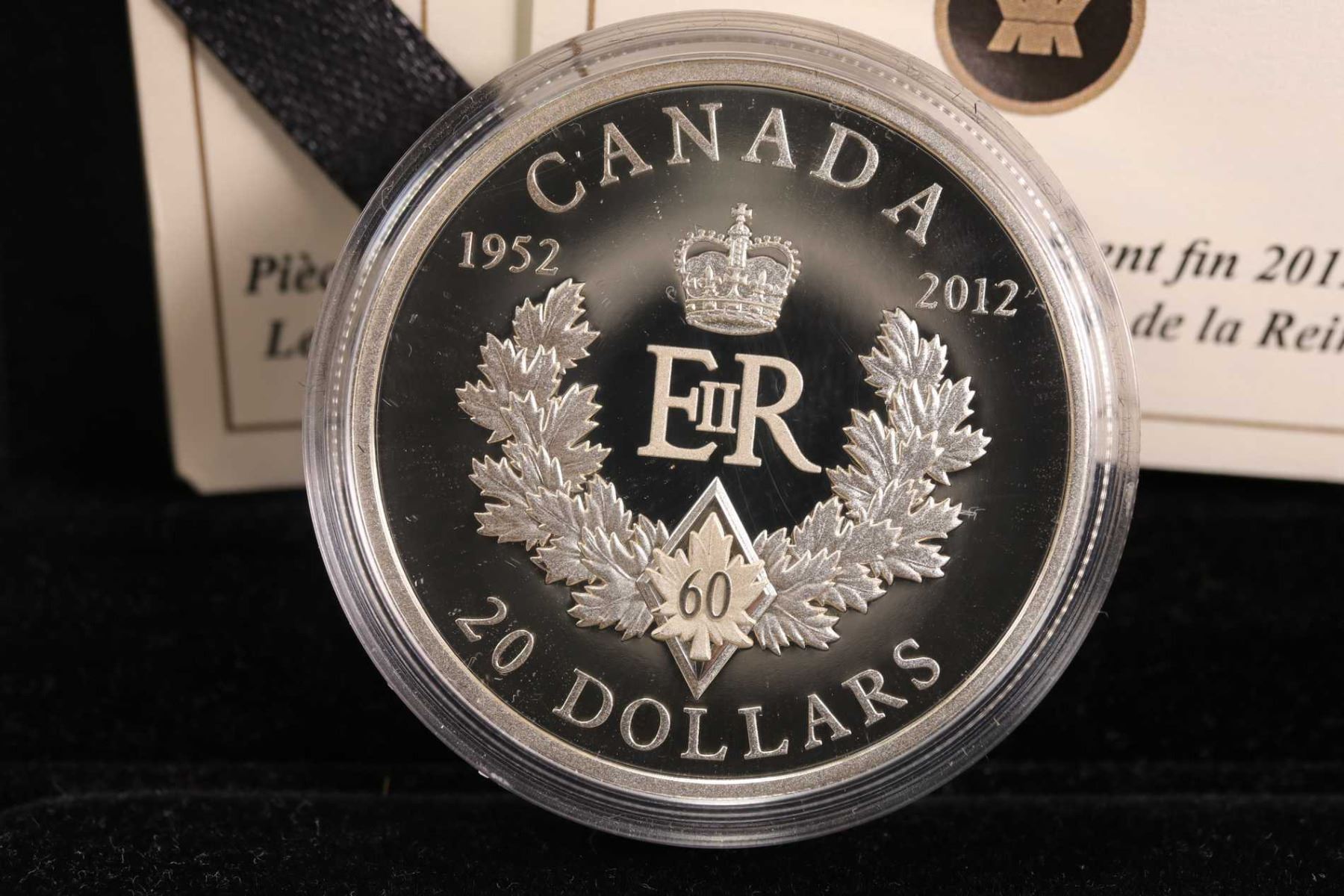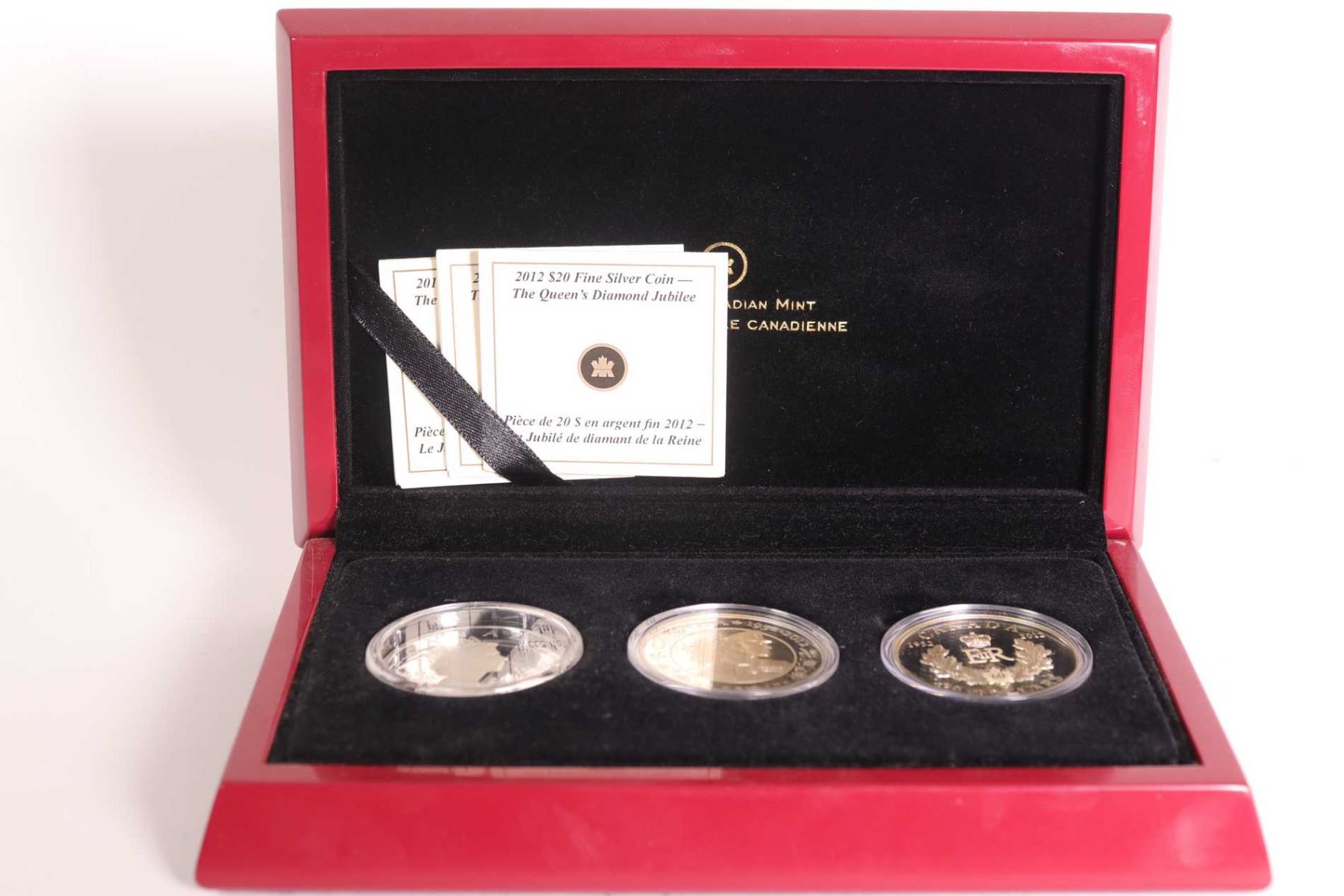 Cased Royal Canadian Mint coin collector The Queen's Diamond Jubilee set of three 2012 $20 fine 99.99% silver coins including "Elizabeth and Phillip: A Reign of Mutual Support and Joint Service", "The Queen's Diamond Jubilee (1952-2012): Celebrating the Royal Cypher" and "The Queen's Diamond Jubilee (1952-2012)". Originally retailed for $ 274.95 CAD
