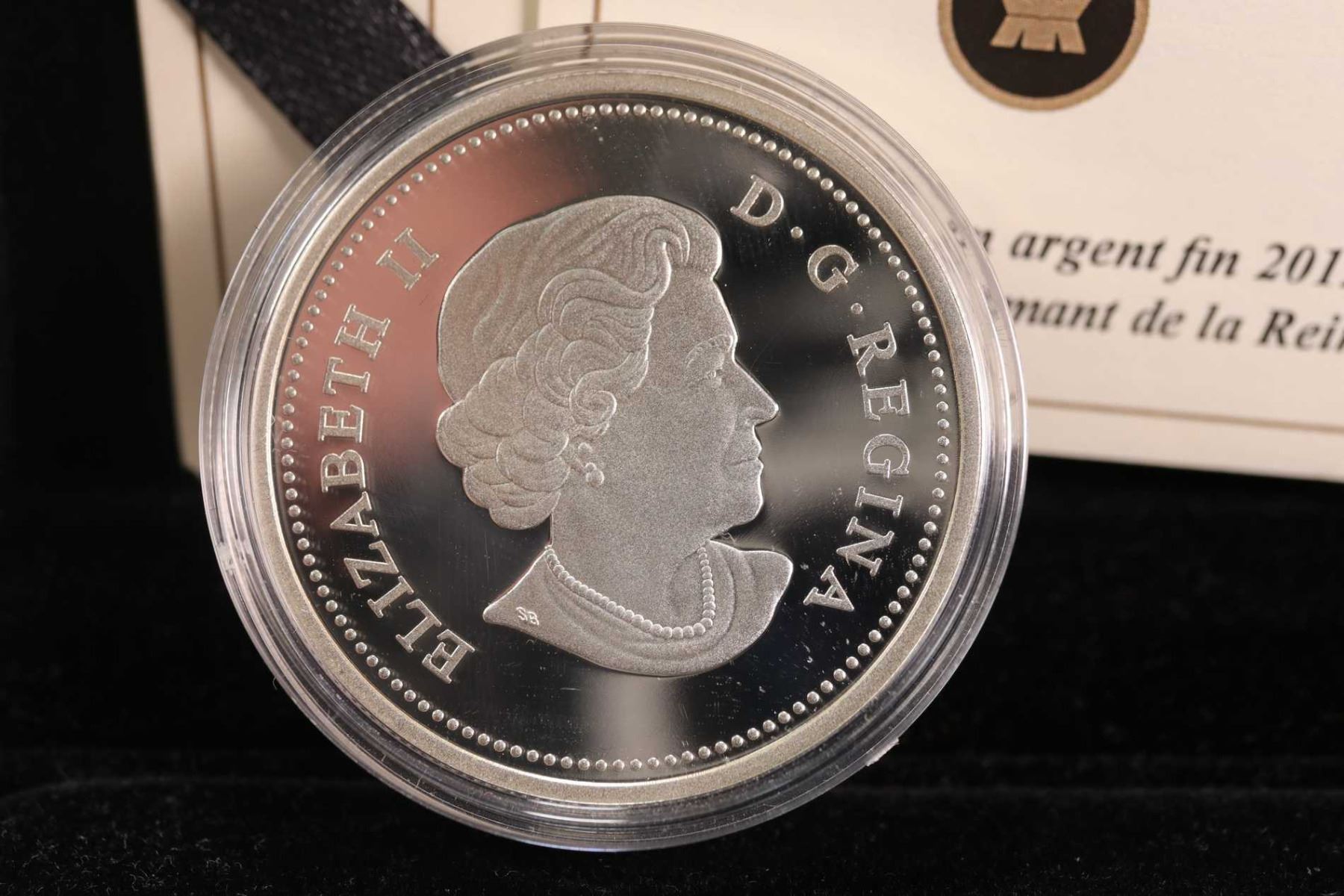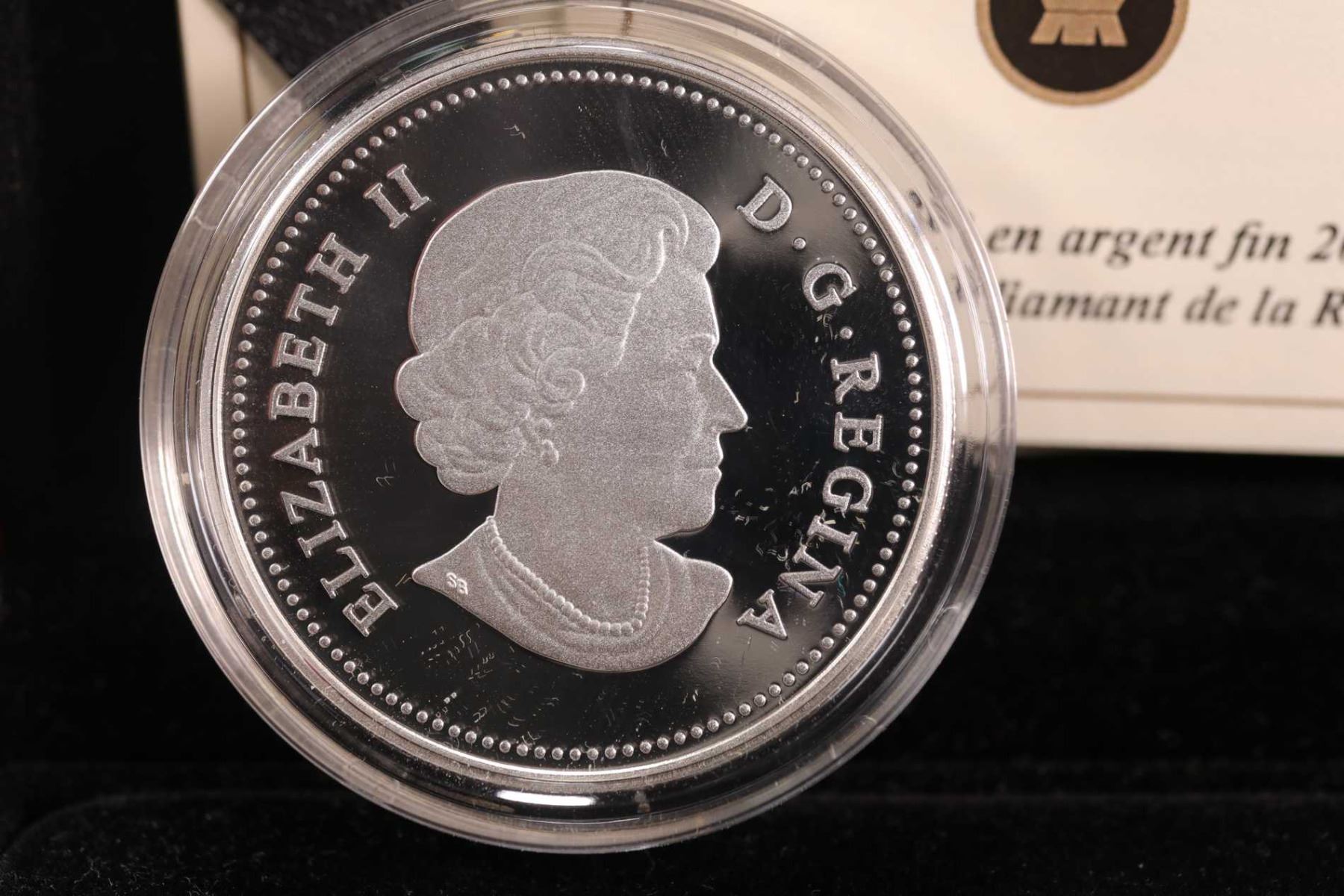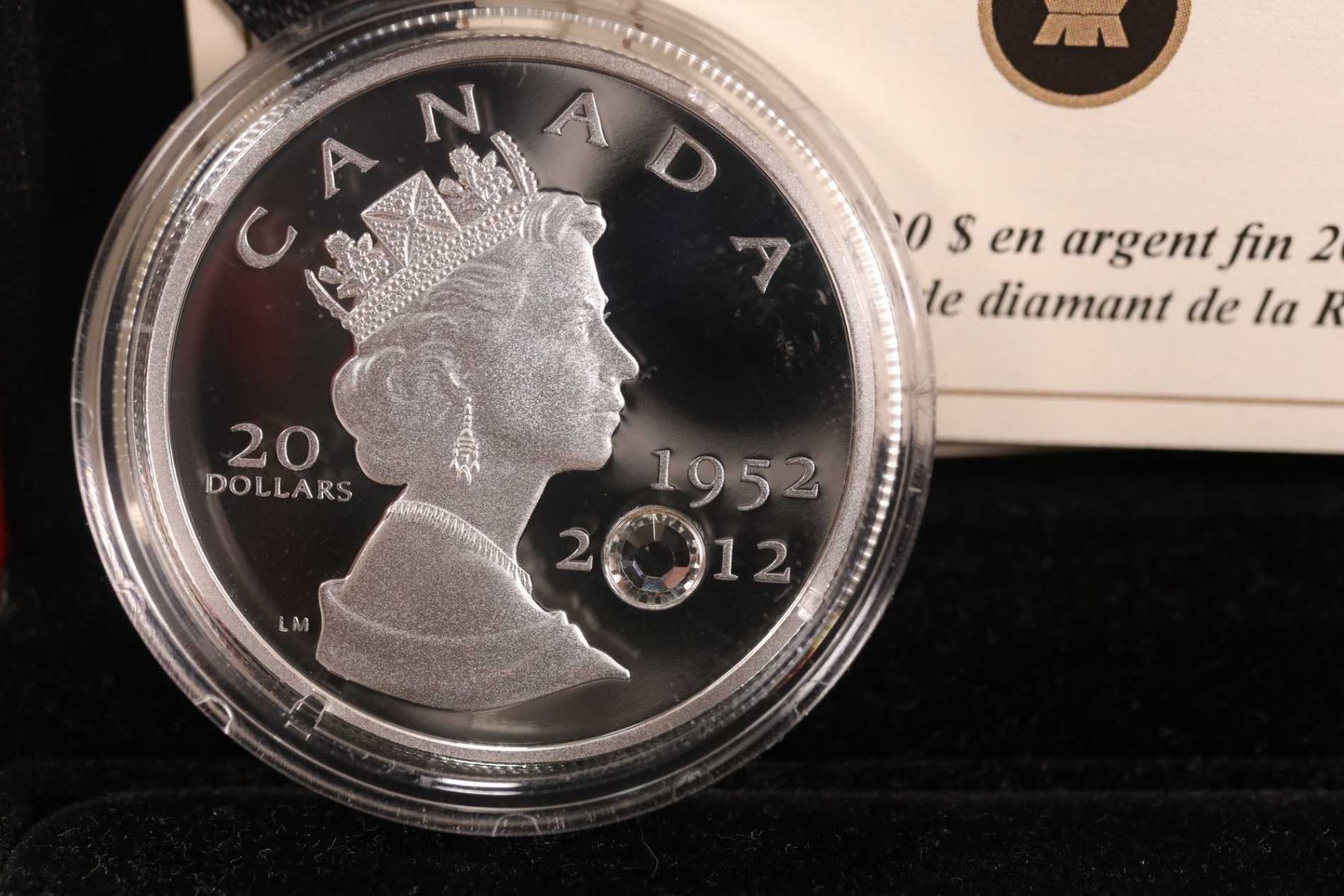 Cased Royal Canadian Mint coin collector The Queen's Diamond Jubilee set of three 2012 $20 fine 99.99% silver coins including "Elizabeth and Phillip: A Reign of Mutual Support and Joint Service", "The Queen's Diamond Jubilee (1952-2012): Celebrating the Royal Cypher" and "The Queen's Diamond Jubilee (1952-2012)". Originally retailed for $ 274.95 CAD
