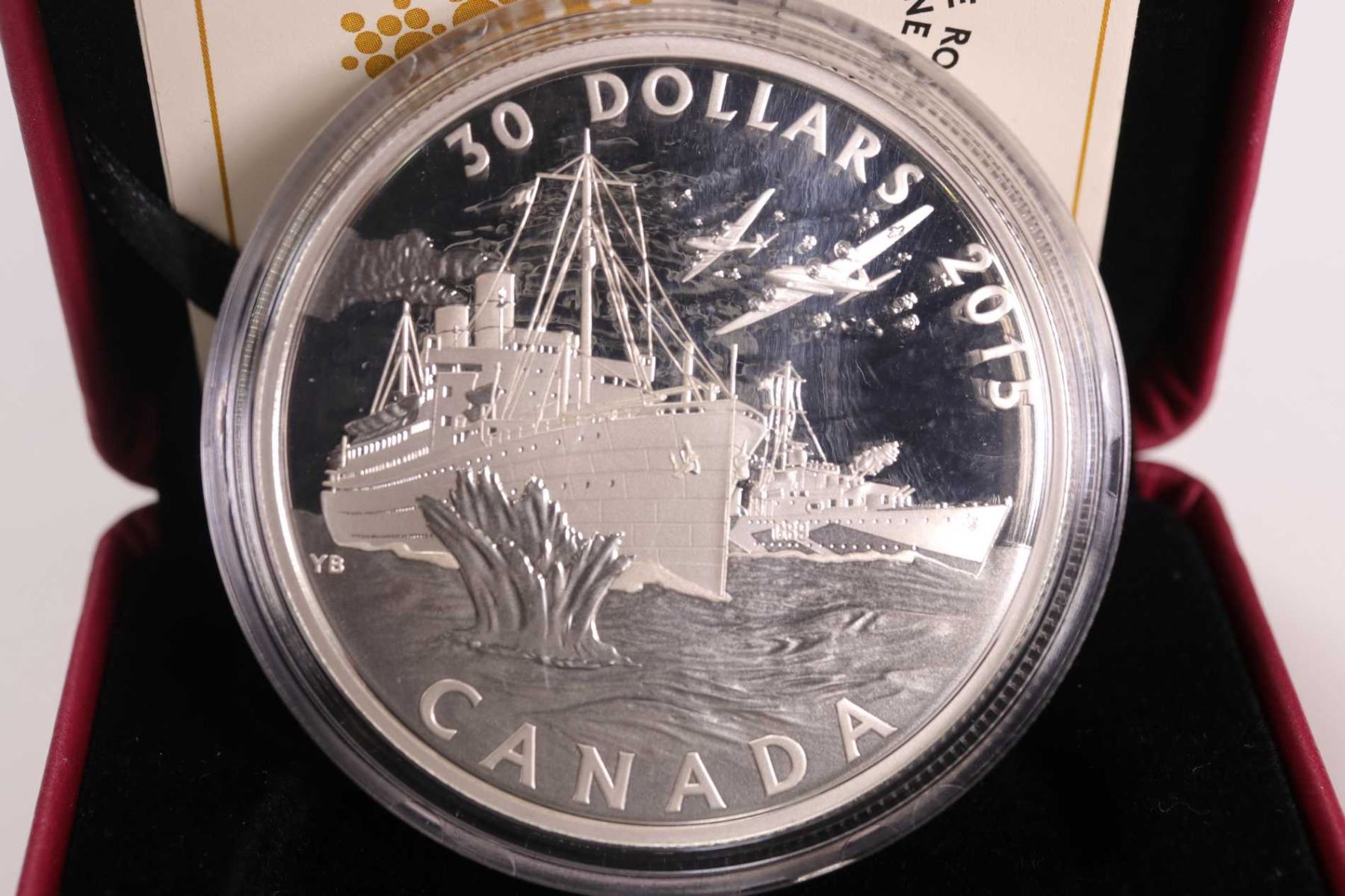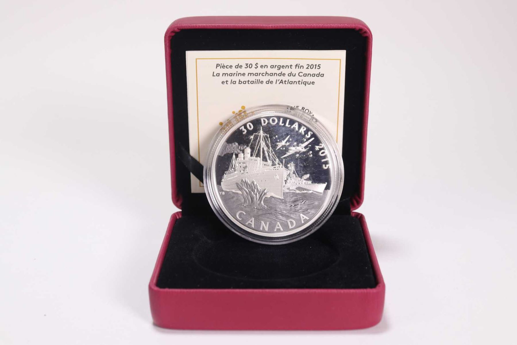 Cased Royal Canadian Mint collector thirty dollar 2015, 62.67 gram .99.99% Fine silver coin "Canada's Merchant Navy in the Battle of the Atlantic"