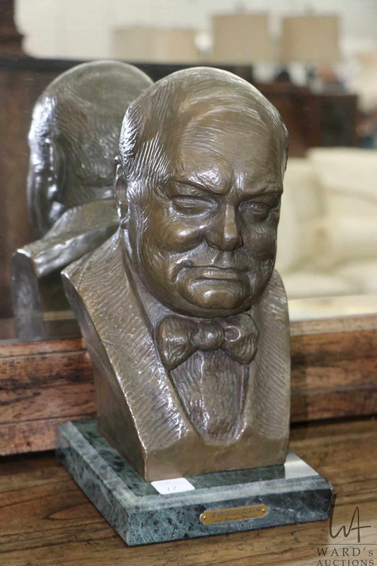 Cast bronze bust of Churchill on green marble base by artist Serge Sarkis 11 3/4" in height