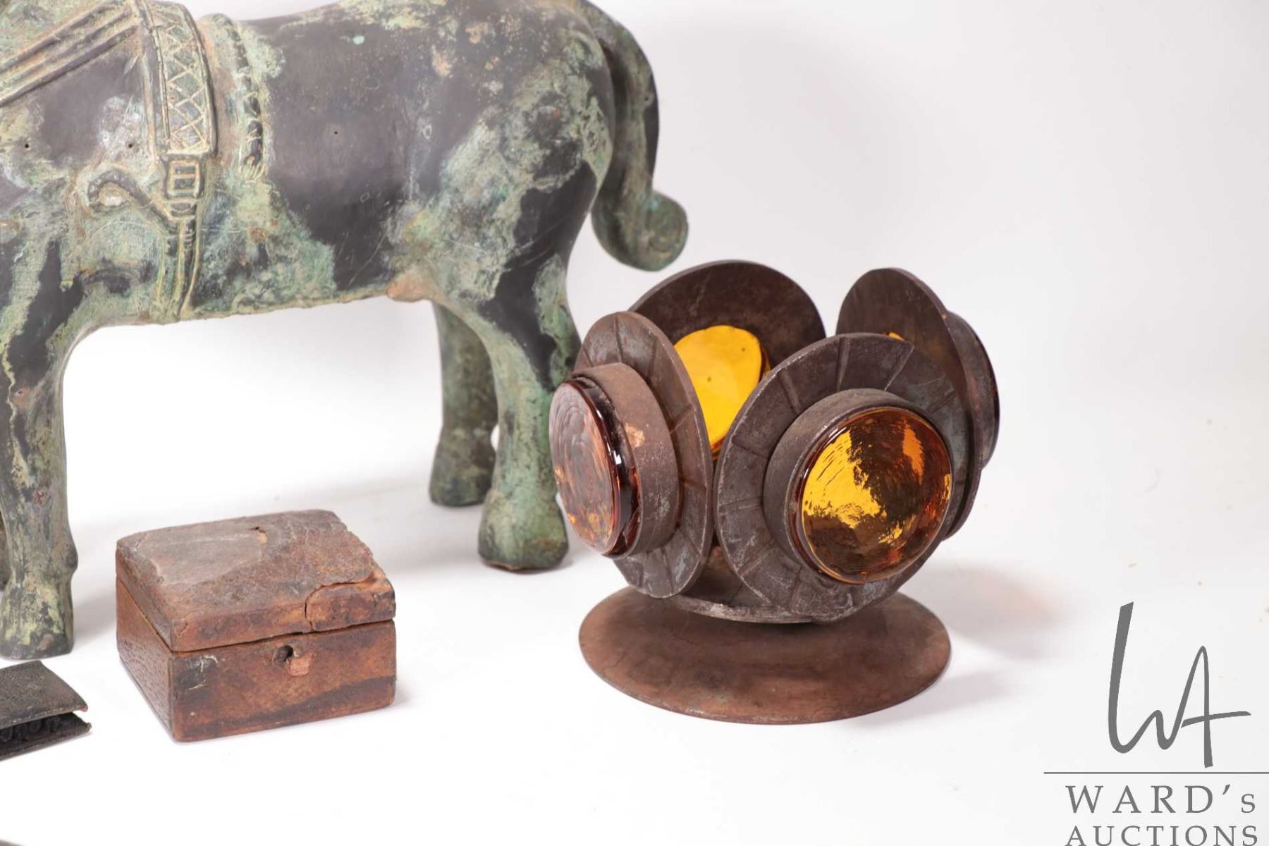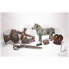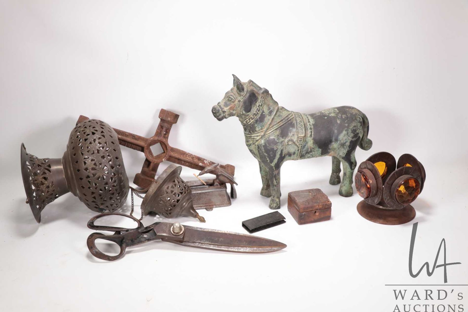Cast bronze horse 10 1/2" in height, 12" in length, cast pierced tin hanging fixture, large pair of Wilkinson tailoring shears, a cast iron match/ tooth pick grabber, leather pen wiper, hydrant wrench etc.