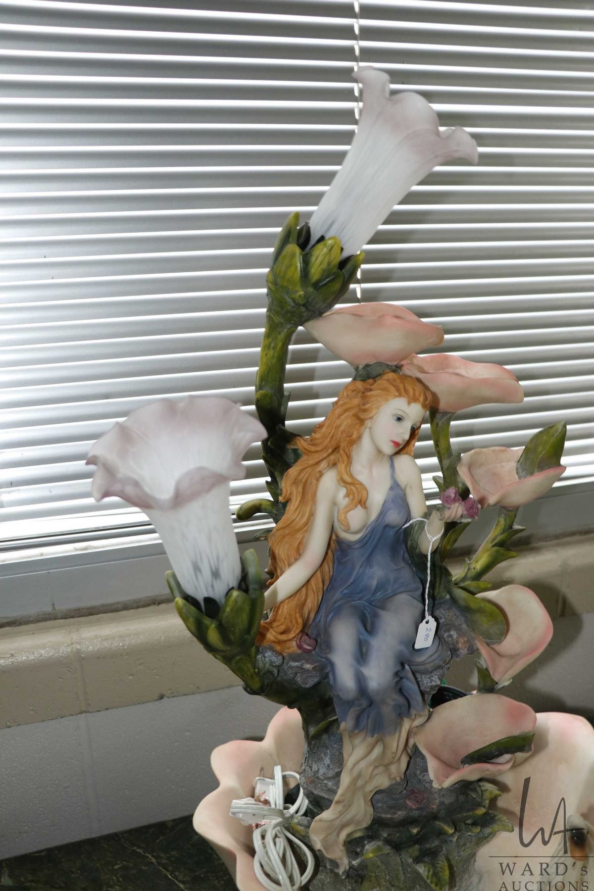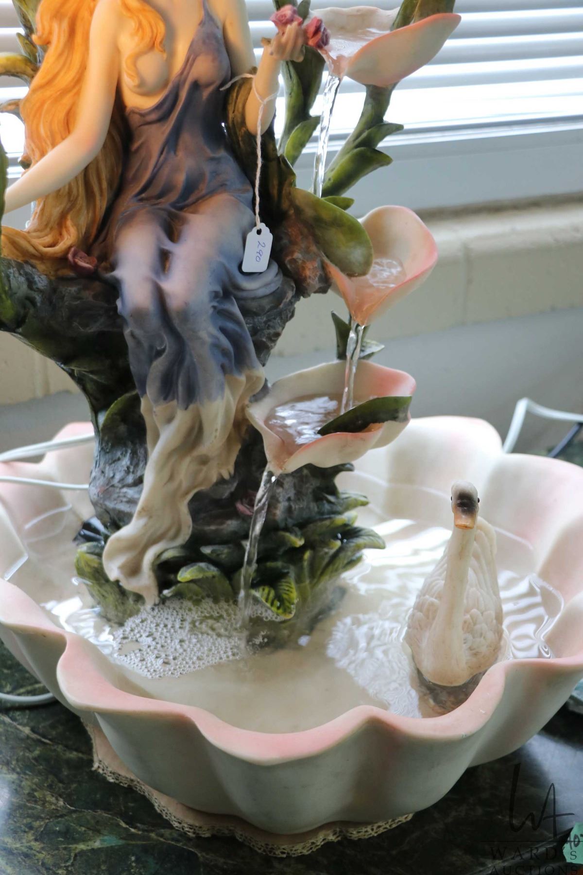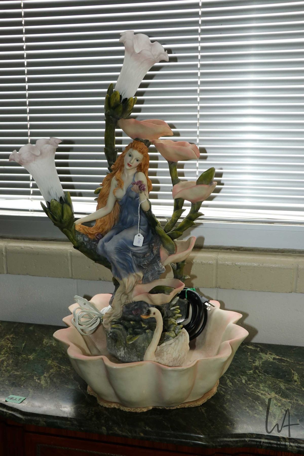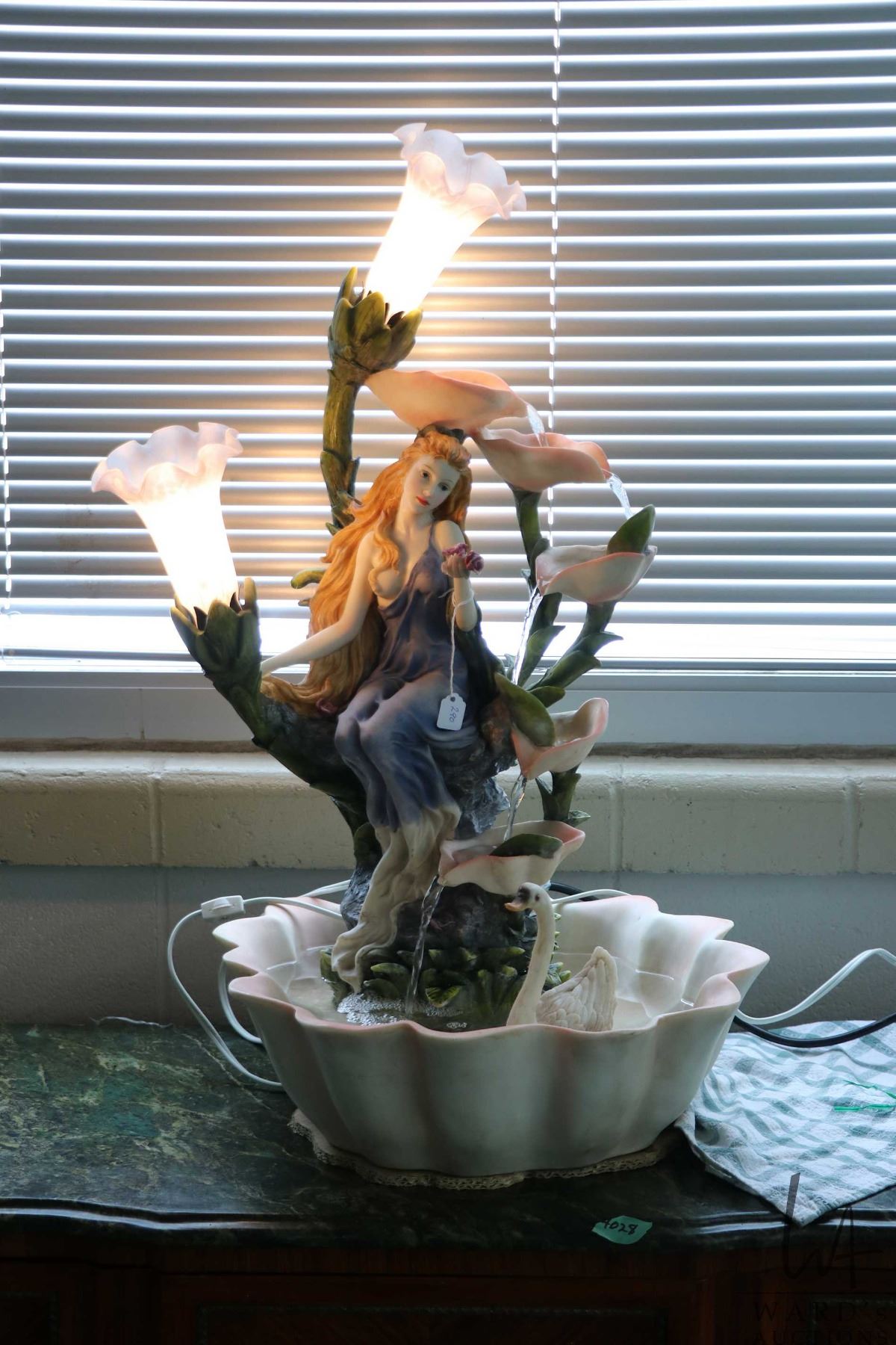 Cast resin Nouveau style water fountain with two lights, working at time of cataloguing