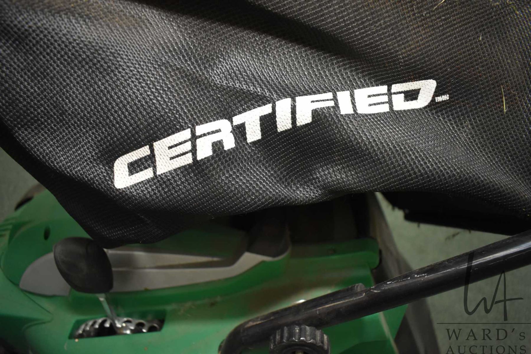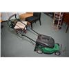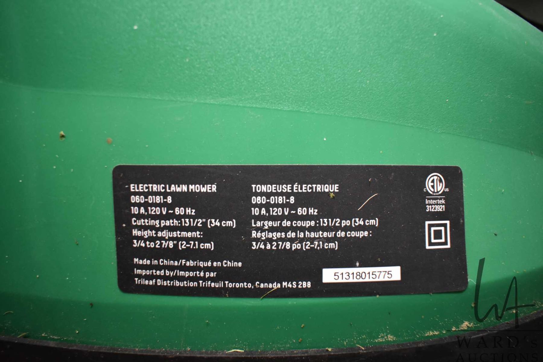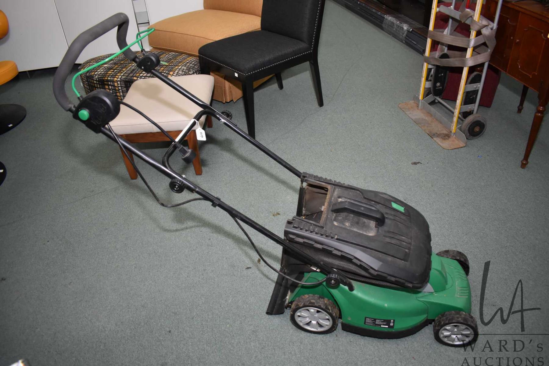Certified condo size electric lawn mower with rear bag, working at time of cataloguing