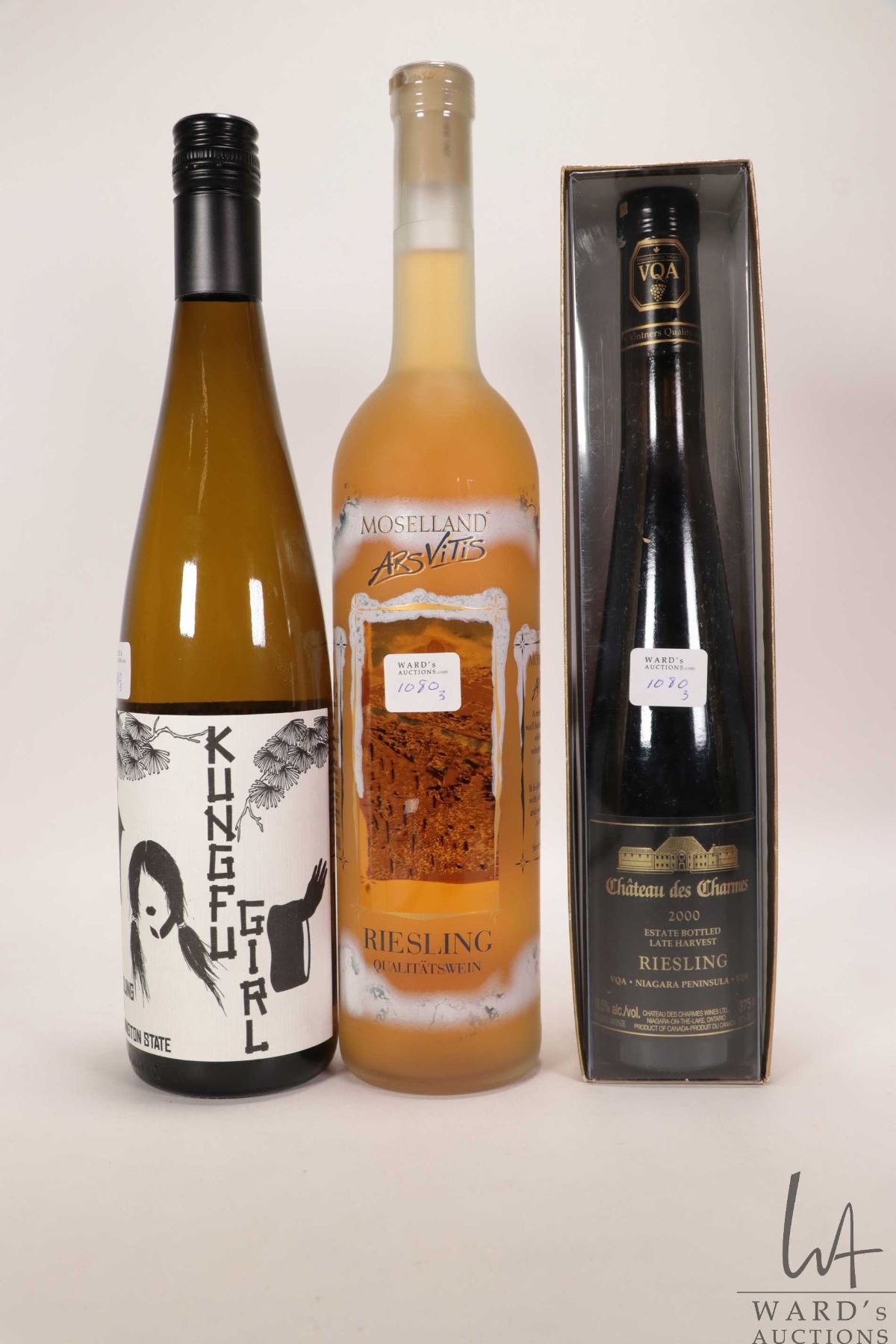 Charles Smith Wines/ 2016/ Riesling/ 750ml/ 12% ABV, Mosel/ 2013/ Riesling/ 750ml/ 8.5% ABV and Chateau des Charmes/ 2000/ Late Harvest Riesling/ 375ml/ 10.5% ABV Note: Alcohol cannot be insured by any courier in Canada. Local pick up is recommended. Canadian buyers only.
