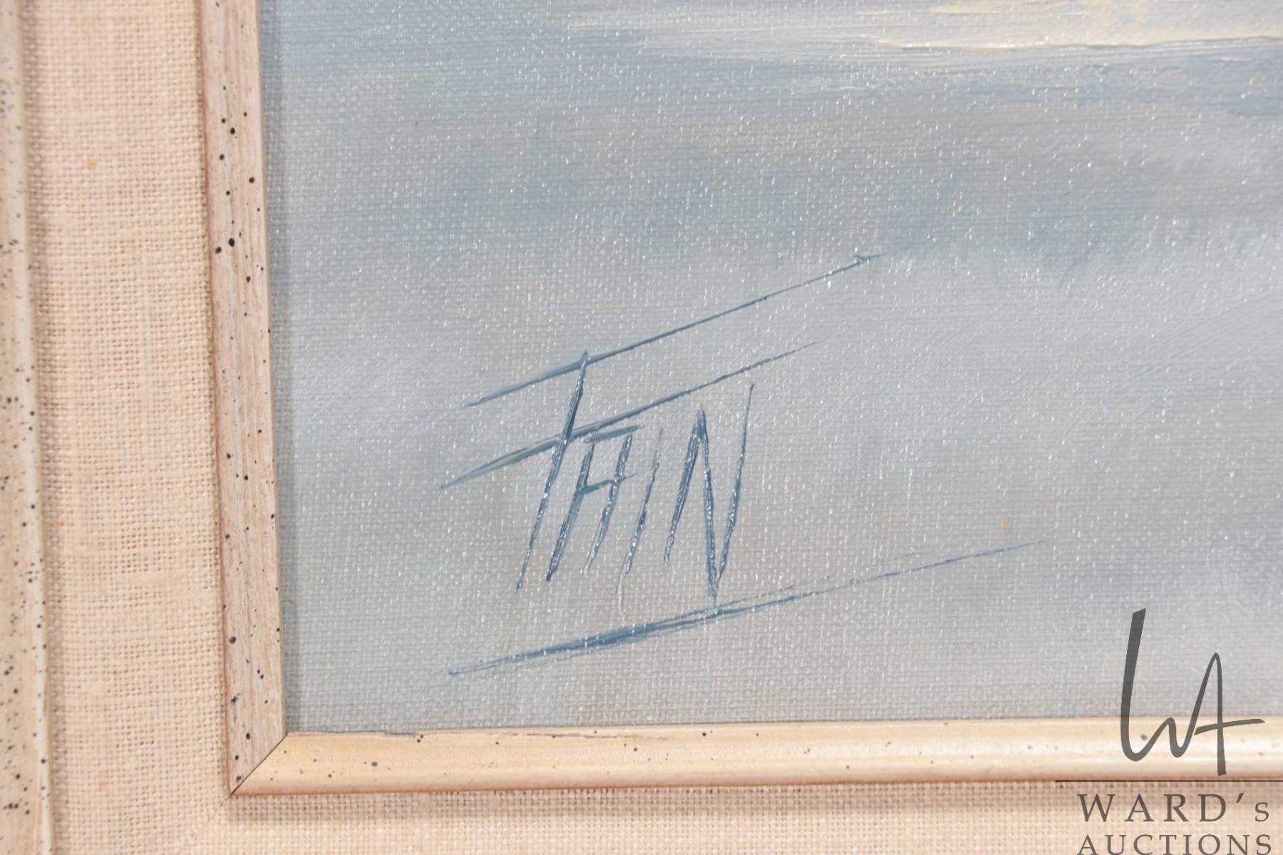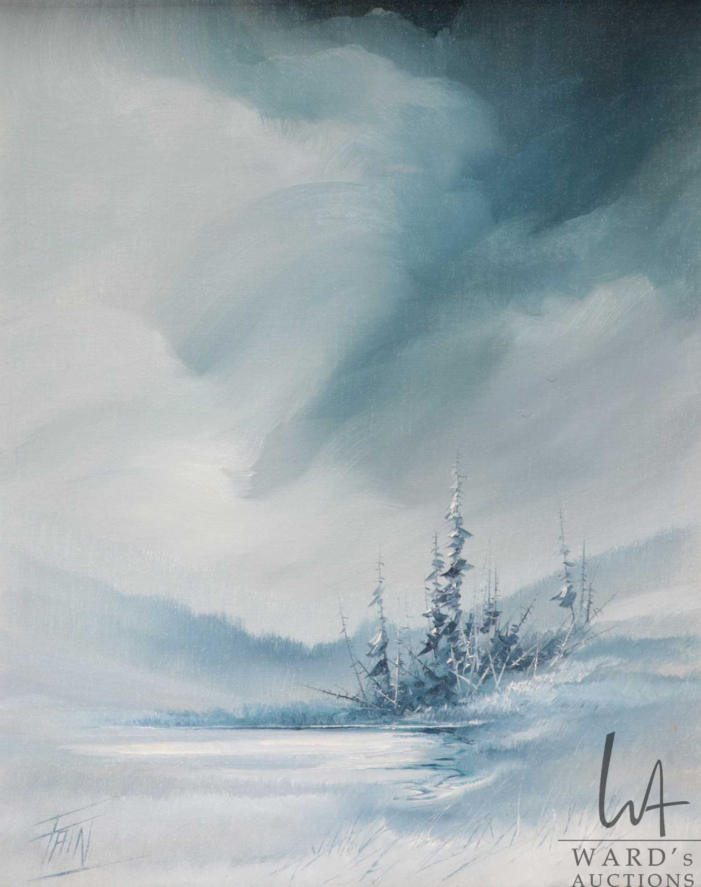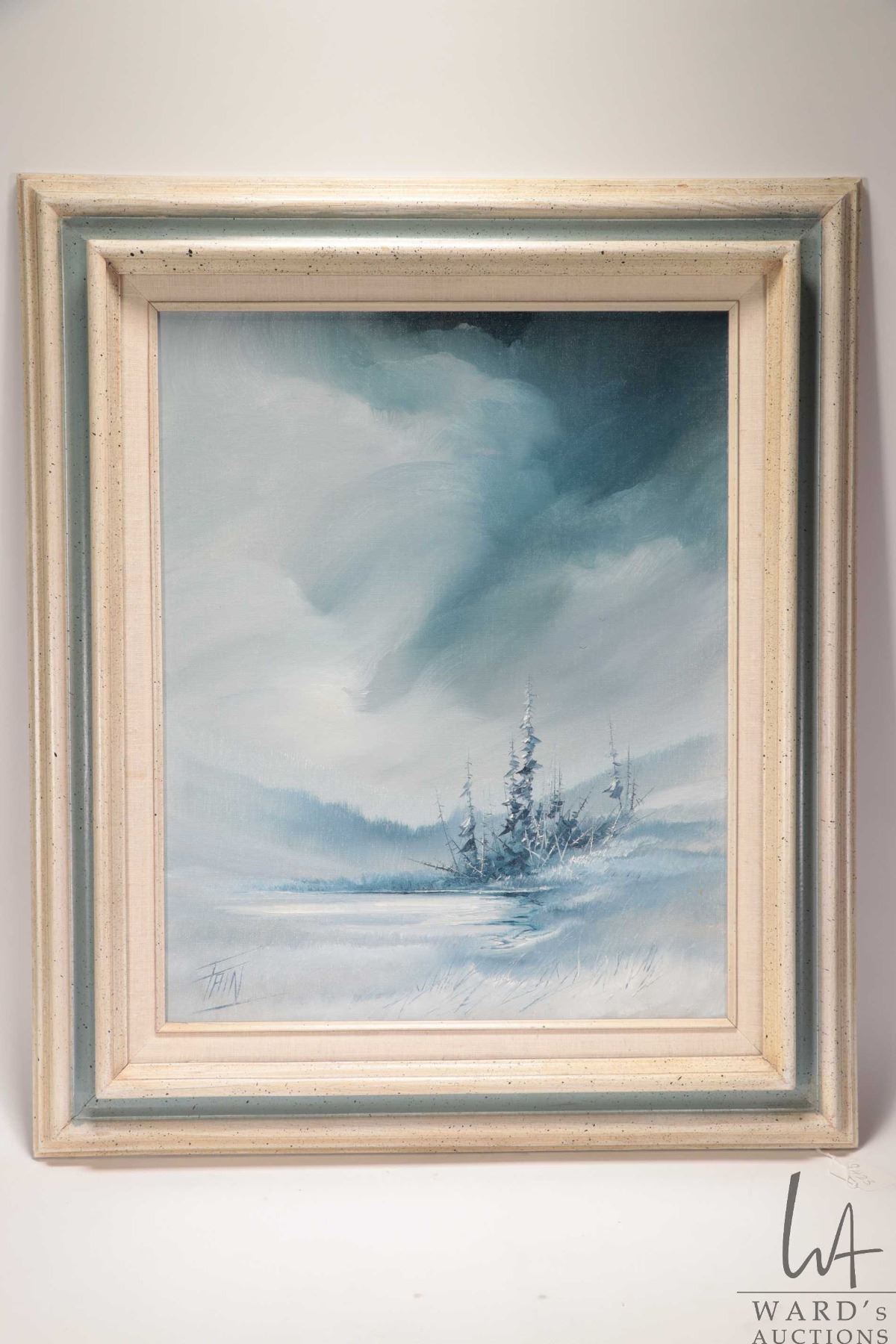 Chase Fain, framed acrylic on canvas painting of a trees in blue hues, 21" X 15"