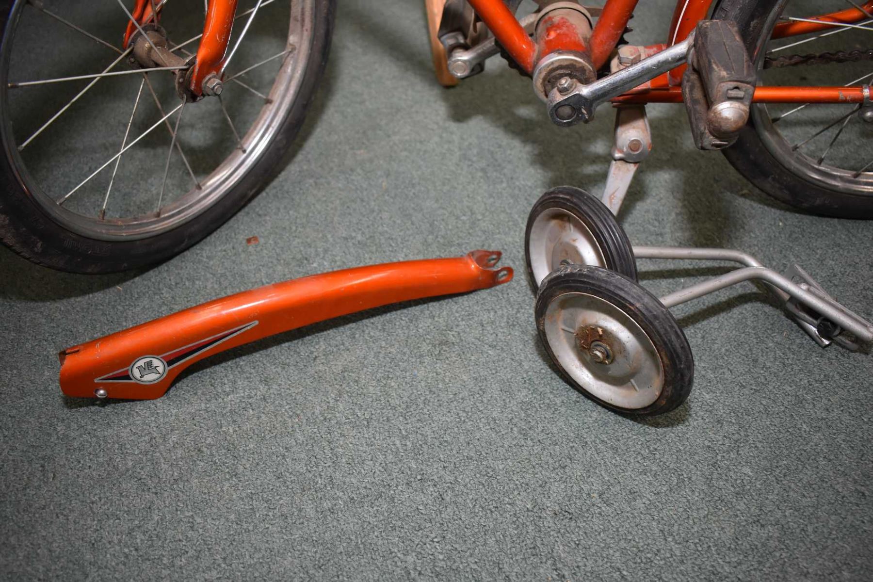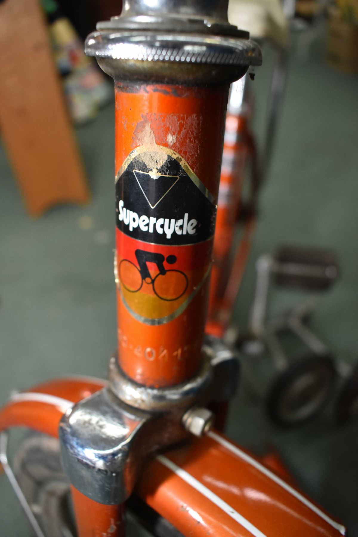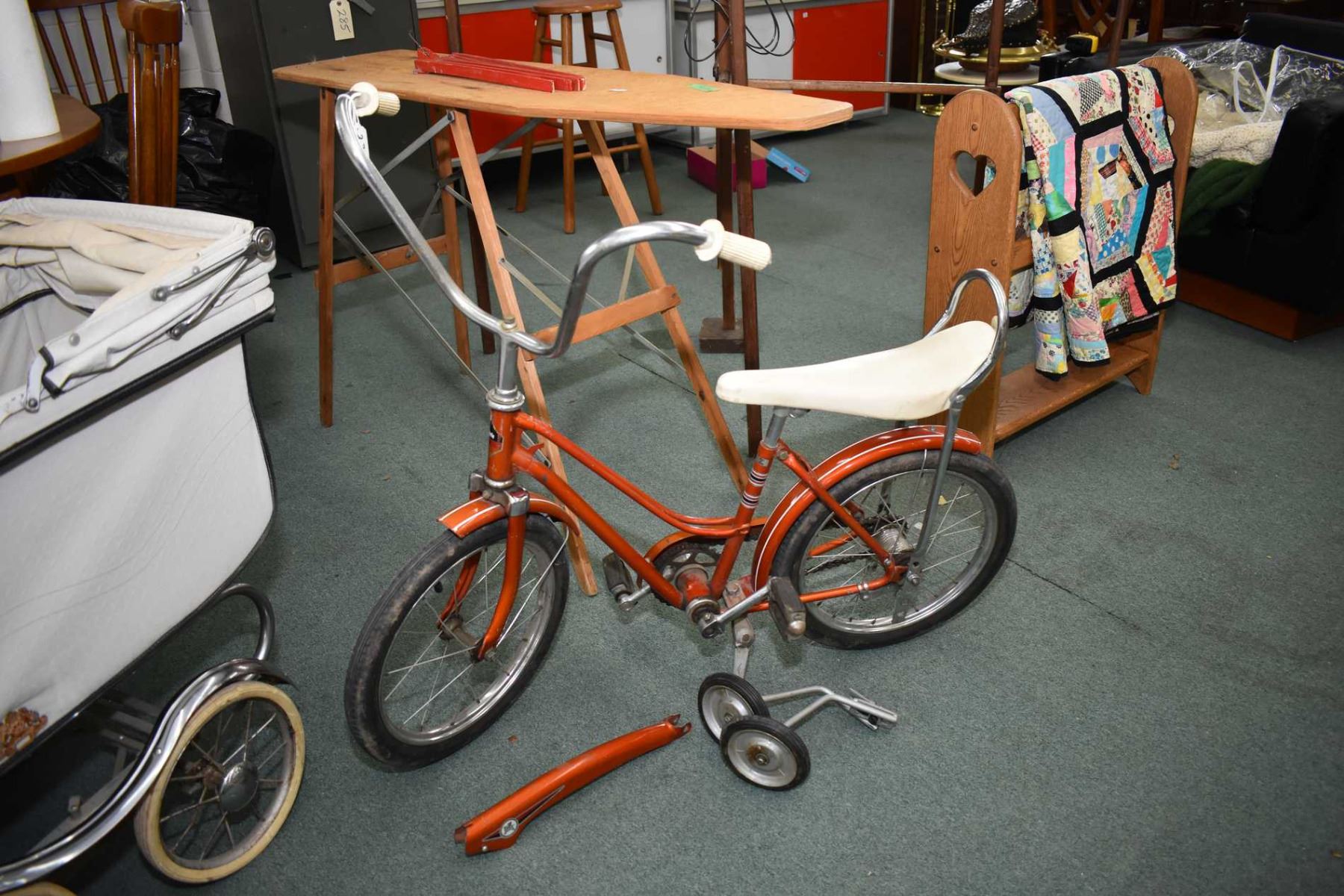 Child's vintage bicycle with banana seat, ape hanger handle bars, convertible bar to make into boy's bike or leave off for girls, plus training wheels, made in Poland by Supercycle