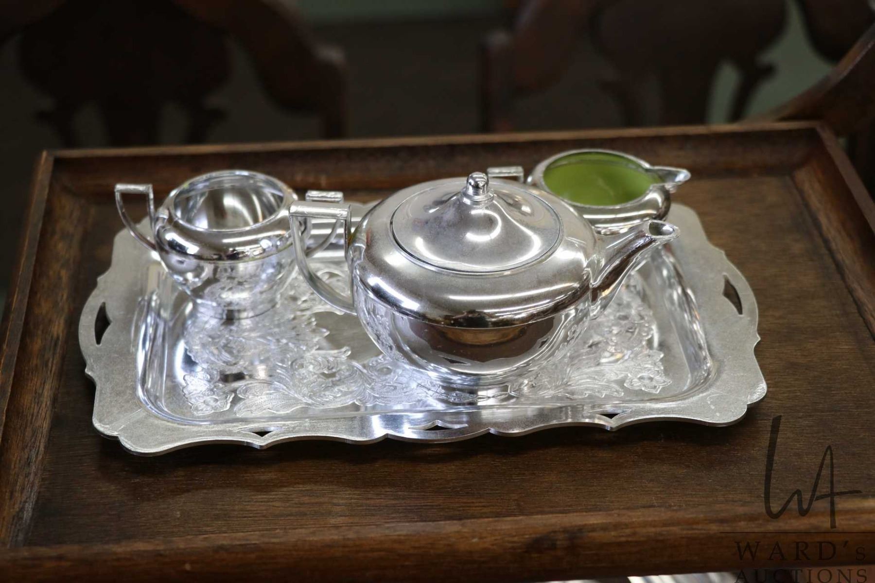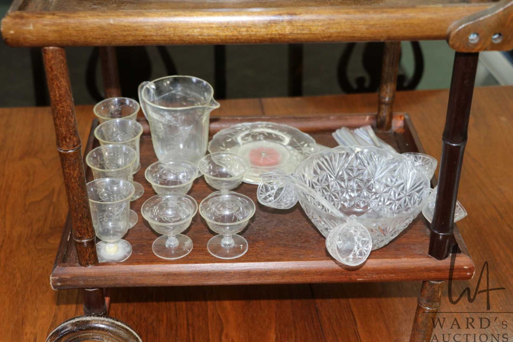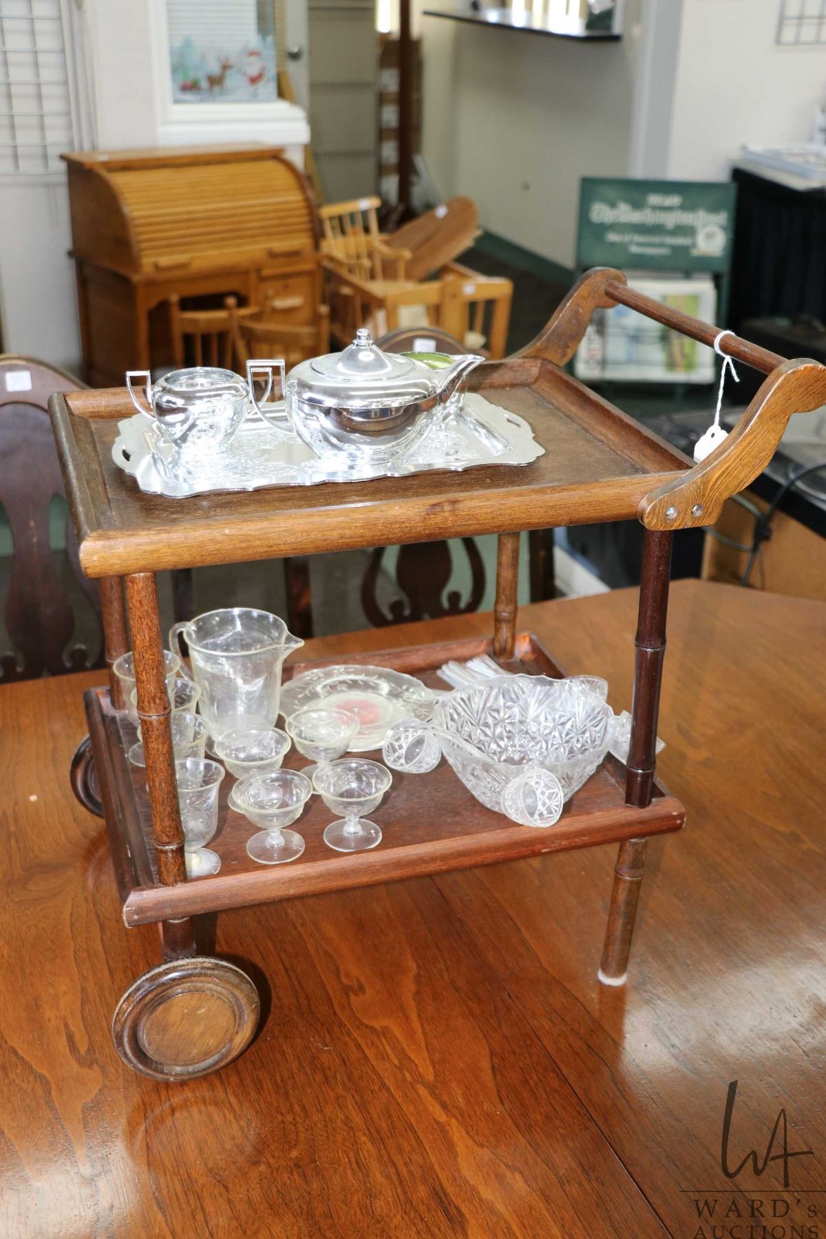 Child sized tea trolley 17" in height to handle plus selection of serving pieces including tea set, punch bowl etc.