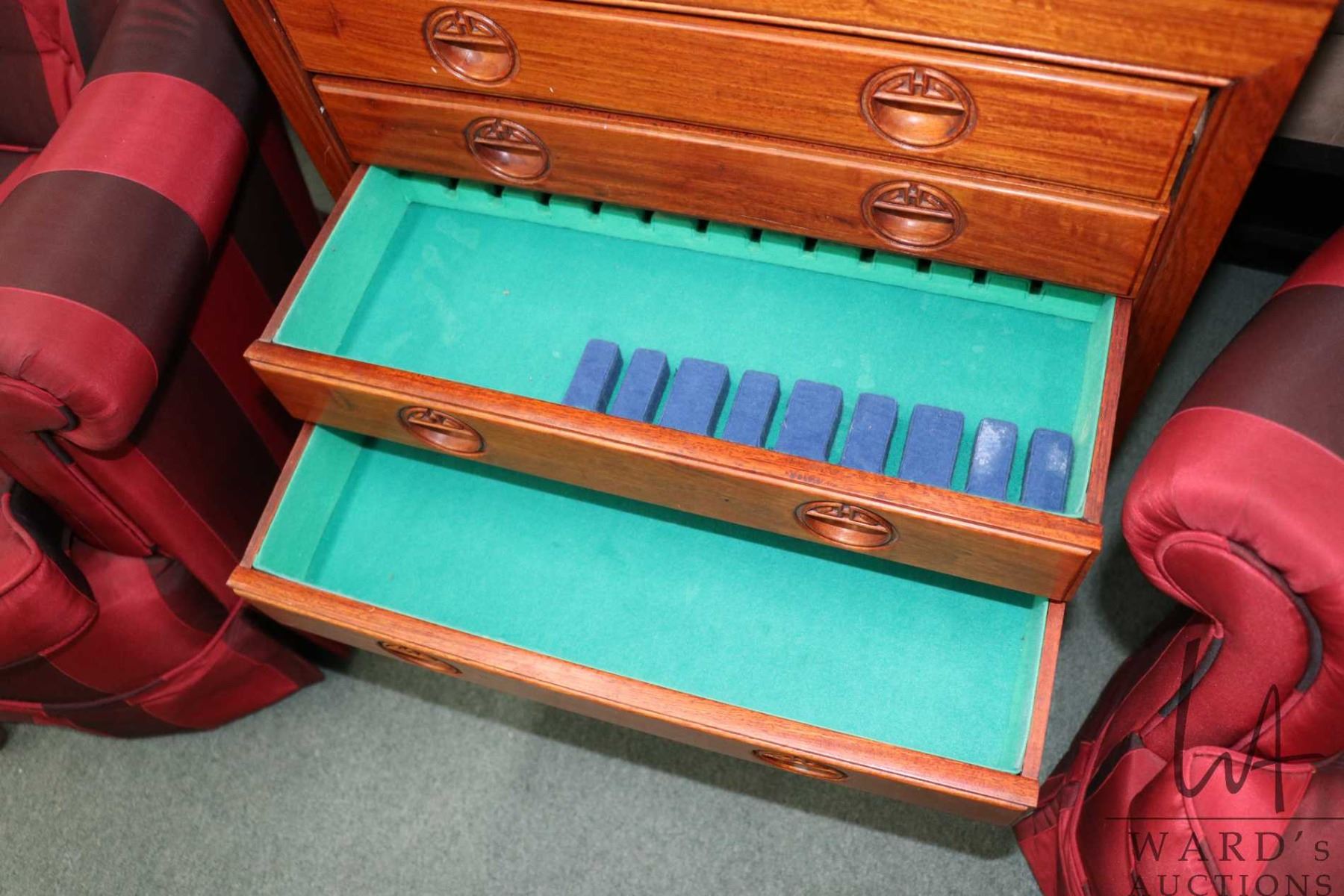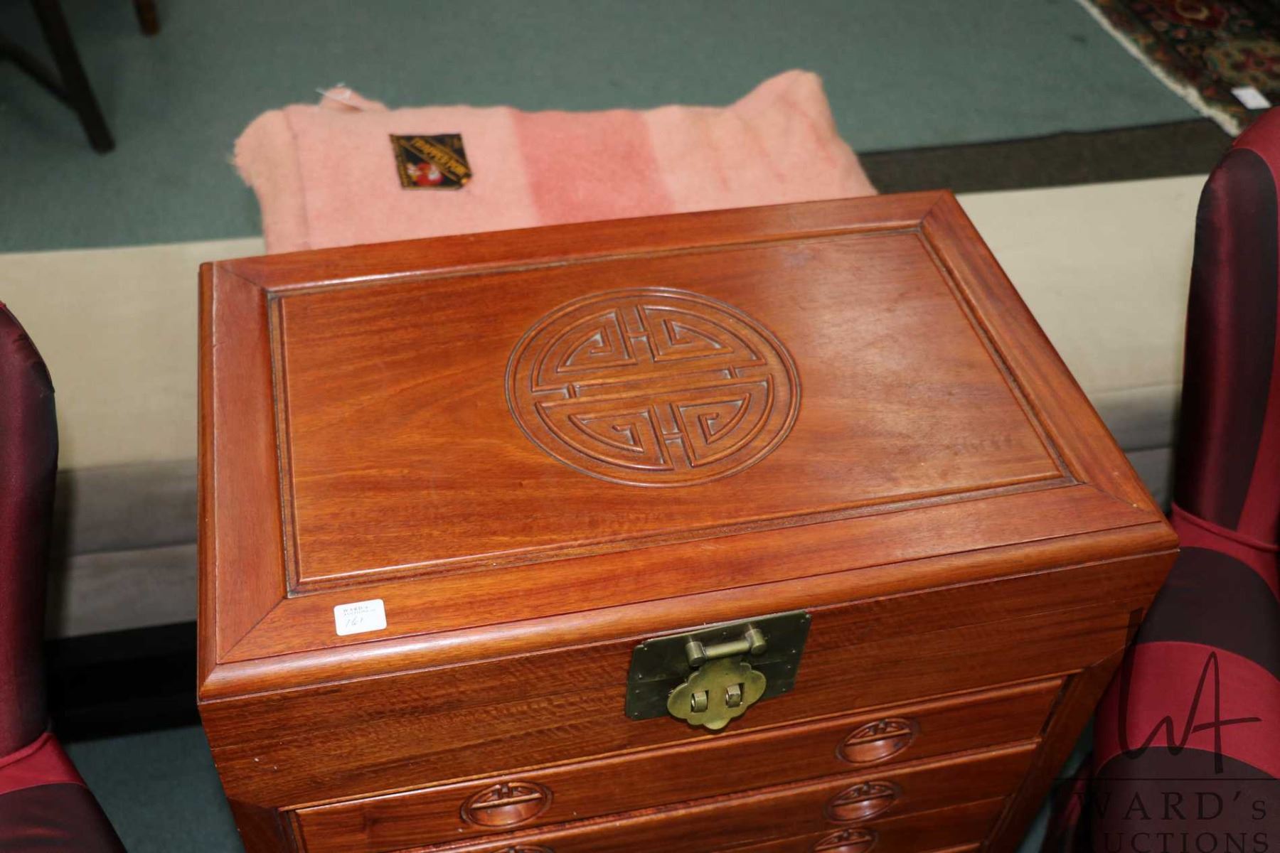 Chinese carved rosewood flatware cabinet with flip top, four drawer and two doors, 32" H X 22" W X 1