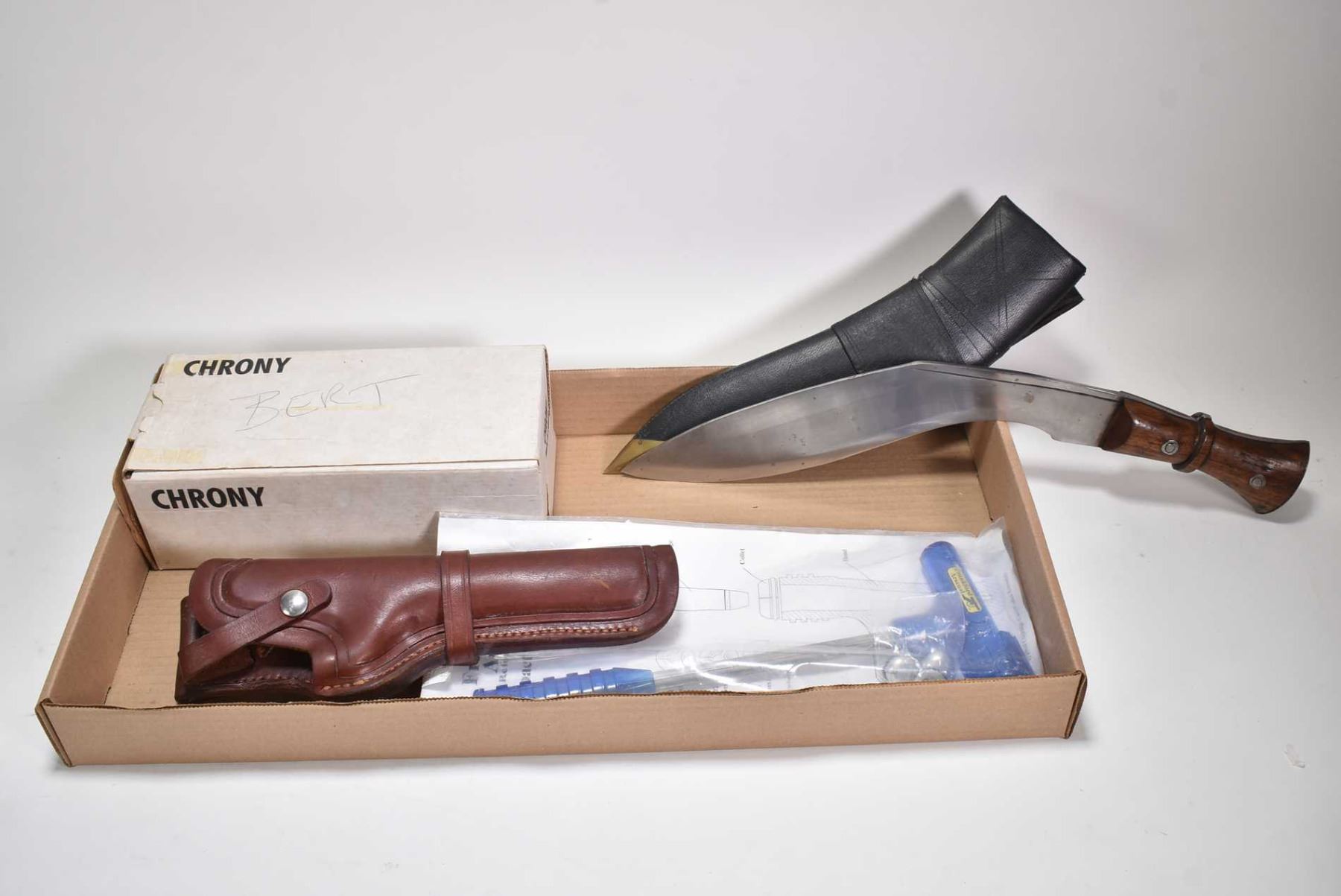 Chrony model F Chronograph with original box and paperwork, an Indian Kukri knife with leather sheath, a Browning holster and a Frankford Arsenal Impact bullet puller