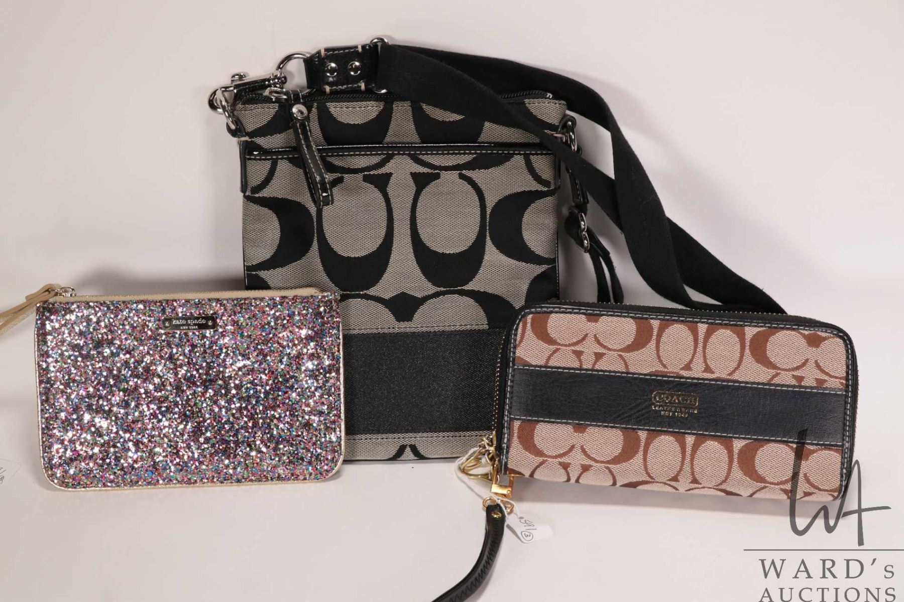 Coach Signature Stripe cross body purse, a Coach Signature Stripe Legacy accordion zip wallet and a Kate Spade Glitterball Bia clutch in multicolour glitter finish