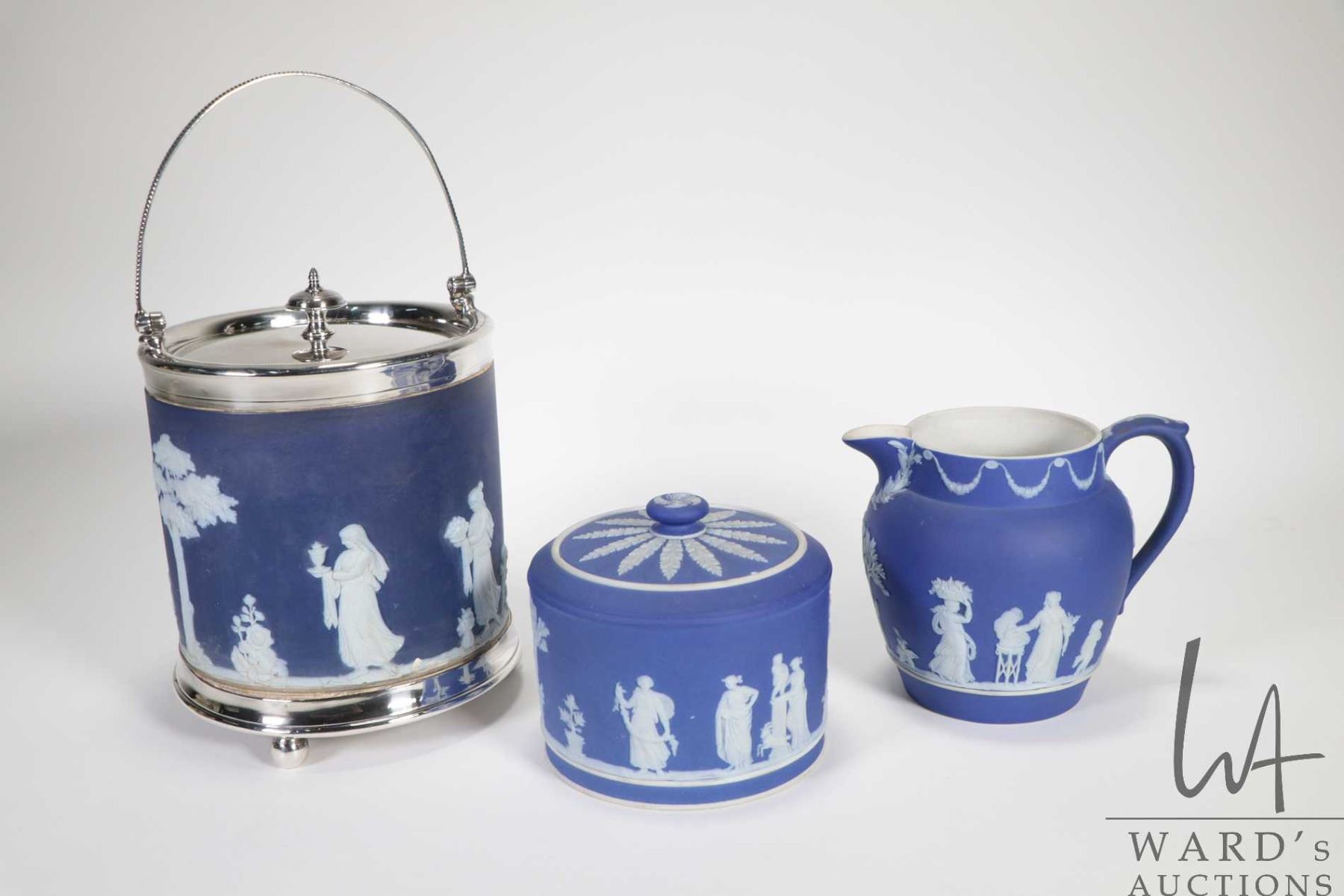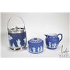 Cobalt Wedgwood Jasperware including biscuit barrel with silver plate galley plus a lidded sugar and cream jug