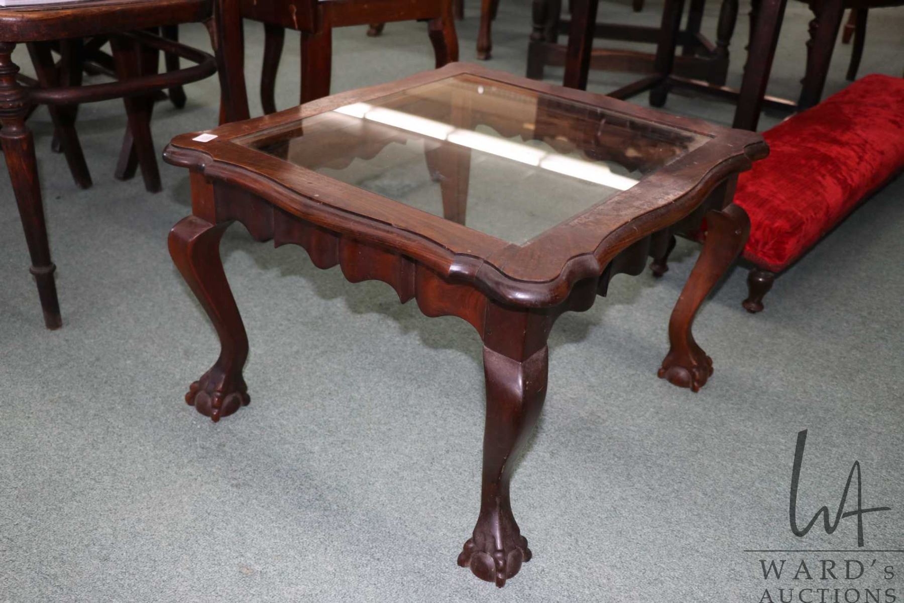 Coffee table height, wooden end table with glass top and carved ball and claw feet. See photo for faded maker mark, 15" H X 22" W X 23"