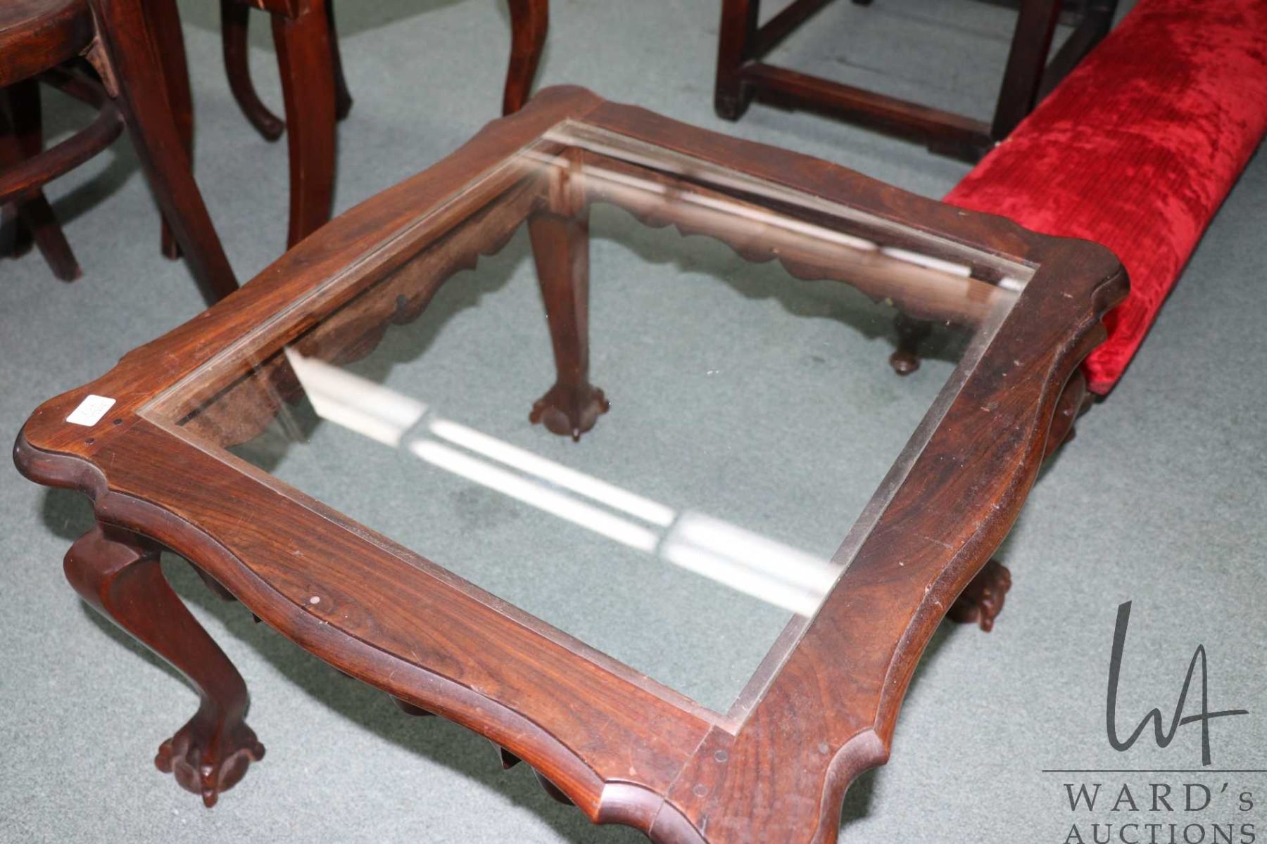 Coffee table height, wooden end table with glass top and carved ball and claw feet. See photo for fa