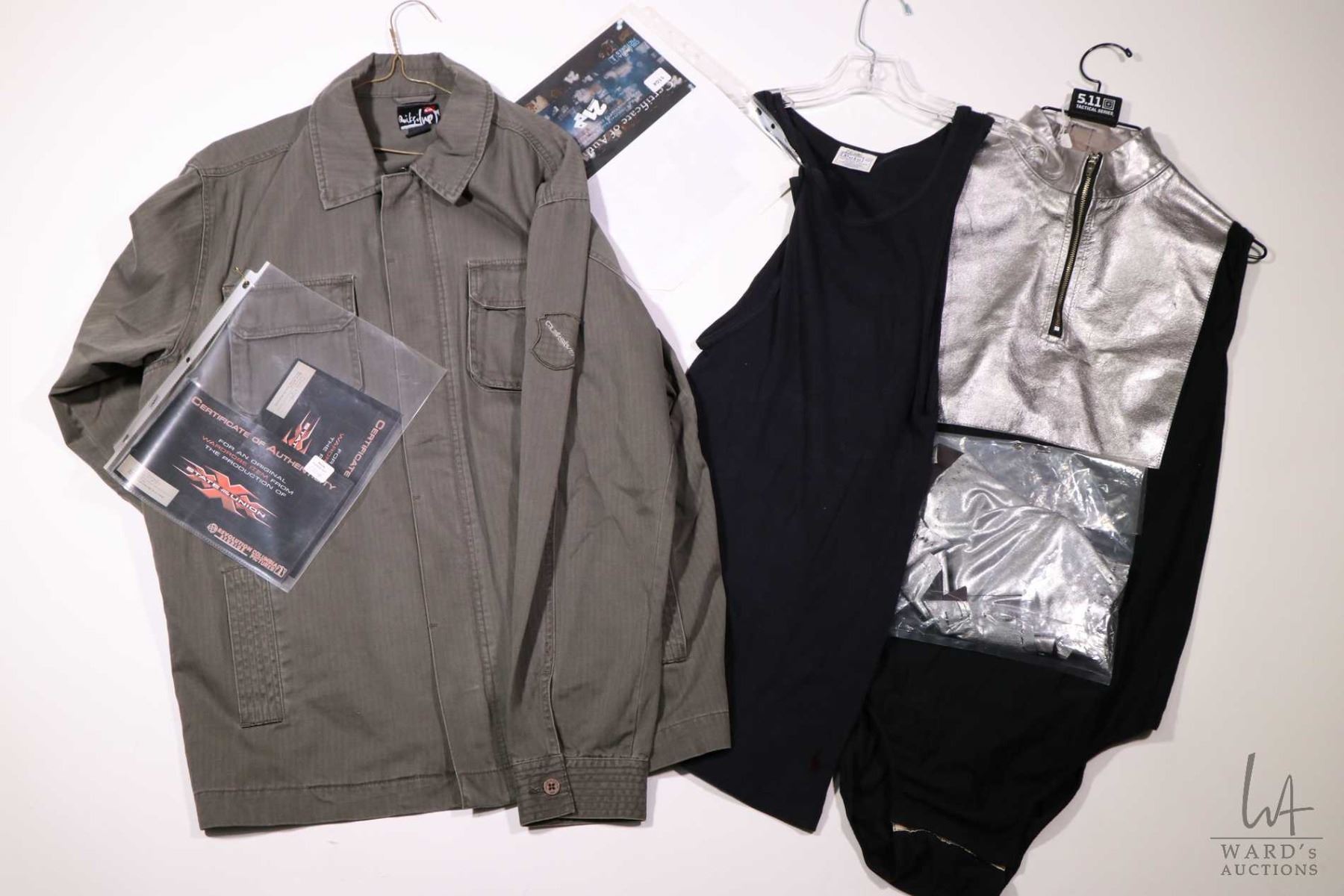 Collection of authentic movie props including jacket worn by Mickey ( Kevin Spacey) in "21" with certificate of authenticity from Columbia Pictures, black undershirt worn by Zeke (Xzibit) in "State of the Union" with non-specific Revolution Studios and Columbia Pictures certificate of authenticity plus a unidentified silver and black body suit