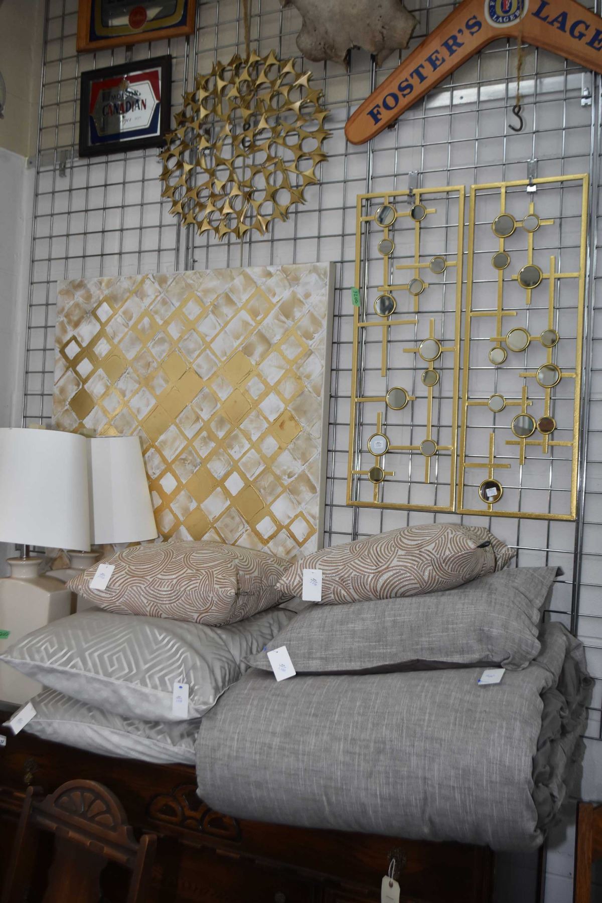 This Item Not Available For Shipping. Local Bidders Only. Collection of new showhome decor items including KIngsized duvet with one matching pillow, four co-ordinating geographic designed pillows, two ceramic table lamps, two gold metal wall plaques with decorative mirror design, large gold geometric picture 36" square and round gold abstract wall hanging