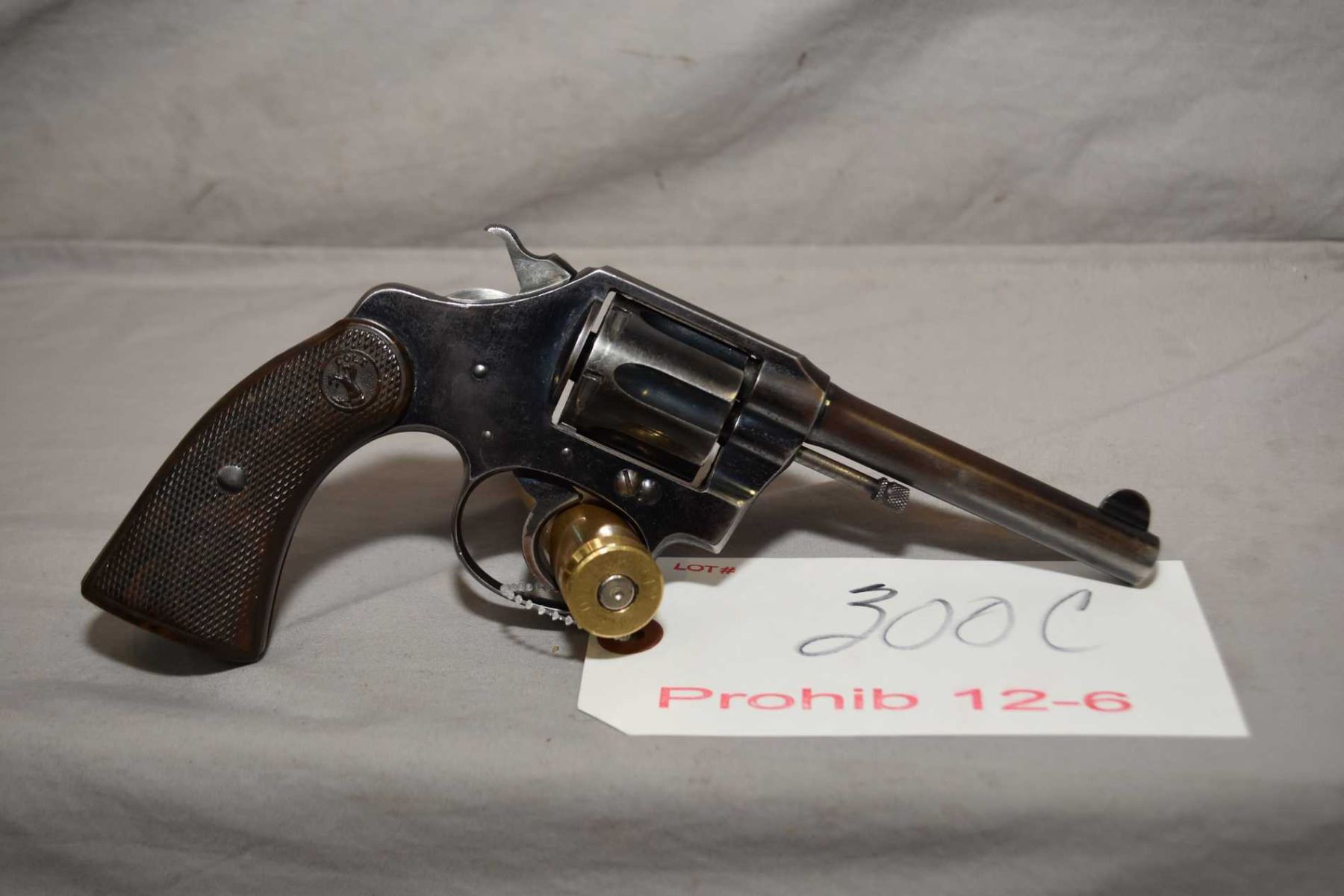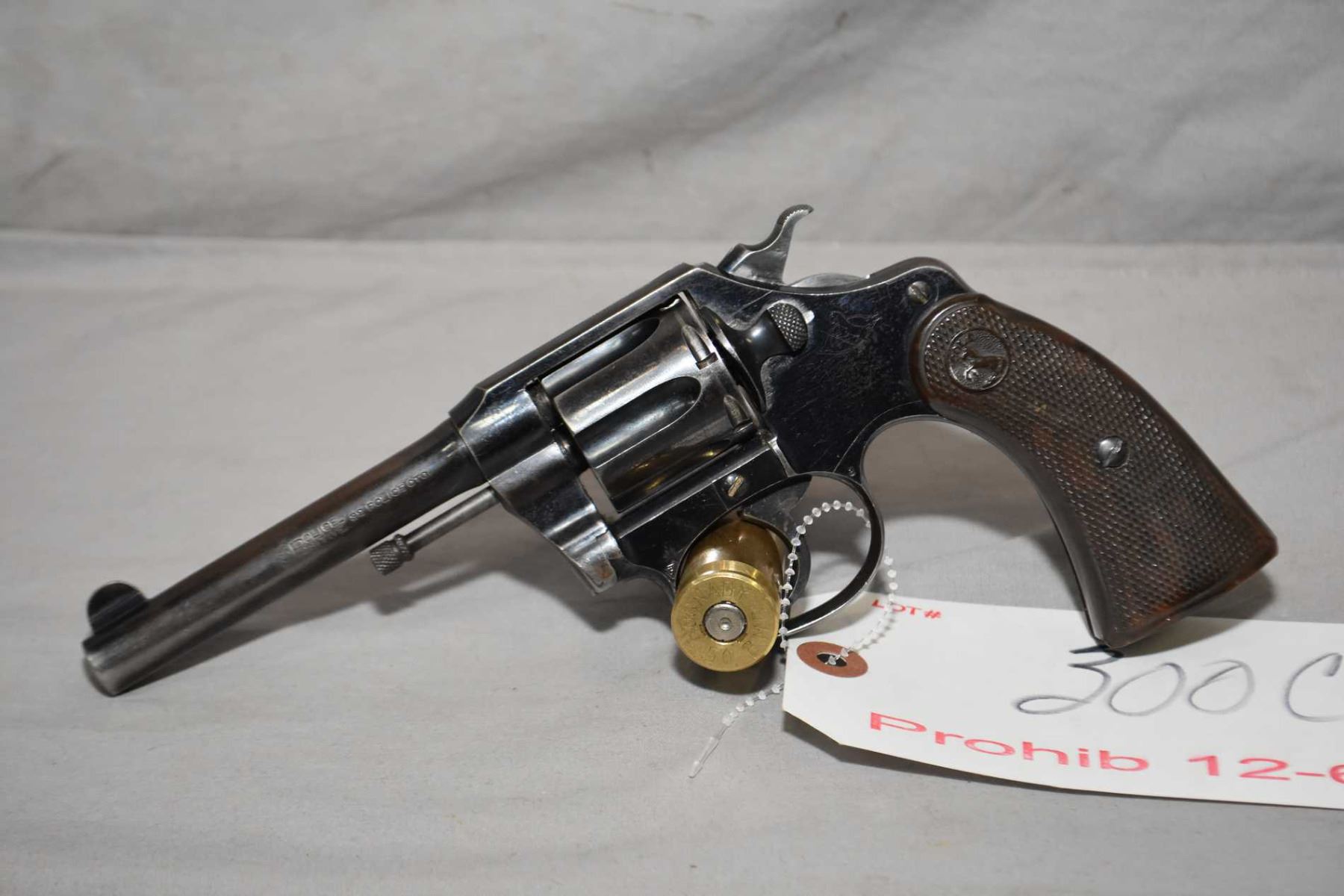 Colt Model Police Positive .32 S & W Long Cal 6 Shot Revolver w/ 102 mm bbl [ blued finish starting to fade, various marks and scratches including cylinder ring, checkered brown Colt insignia grips ] Ser # 86562 Prohib 12 - 6 Cert # H - 194198 Old Green Sheet FRT # 45223 - 54 EXPECT DELAYS IN TRANSFER
