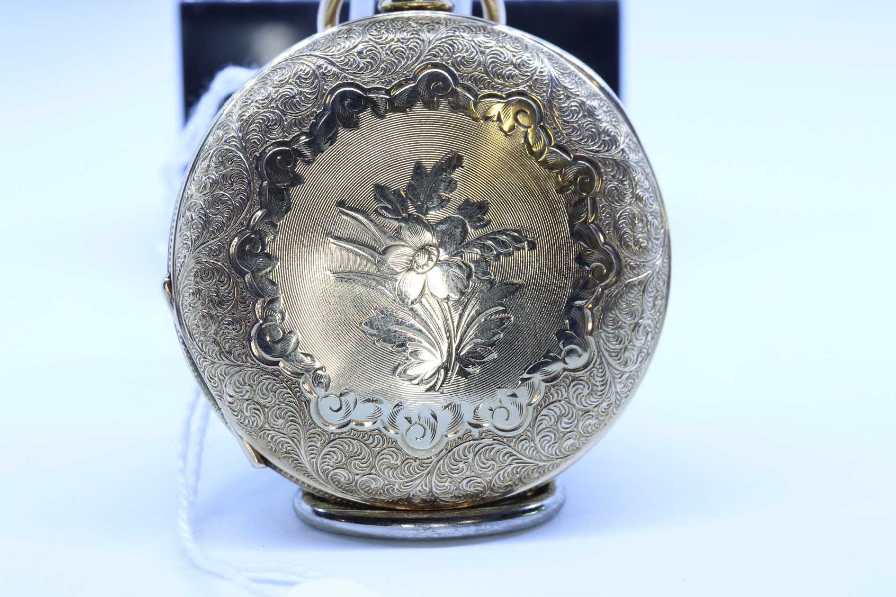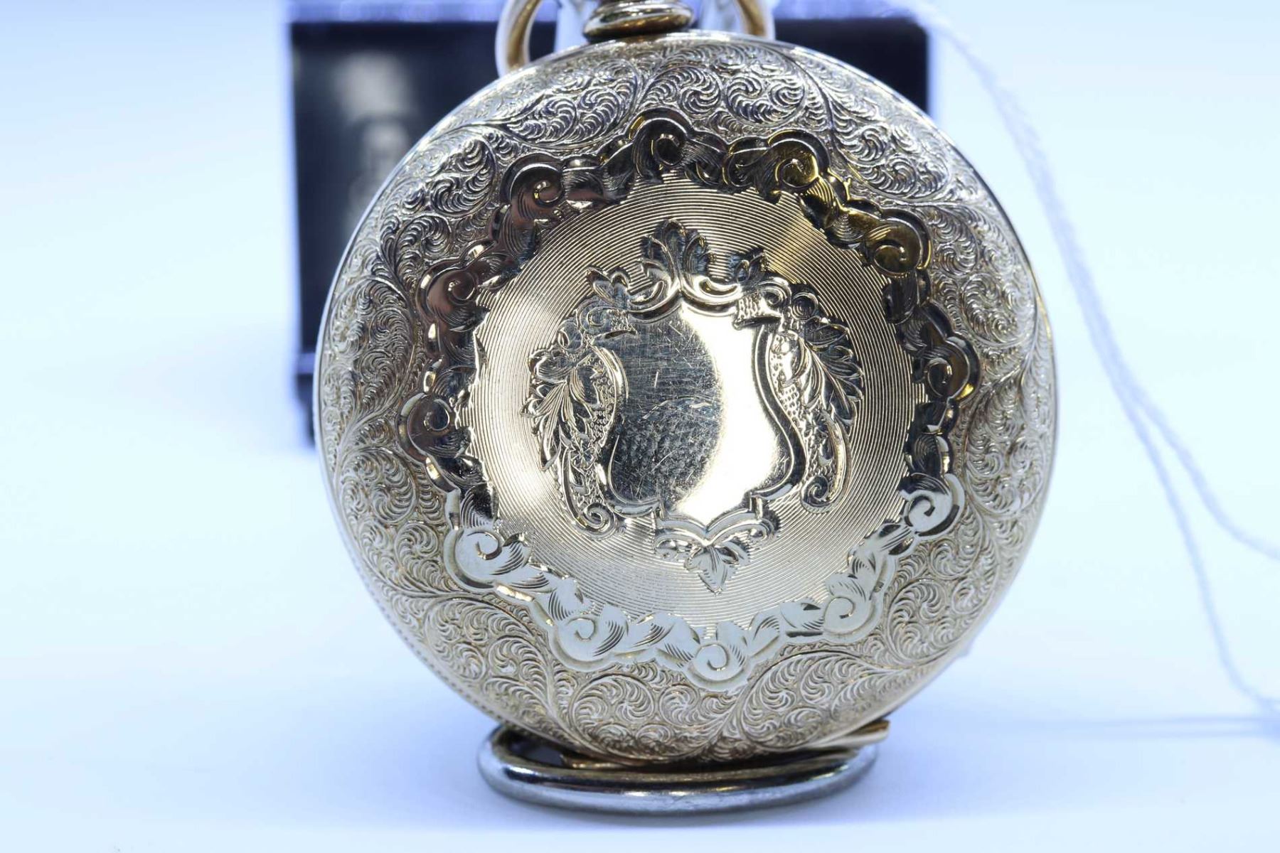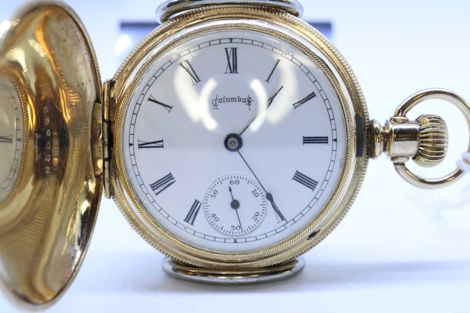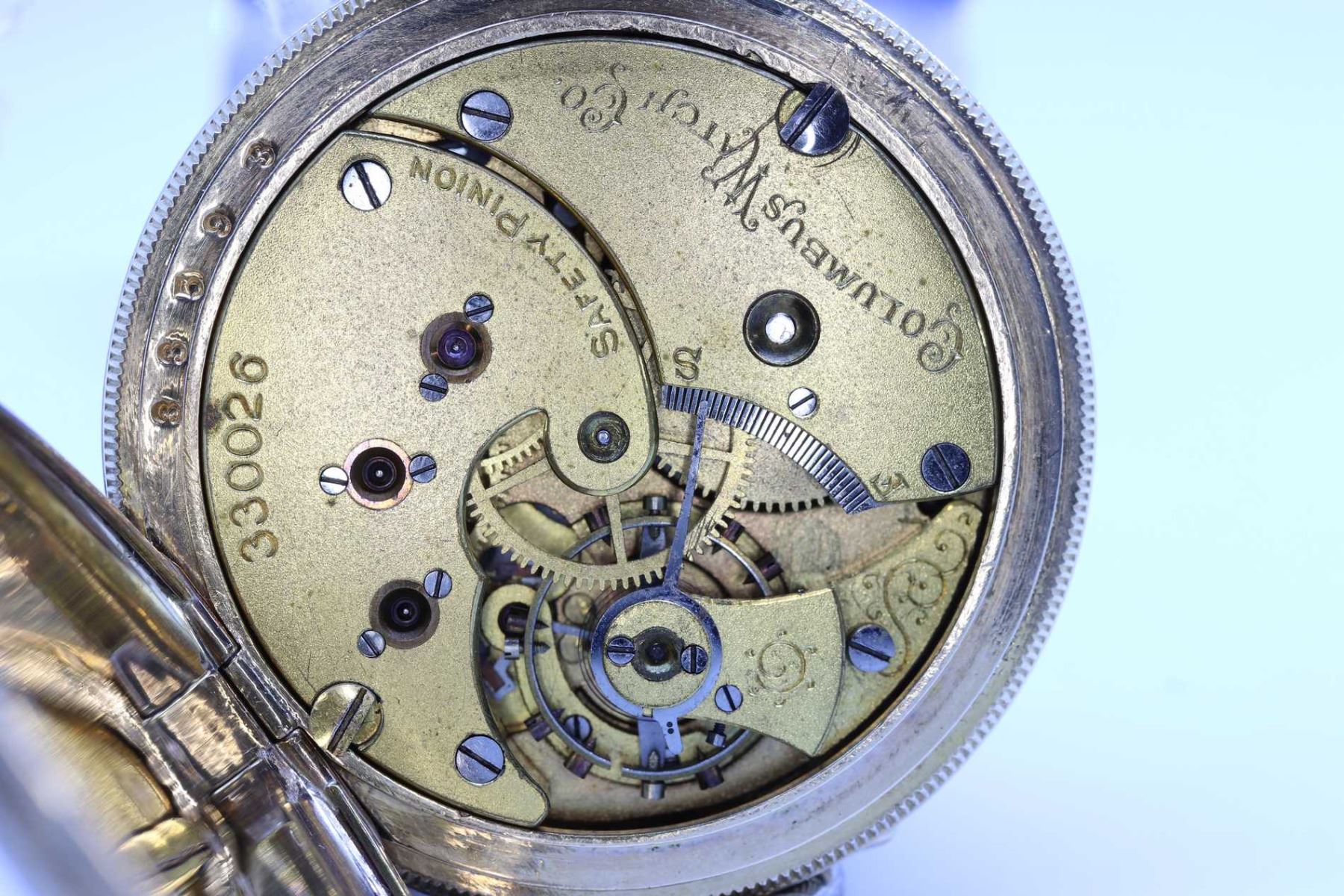 Columbus size 6, 11 jewel pocket watch. Model 1, serial #330026, circa 1895. 3/4 gilt plate stem wind and lever set movement signed Columbus Watch Co. Has a single sunk white porcelain dial with black Roman numerals and matching blued spade style hands. Comes in a gold filled Keystone hunter case with leaf and floral engraving on back hinged cover and blank shield on the front cover. Working at time of cataloguing