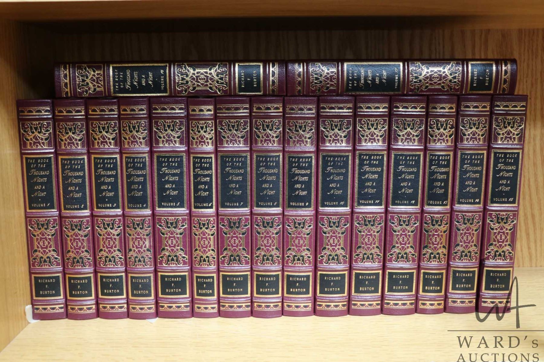 Complete set of seventeen leather bound books "Thousand Nights and a Night", by Richard F. Burton. Collectors edition, printed in 1994 and published by The Easton Press. Each book is leather bound with hubbed spines, accented in 22kt gold, printed on archival paper with gilded edges and all include silk book mark and moire endsheets. NOTE: This Lot Is Not Available For Shipping. Local pickup only.