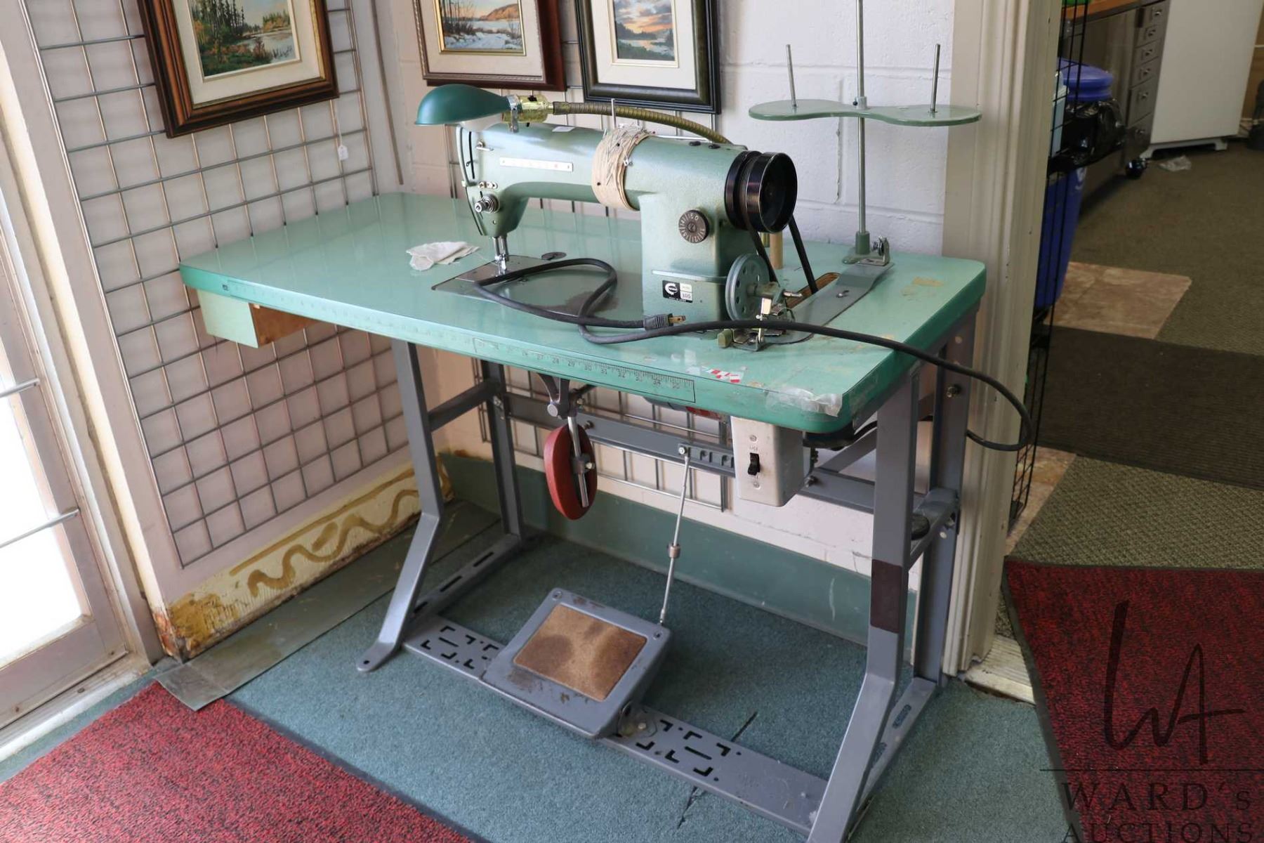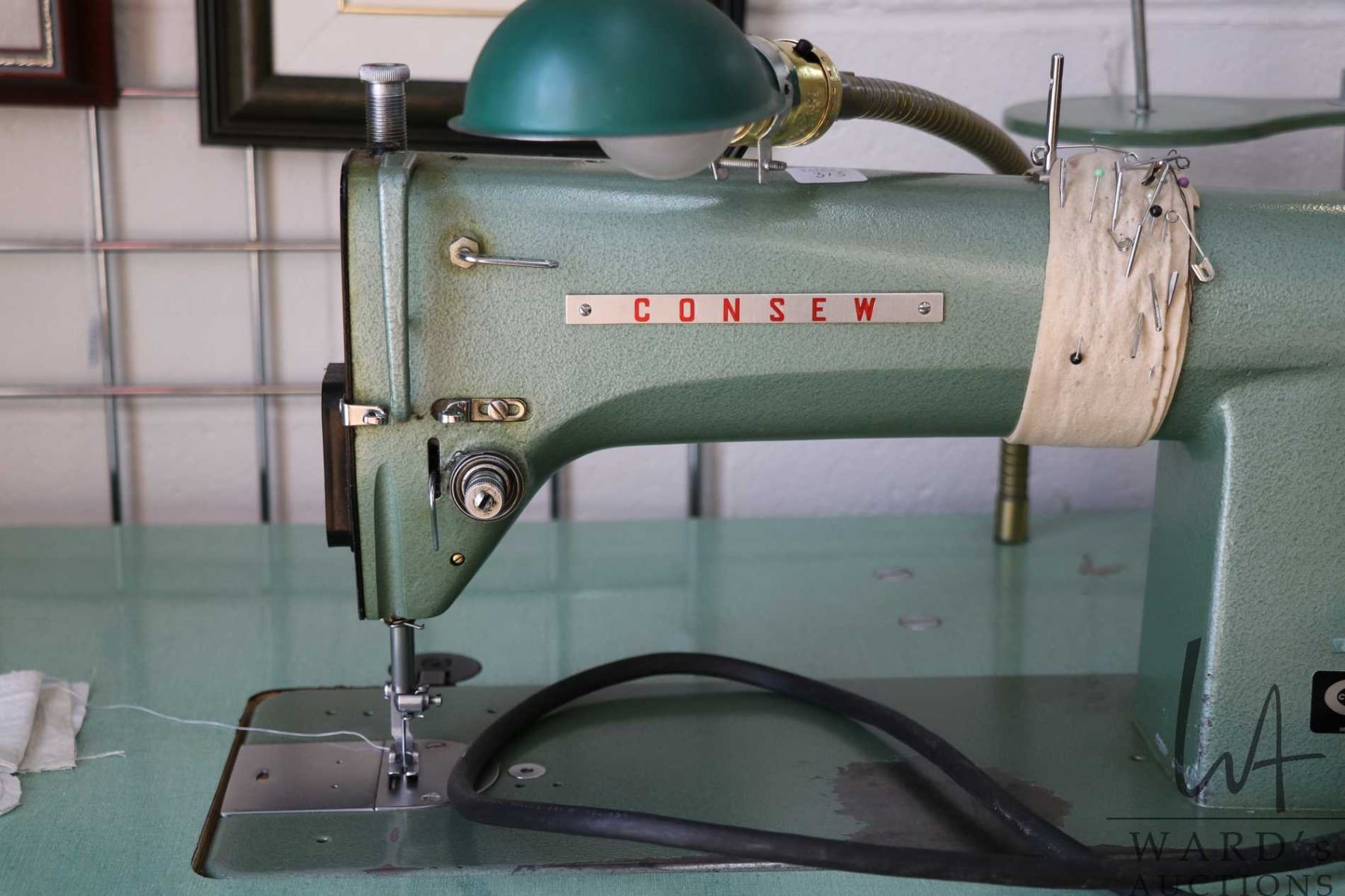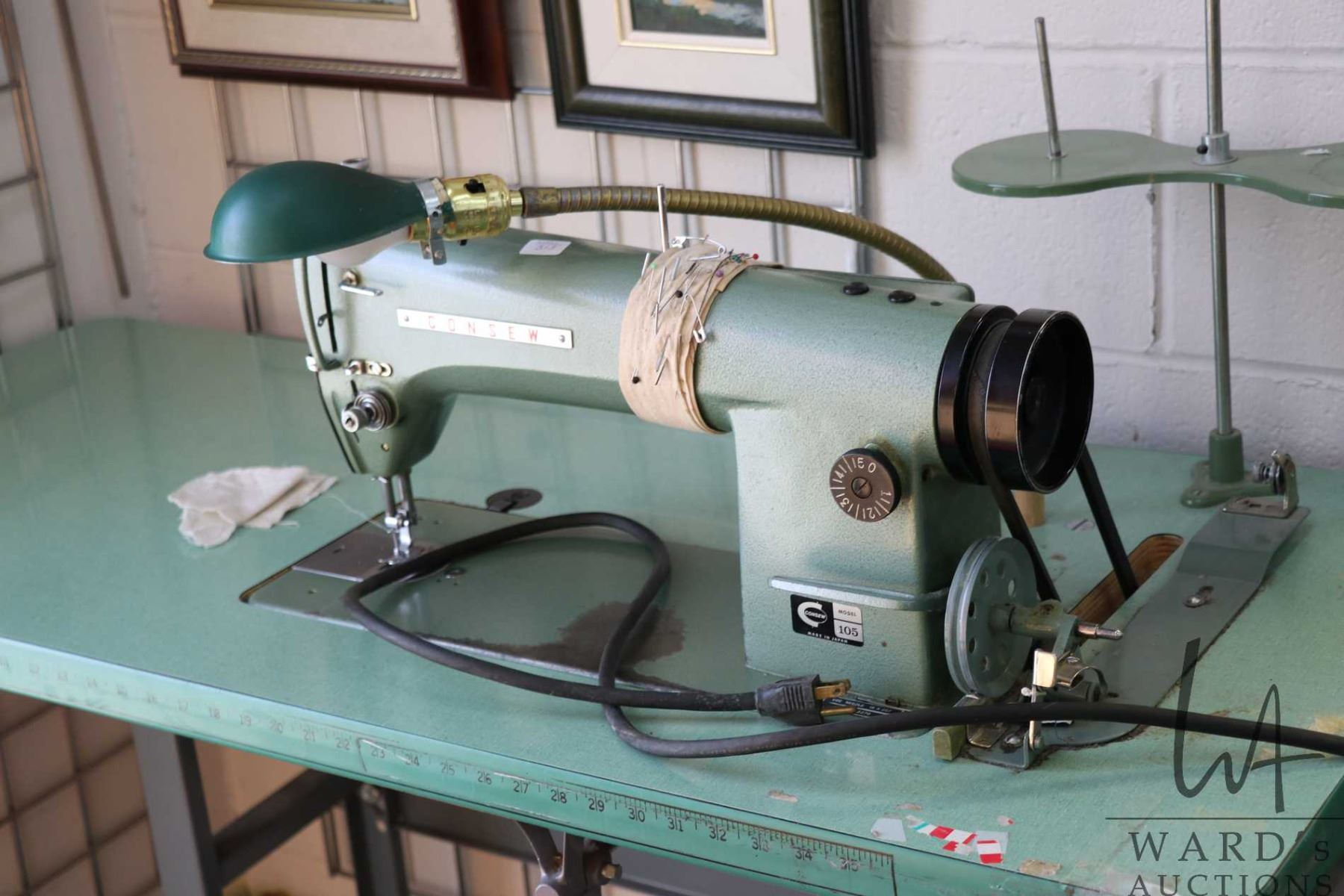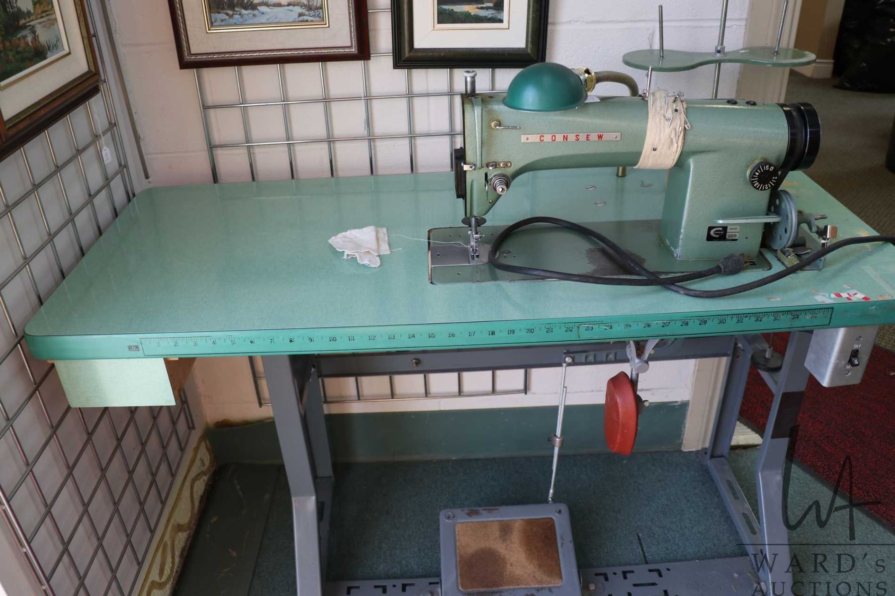 Consew Model 105 commercial sewing machine on industrial stand with foot pedals, working at time of cataloguing