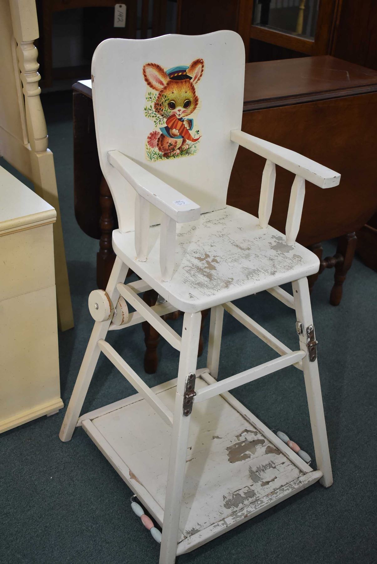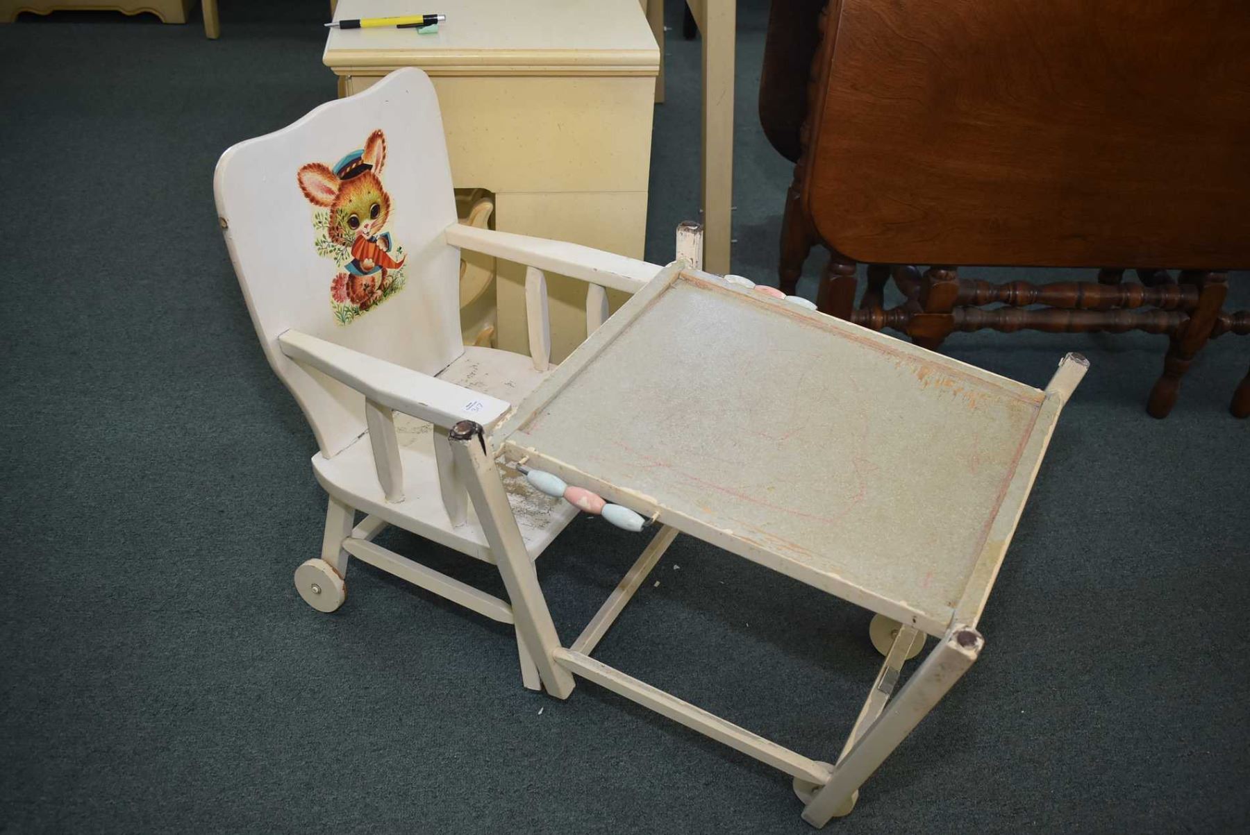 Convertible highchair/ play table with cute bunny litho, note missing eating tray FOR DOLL AND TEDDY BEAR USE ONLY PLEASE