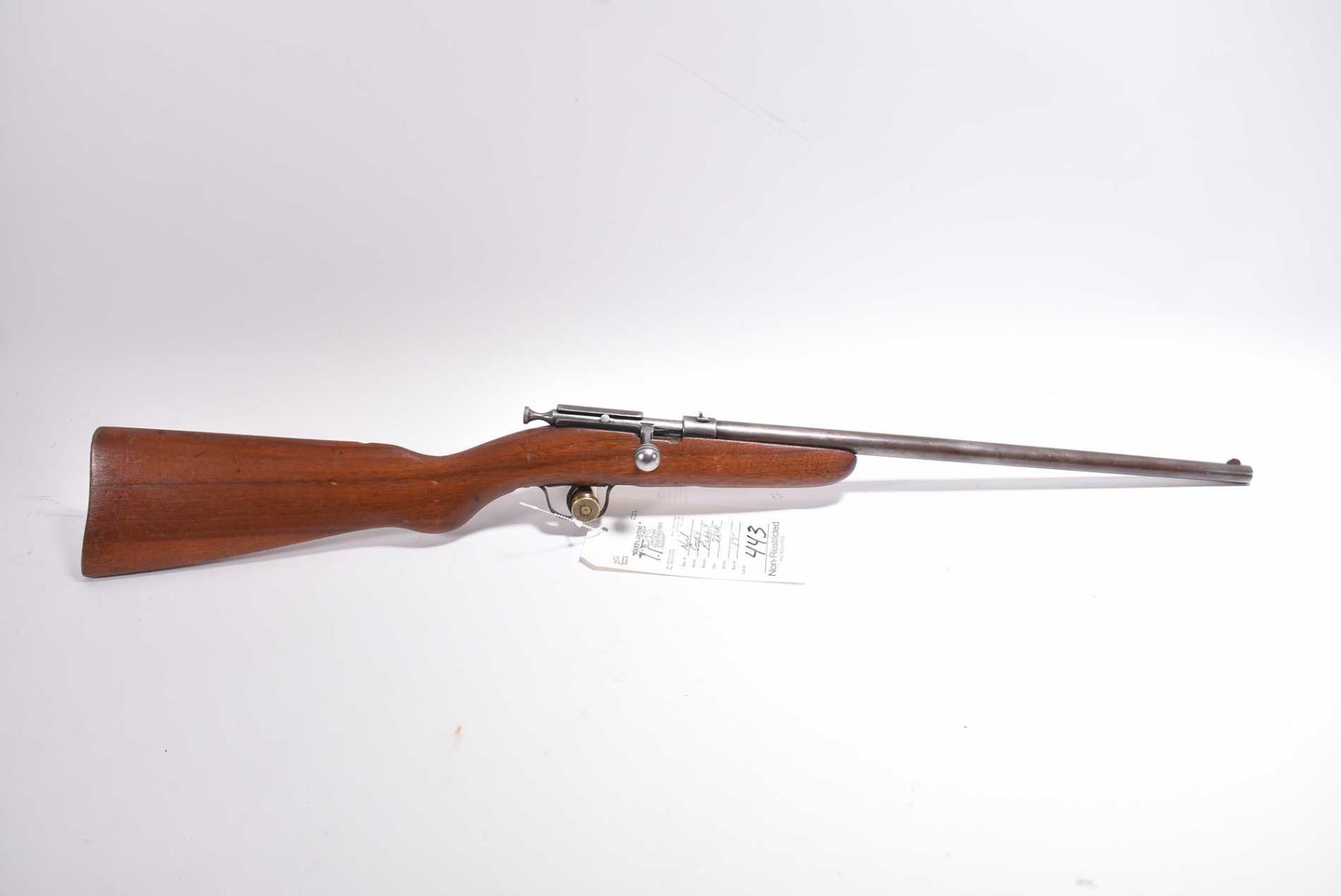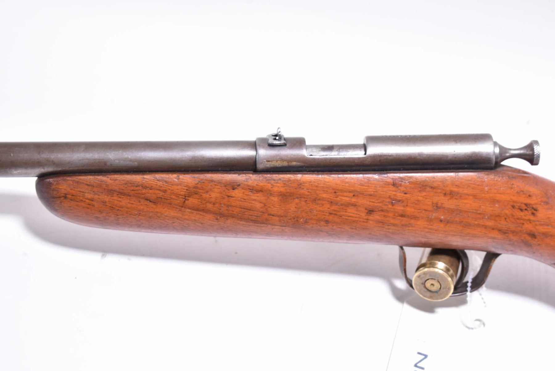 Cooey Model Rabbit .22 LR Cal Single Shot Boy's Rifle w/ 17" bbl [ blued finish faded to faded brown color, stock cracked on right side behind receiver, faint initials carved on right side of stock FMM ?, various marks and scratches to wood and metal ] Ser # Nil