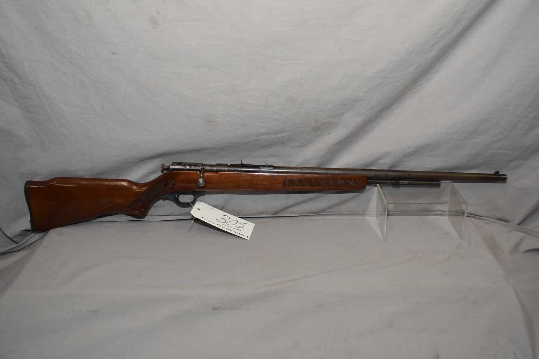 Cooey by Winchester Model 600 .22 LR Cal Tube Fed Bolt Action Rifle w/ 24" bbl [ fading blue finish with some pitting, mostly to receiver, barrel sights, receiver is also tapped for side mounted base, checkered Running Rabbit pistol grip stock, revarnished and cracked behind receiver, various marks and scratches to wood and metal, crack to plastic trigger guard by back screw ] Ser # Nil