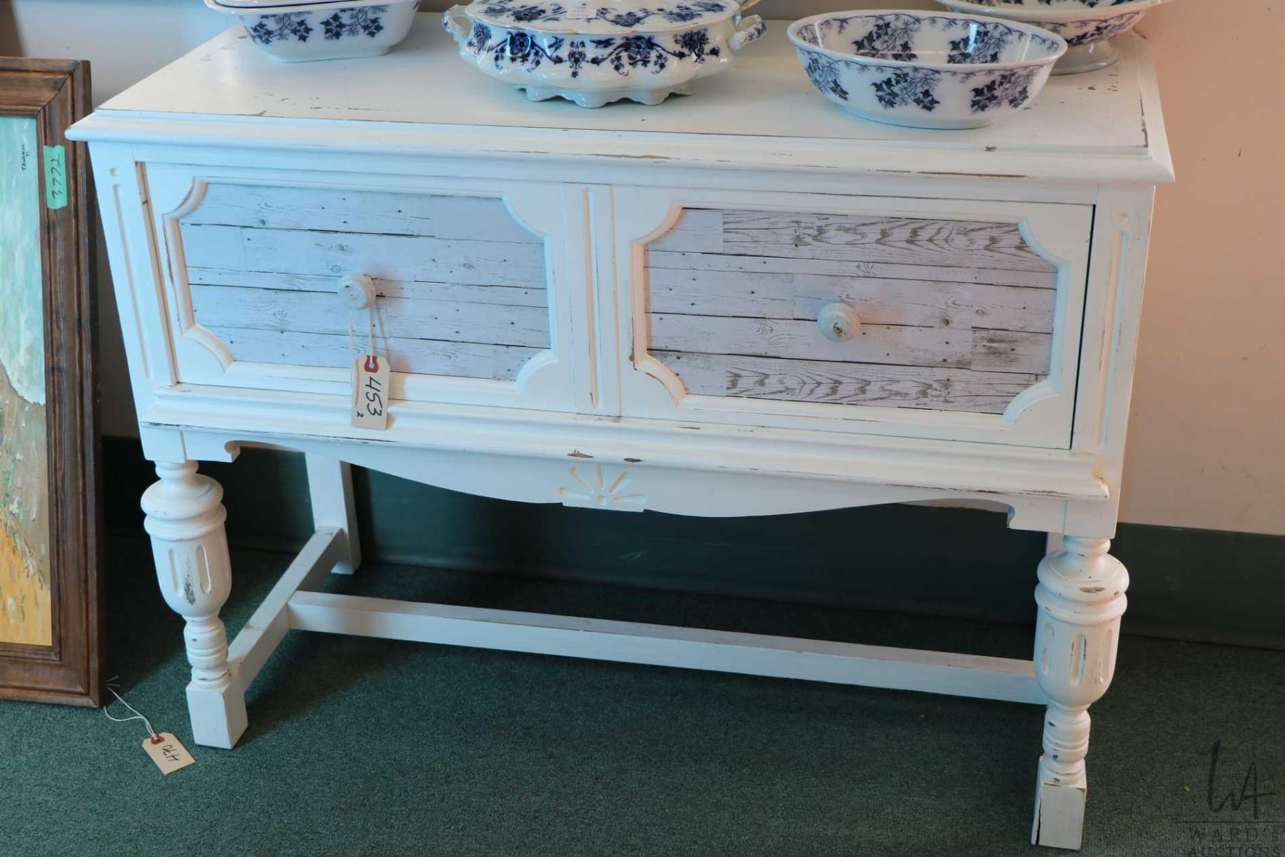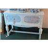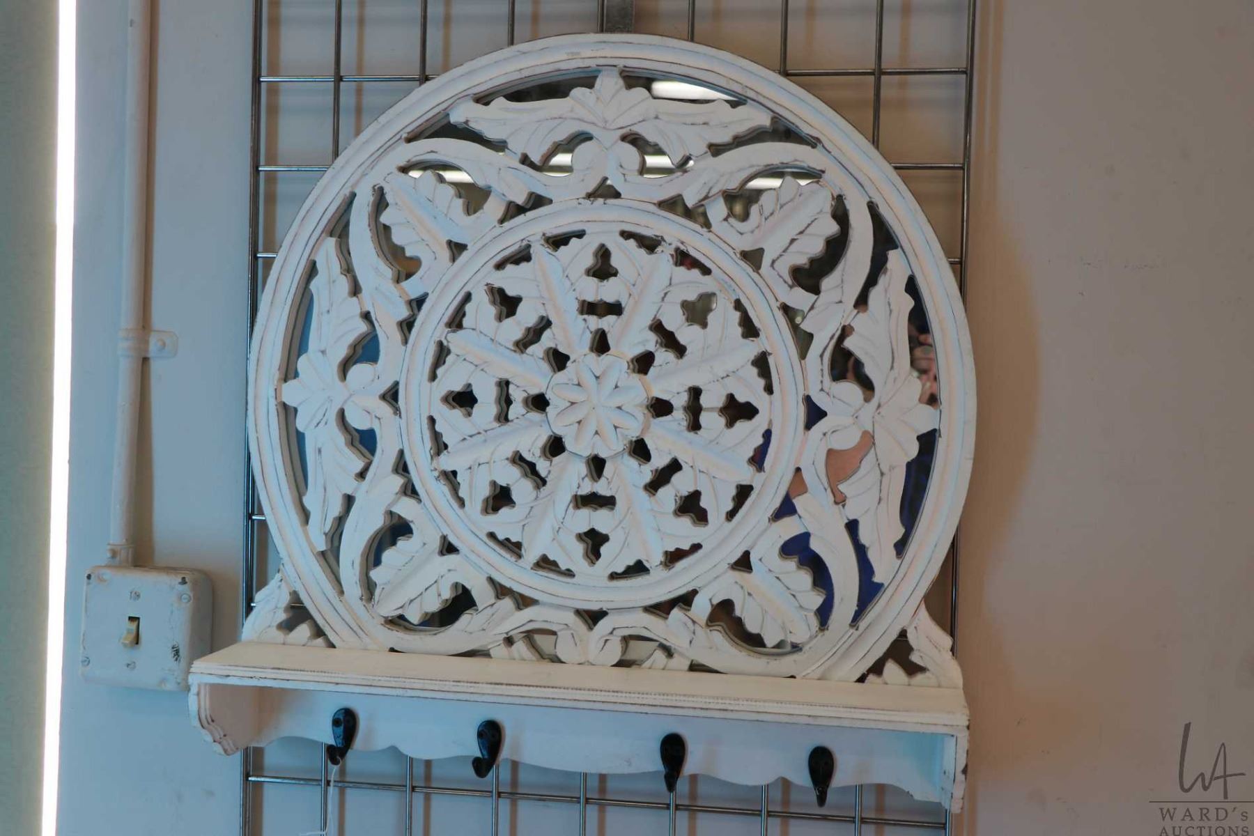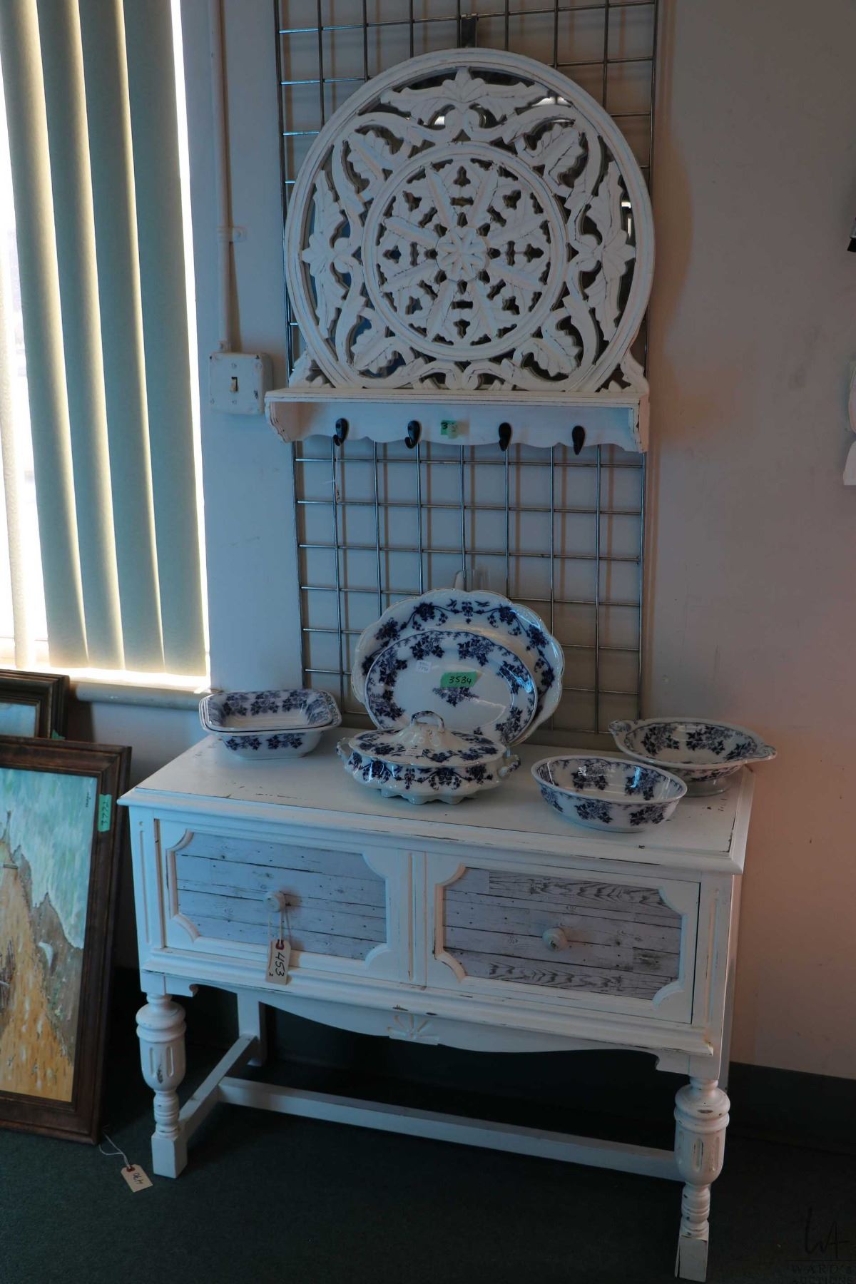 Country kitchen style single drawer console table and a wall hanging shelf with coat hooks and mirrored fret work back