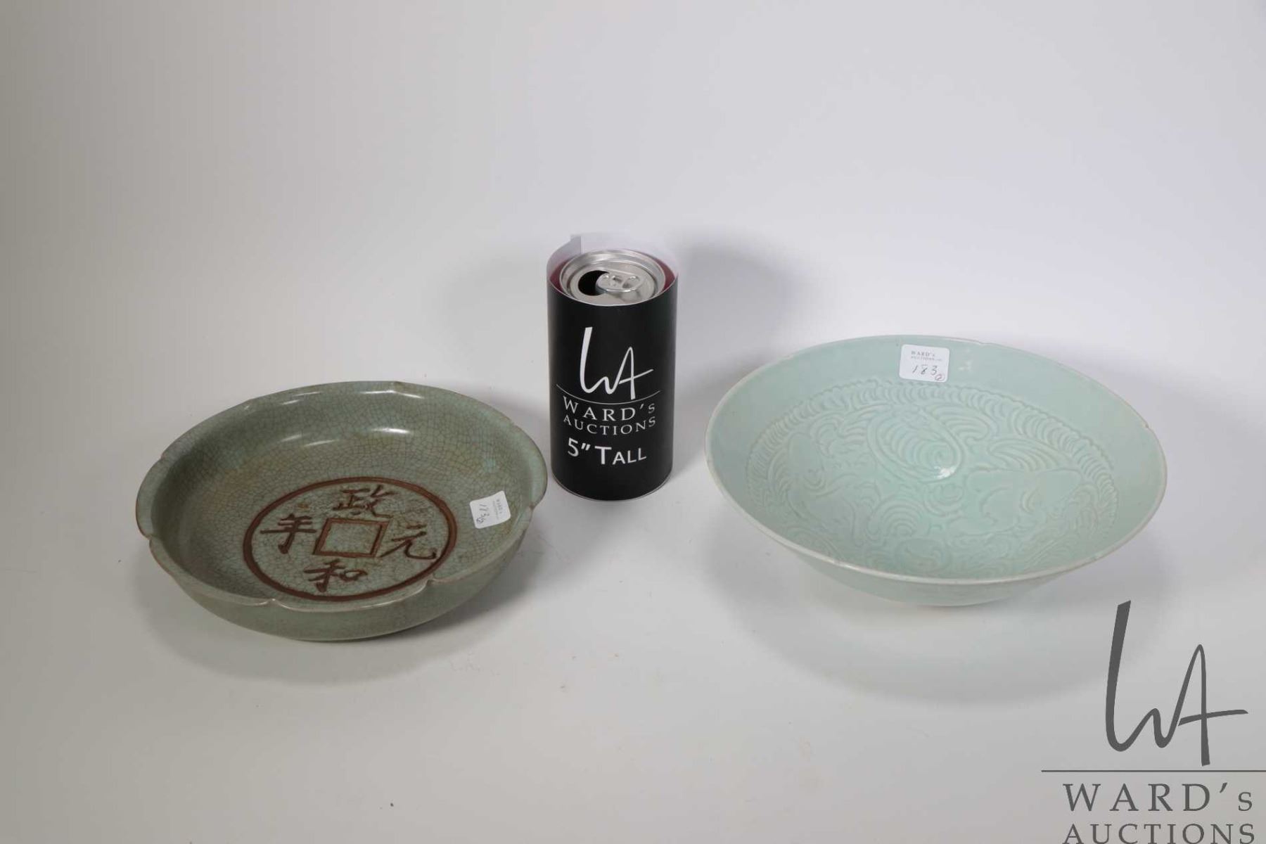 Creamy white glazed "Fertility" bowl, purportedly 18th century 8 3/4" in diameter and a foliate rim celadon calligraphy plate, purportedly 19th century, 8" in diameter