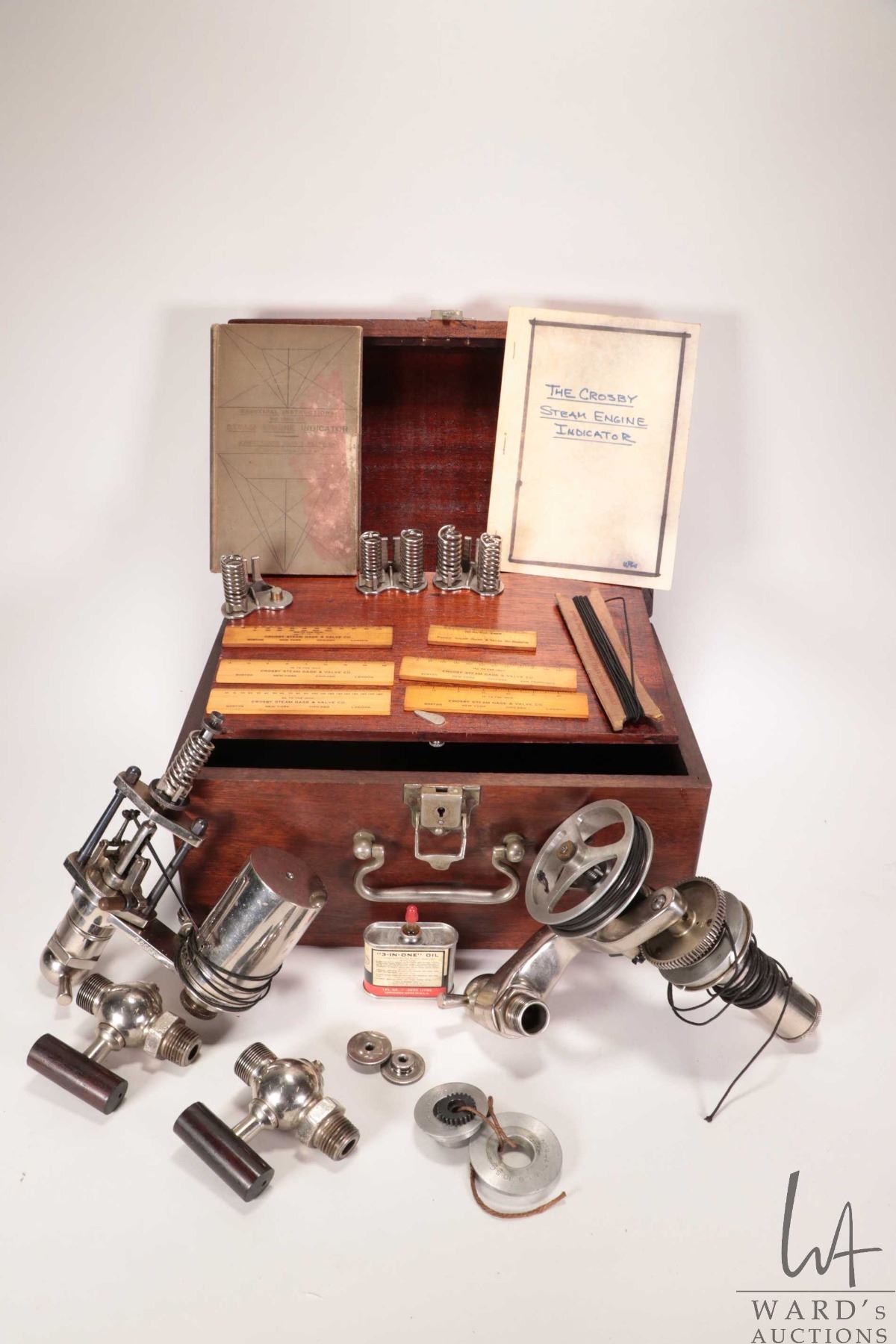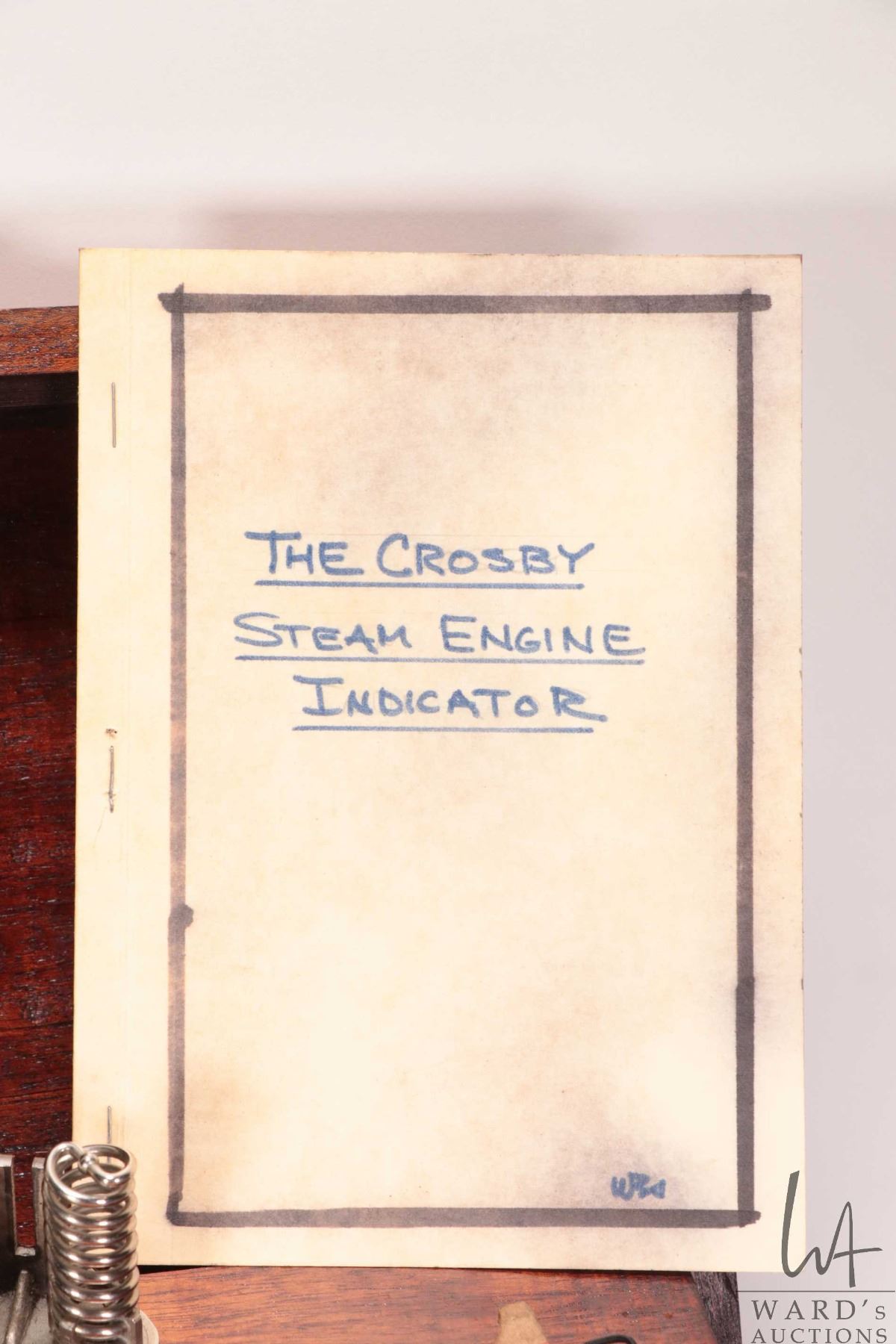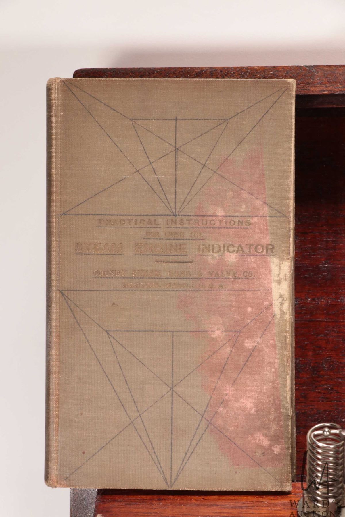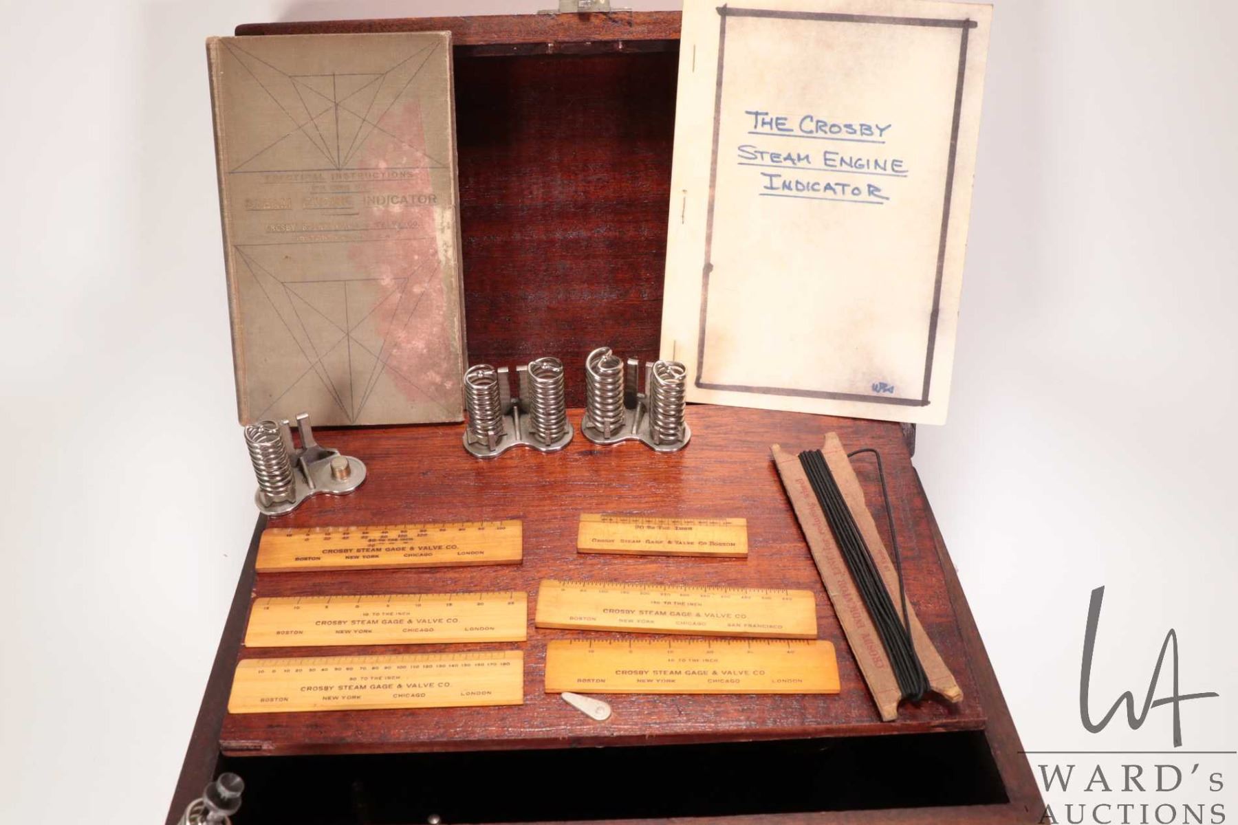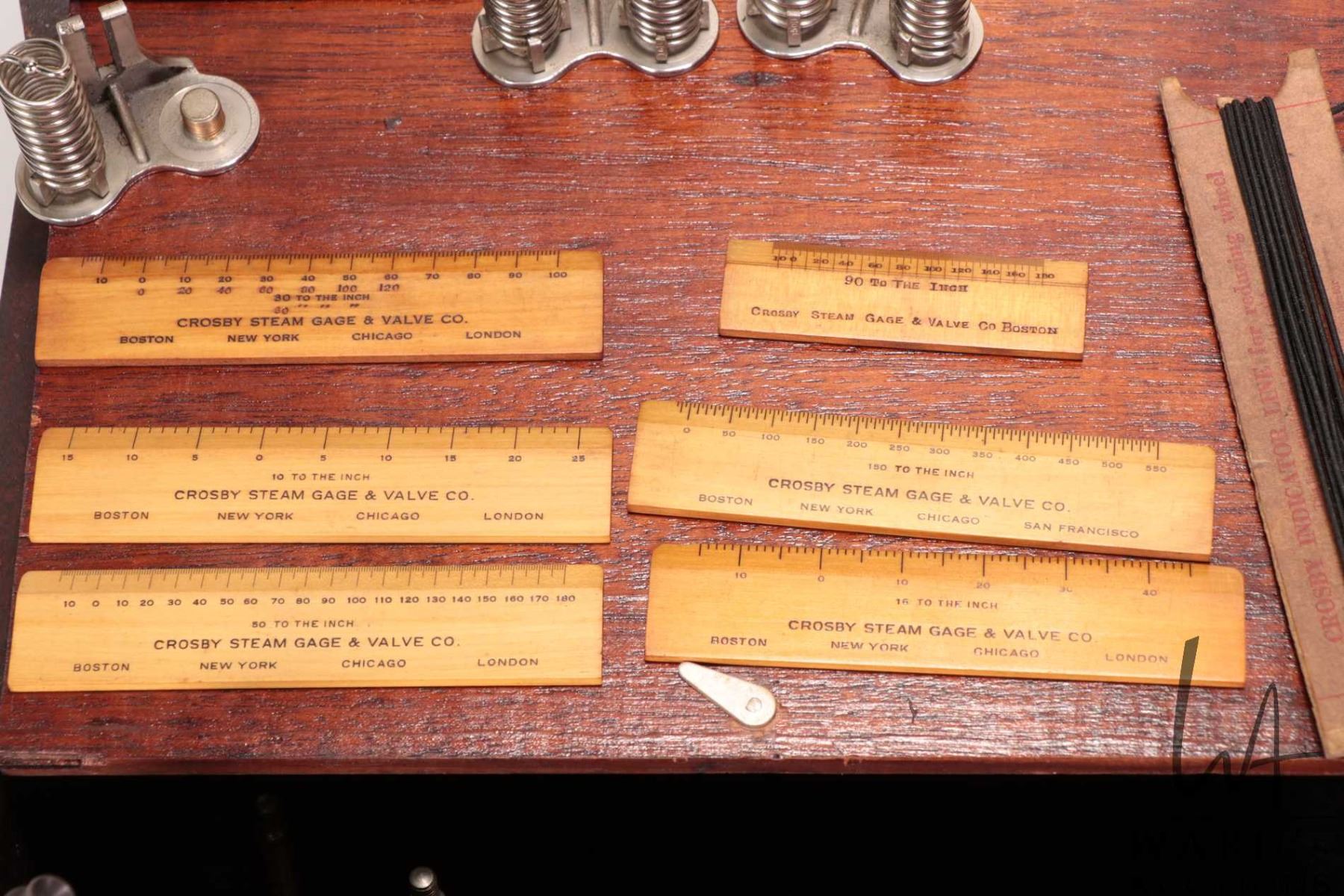 Crosby Steam Gage& Valve Co. Steam Engine Indicator in fitted mahogany box 12 1/2" L X 8 1/2" W X 7 1/4" D, includes hardcover manual and recovered soft manual and a selection of gauge rulers