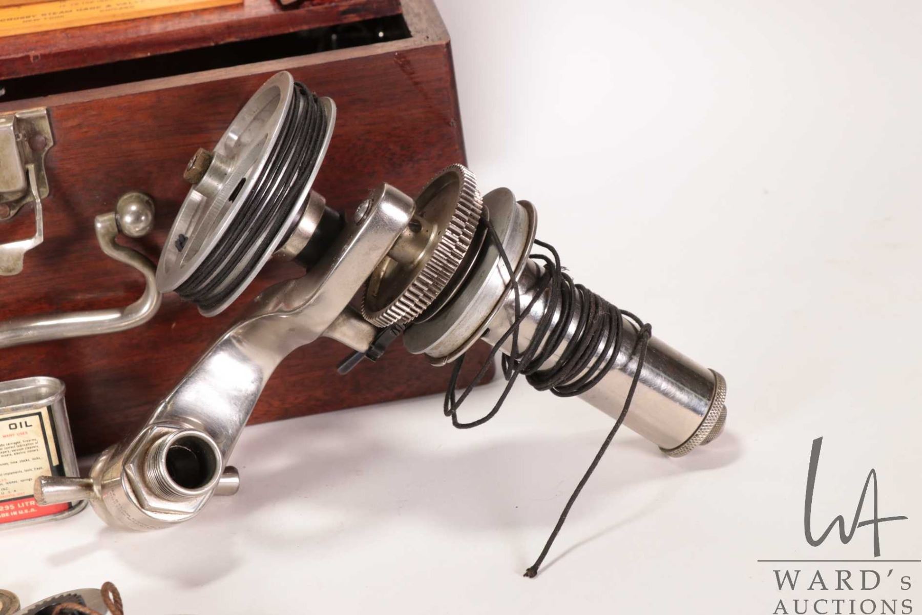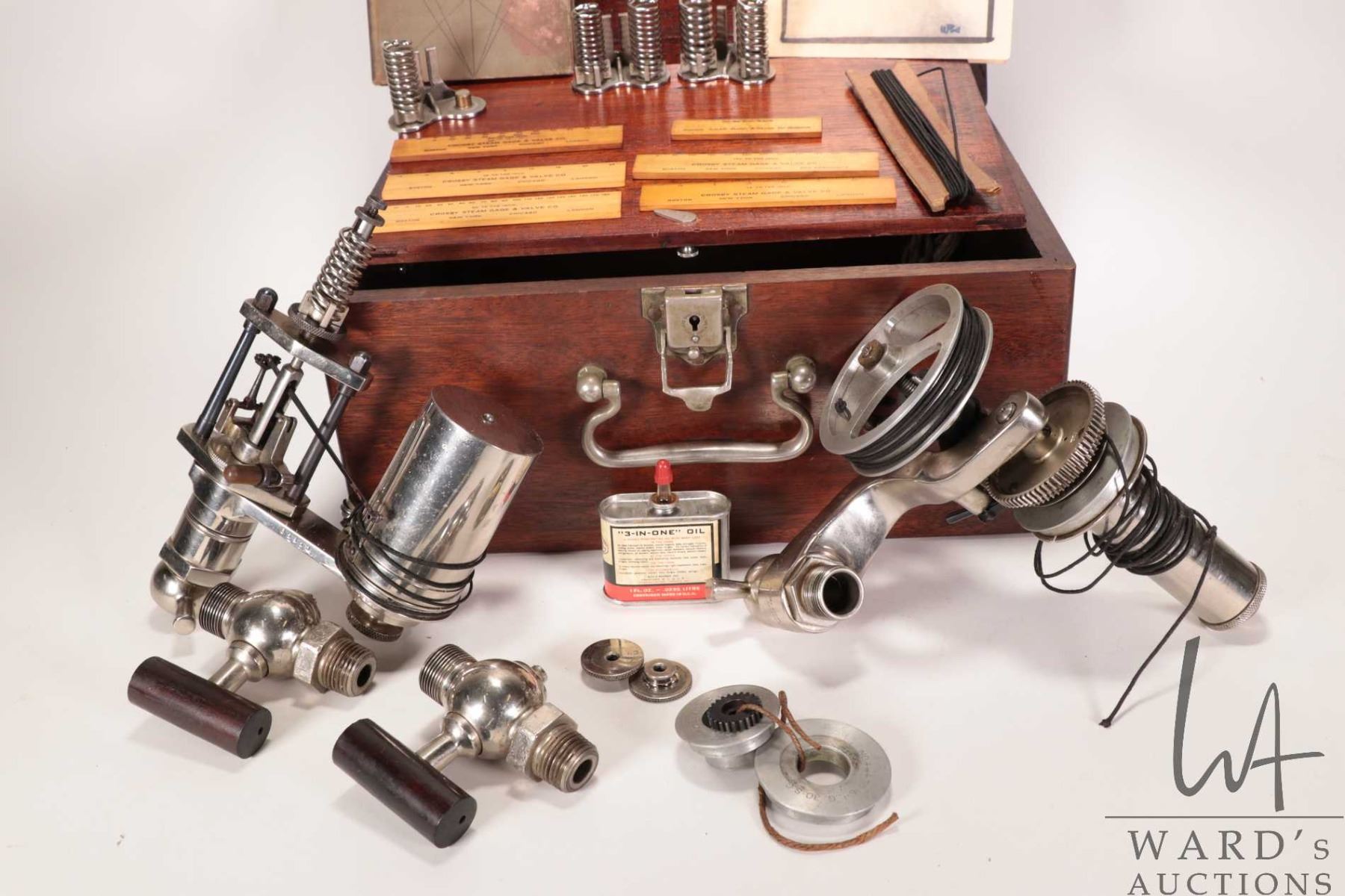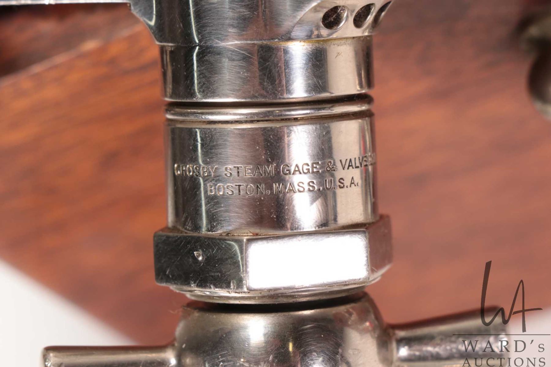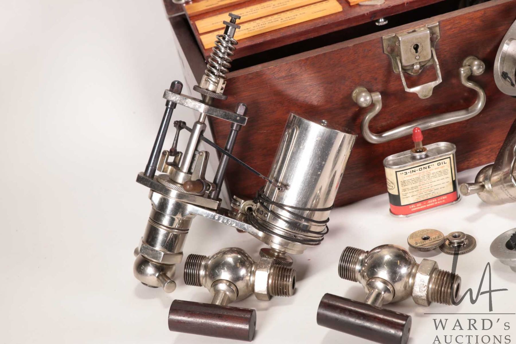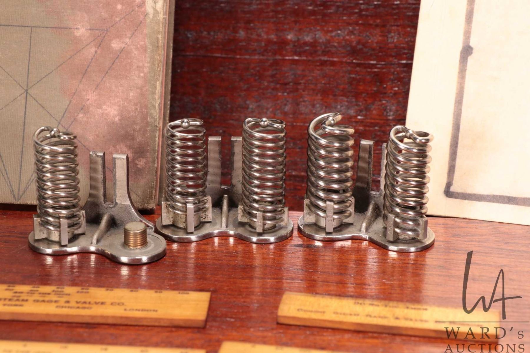 Crosby Steam Gage& Valve Co. Steam Engine Indicator in fitted mahogany box 12 1/2" L X 8 1/2" W X 7 1/4" D, includes hardcover manual and recovered soft manual and a selection of gauge rulers