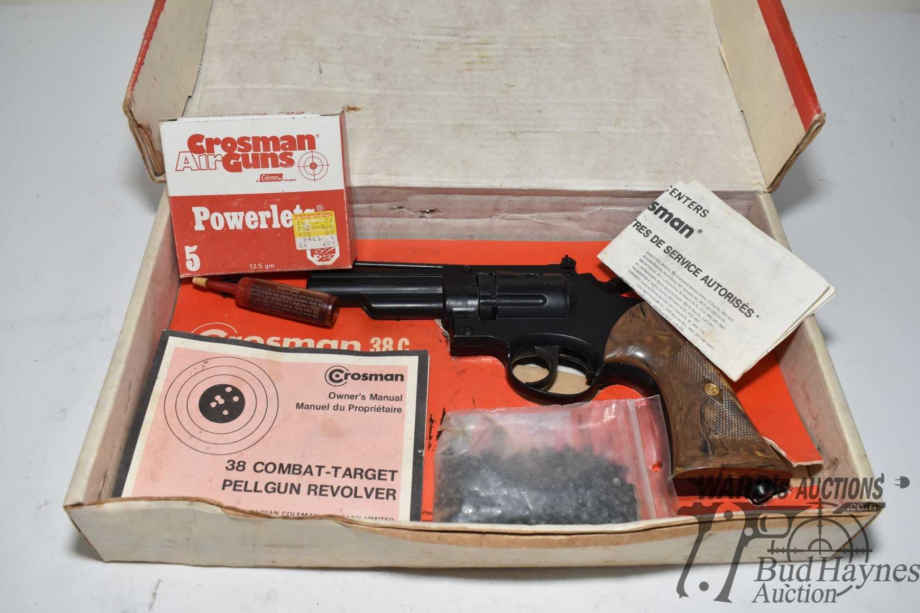Crosman 38 combat-target pellgun revolver w/ original box, manual, pellets and CO2 cartridge. Plus a