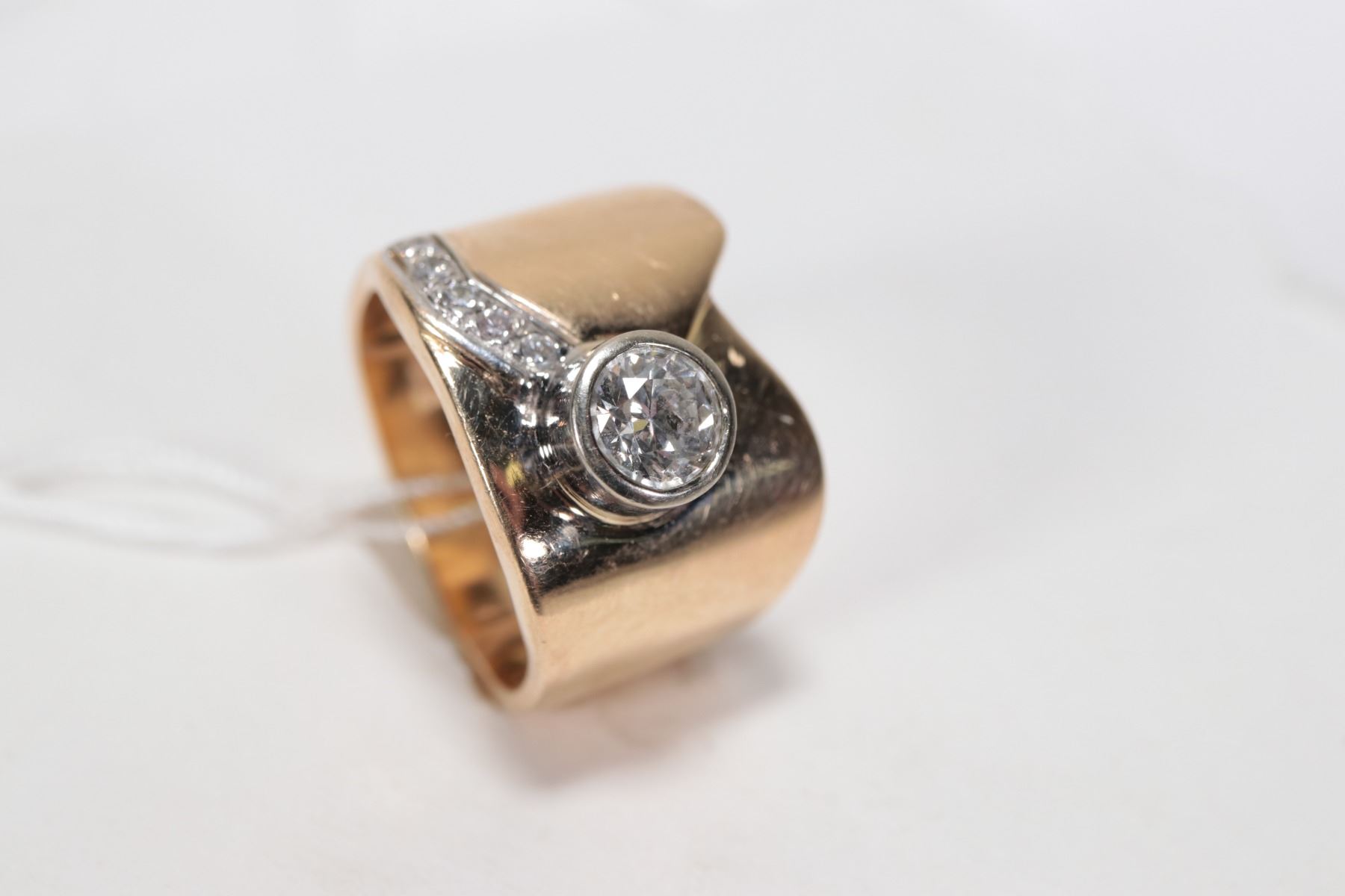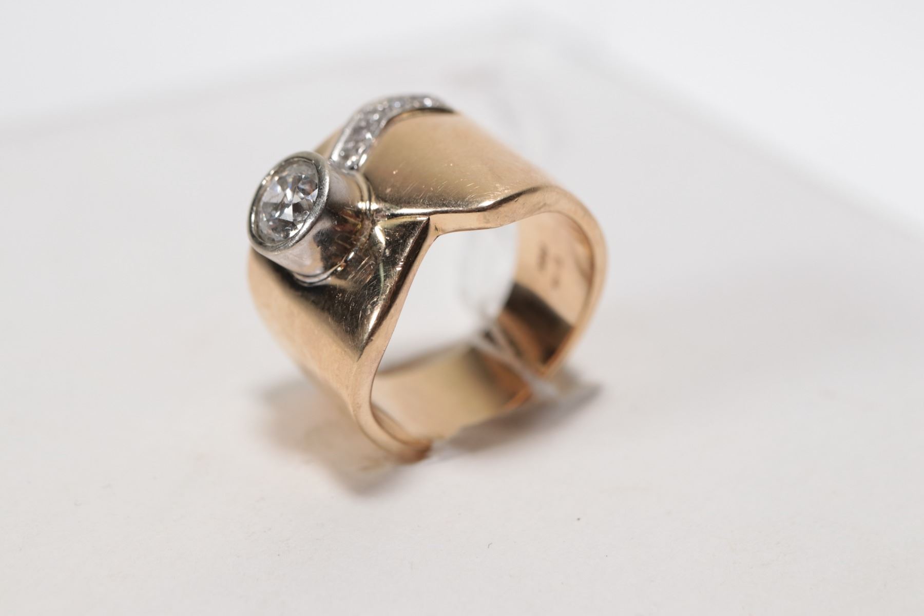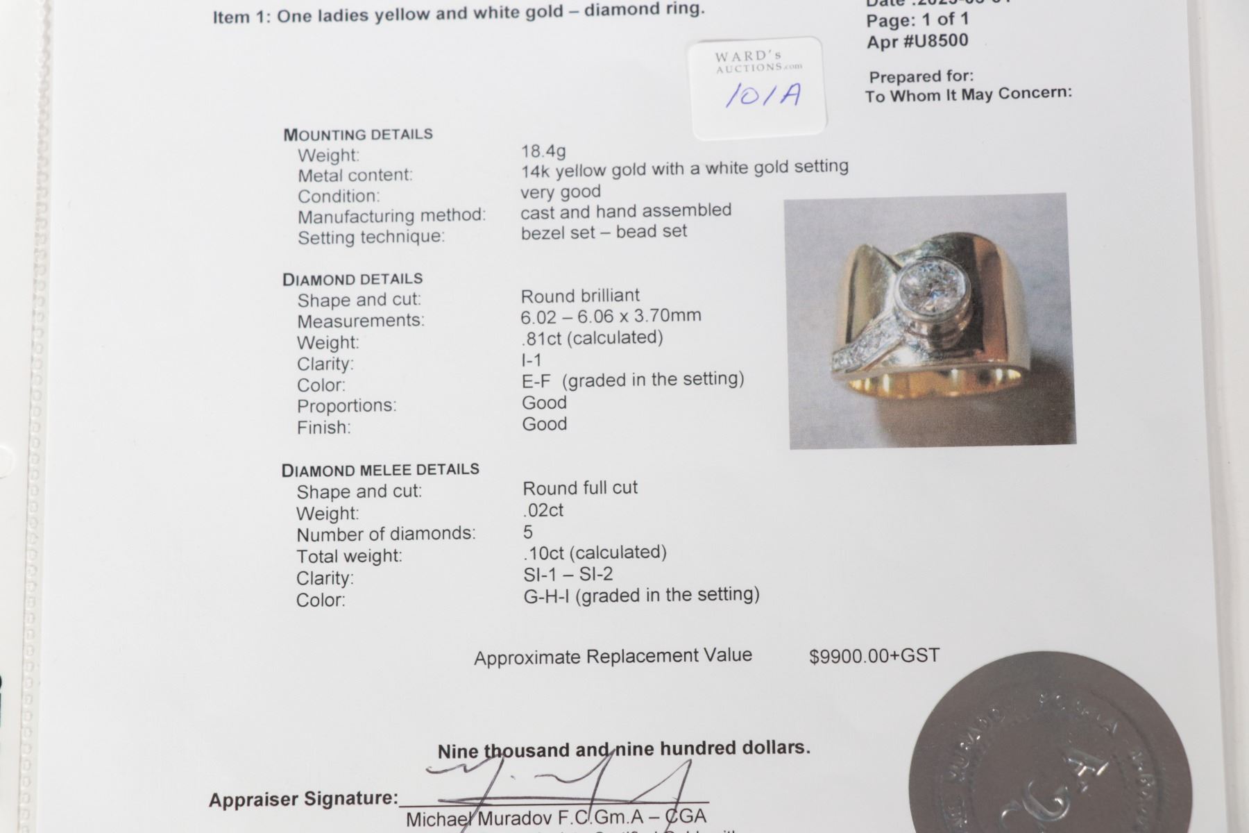 Custom made 14kt yellow gold and diamond gemstone ring. Set with center .81ct brilliant cut white diamond and .10ct of round full cut accent diamonds. Sized 8.5. Retail replacement value $9900.00