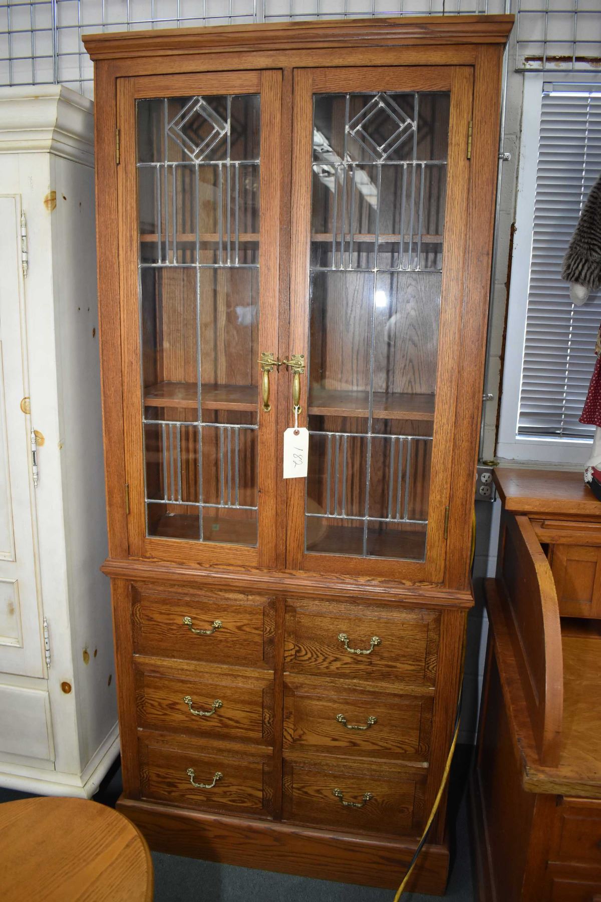 Custom made oak cabinet with double leaded glazed door upper section and six drawers in base, 86" in height