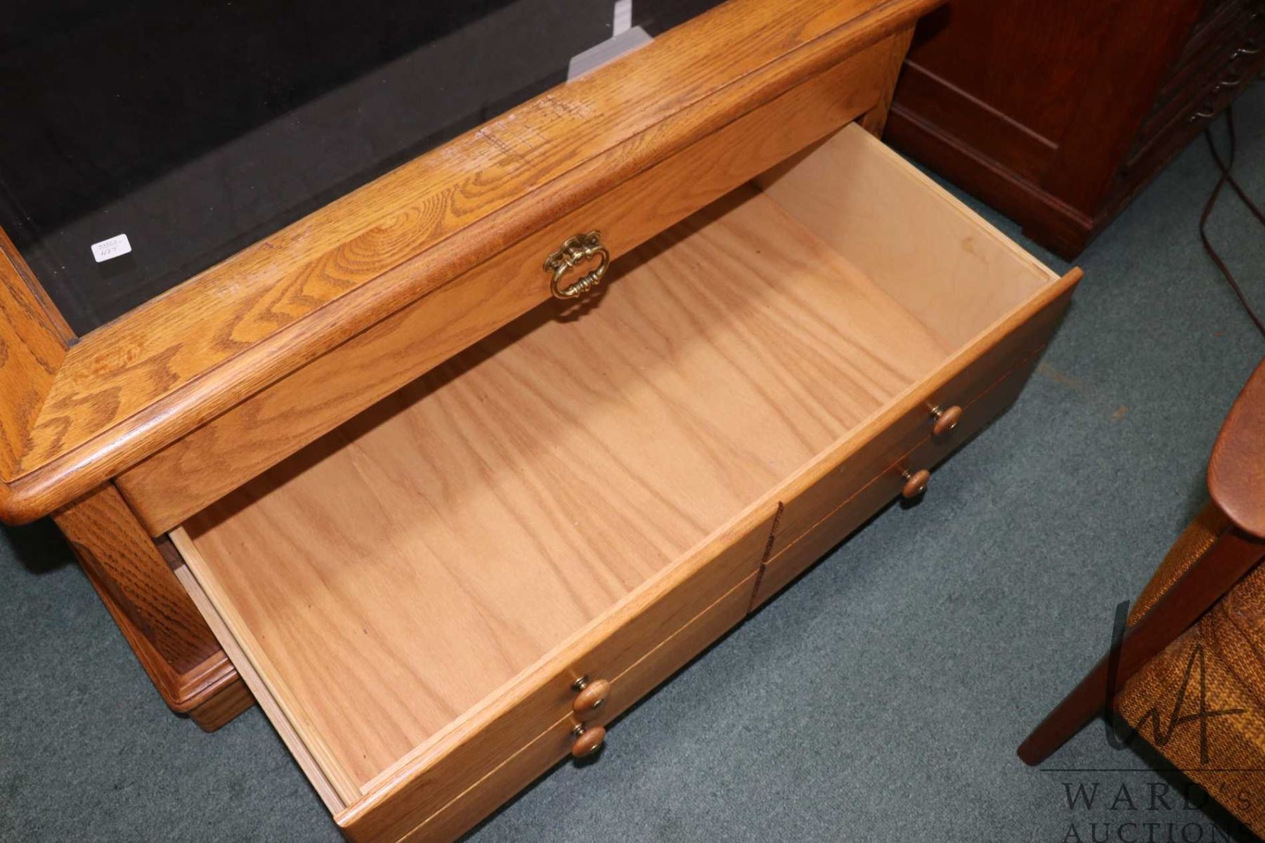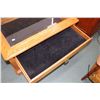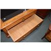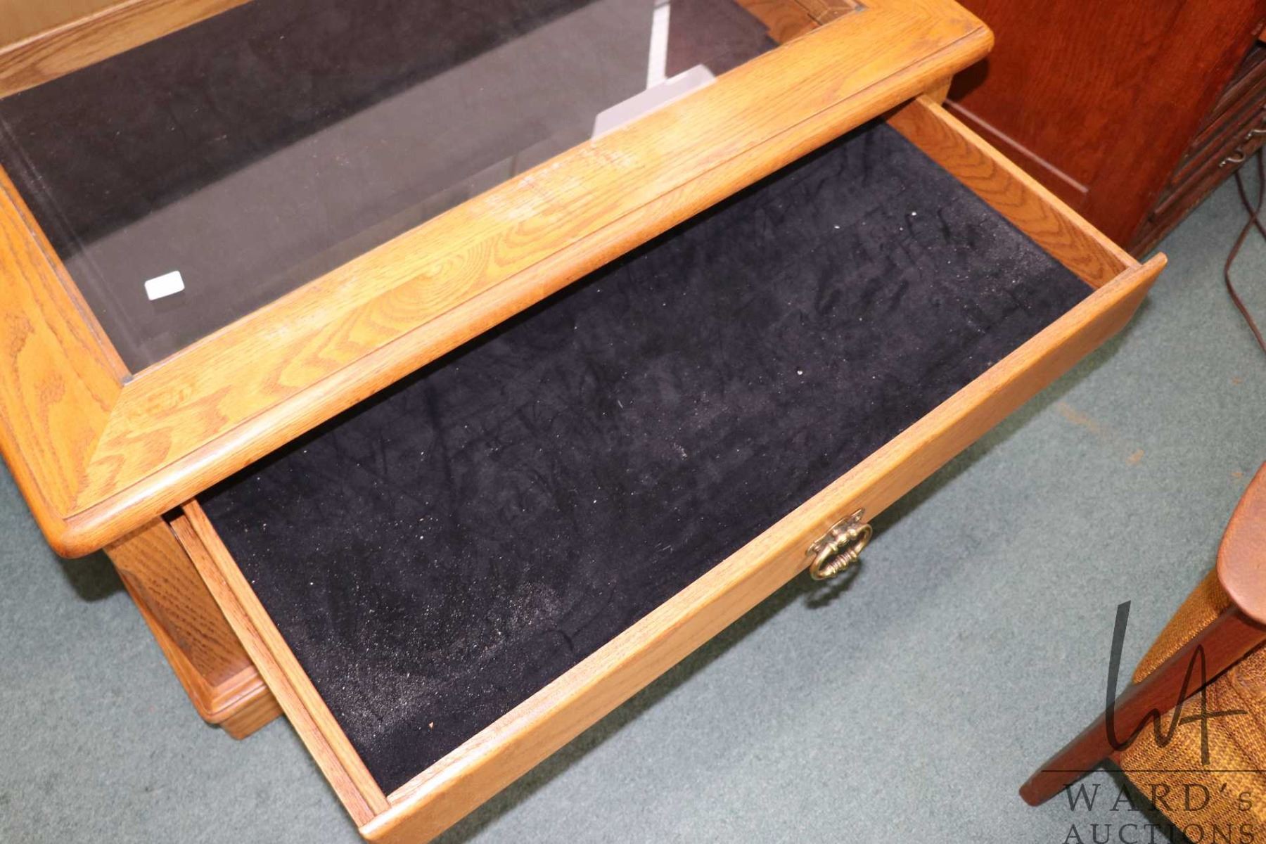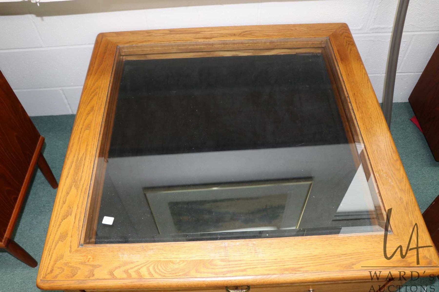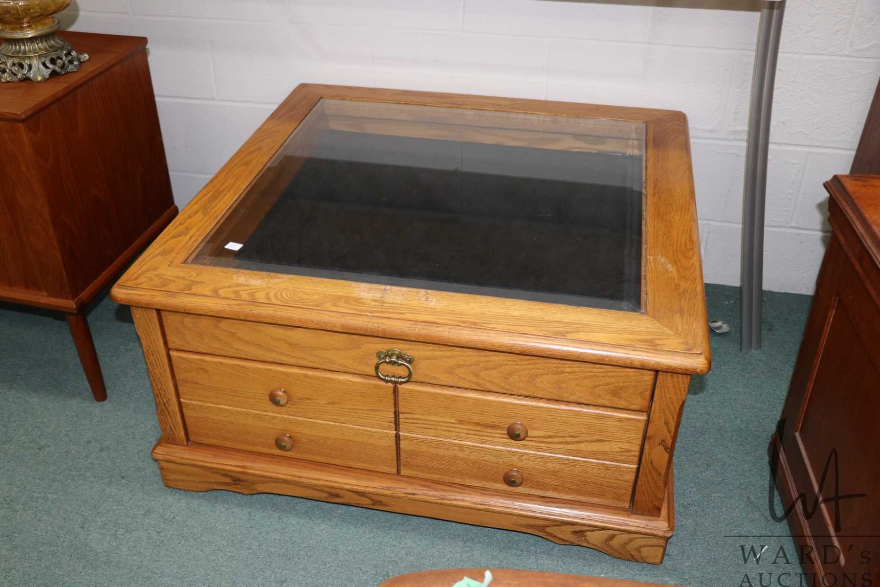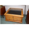 Custom made oak display coffee table with one pull out storage drawer and top pull out display drawer, fitted with beveled glass top, 18" X 36" square