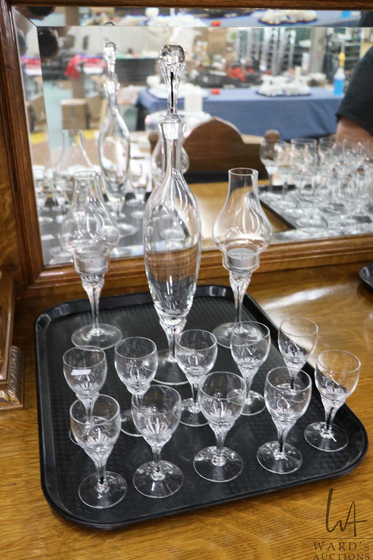 Czechslovakian Belfor Belfor "Exquisite" crystal decanter with ten glasses and a pair of matching candlestick with hurricanes. NOTE: This item is not available for shipping. Local pickup only
