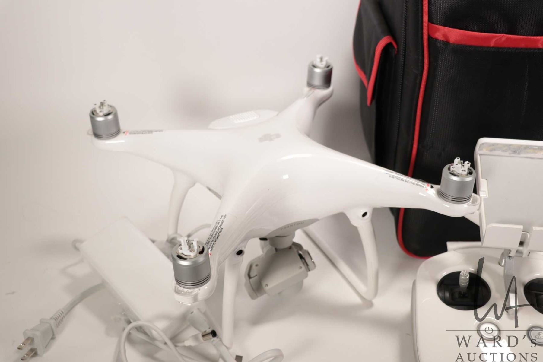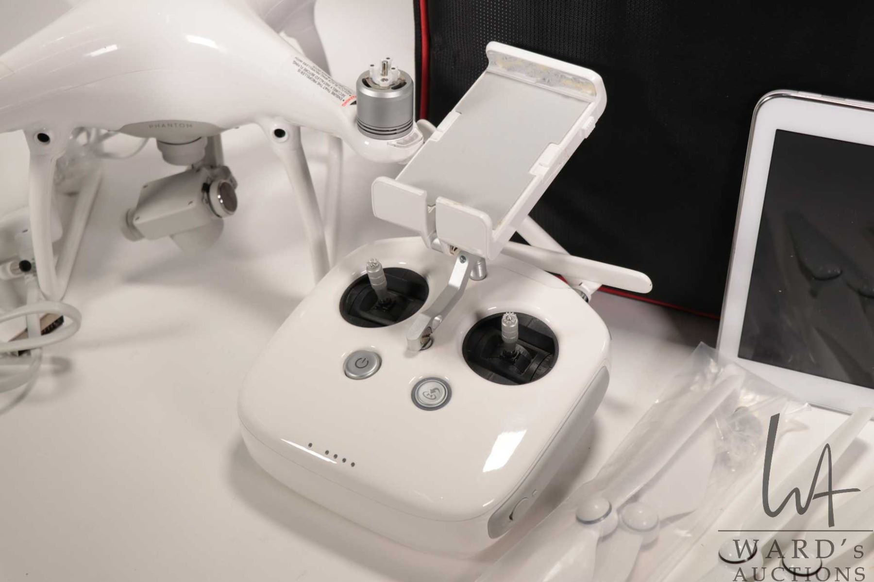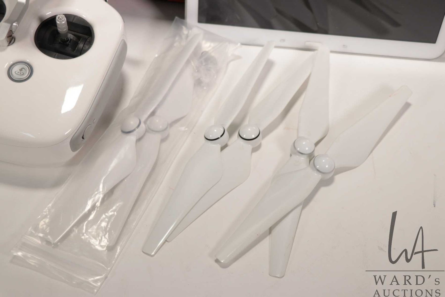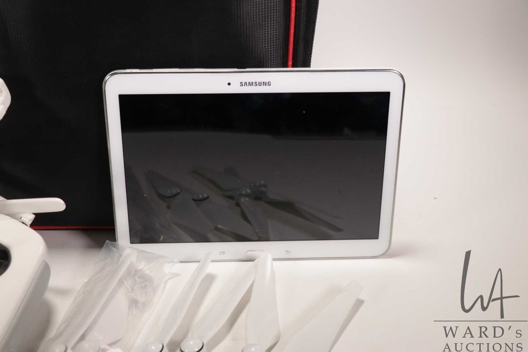 DJI Phantom 4 drone, complete with two batteries, charge cable, remote control with strap, full set of propellers plus back up, SD card, Samsung Galaxy TAB 4 tablet with carry case, working at time of cataloguing