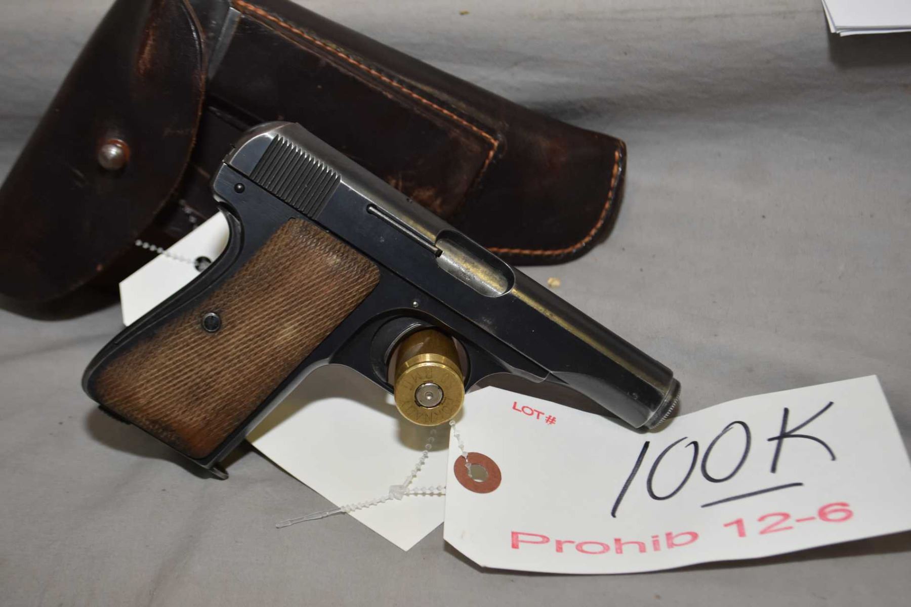 DWM Model 22 7.65 MM Cal 7 Shot Semi Auto Pistol w/ 88 mm bbl [ blued finish with some slight holster wear, checkered wooden grips, Rarest of all the DWM manufactured pistols, Issued as a gift to Military and Police personell of the German Weimar Republic as a token of appreciation for selecting DWM P08 Lugers as official armed sidearms, Circa early 1920's. A man will travel a long way before encountering another pistol such as this example manufactured by DWM, comes complete with high quality German manufactured holster and extra magazine, beautiful example of DWM patronage and not many produced as evident by serial number 173A, Grip Safety & Slide Lock Lazy Crown N Proofs ] Ser # 173A Prohib 12 - 6 Cert # 12846622 FRT # 23859 - 1 EXPECT DELAYS IN TRANSFER